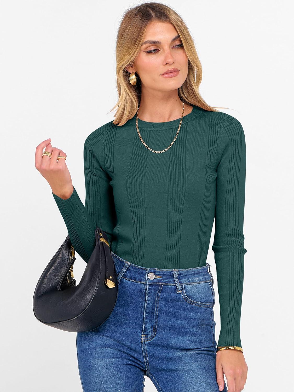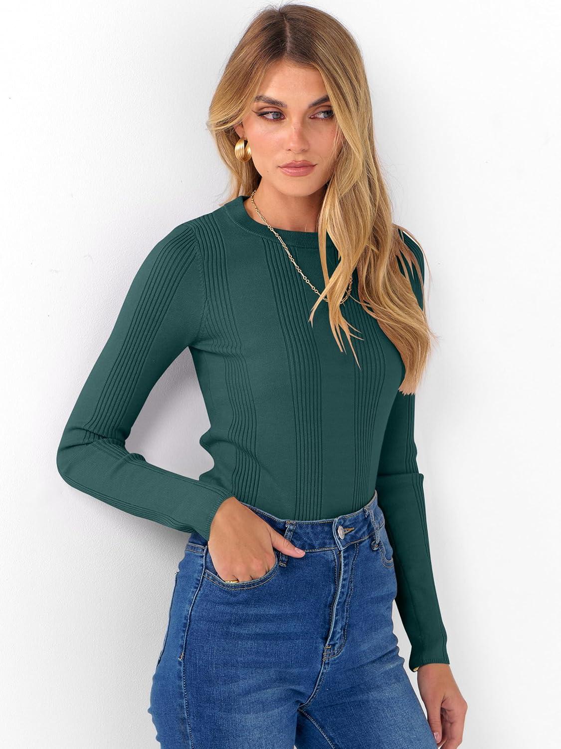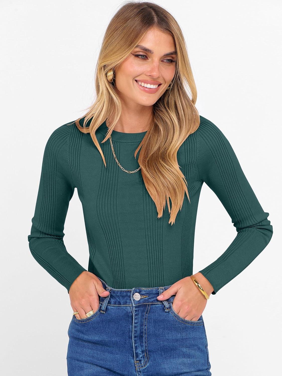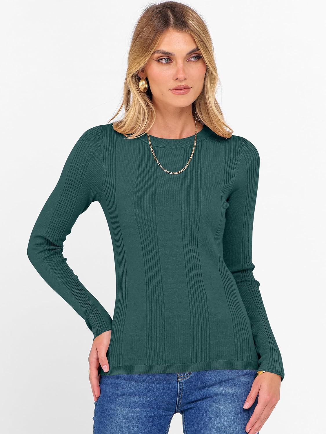 ANRABESS Women’s Long Sleeve Slim Fit Crewneck Lightweight Sweaters 2025 Fall Winter Basic Fitted Rib Knit Pullover Tops(Dark Green)