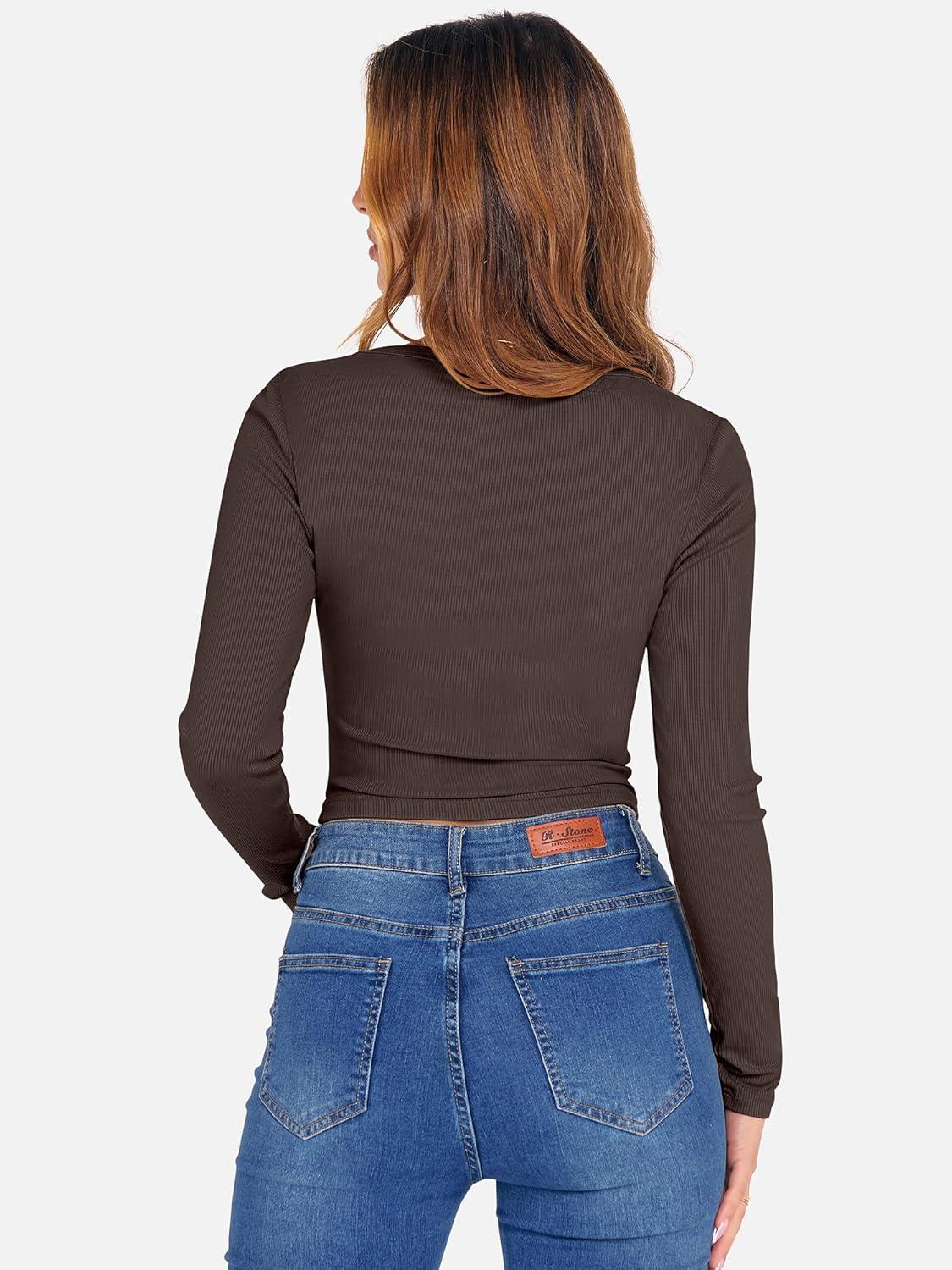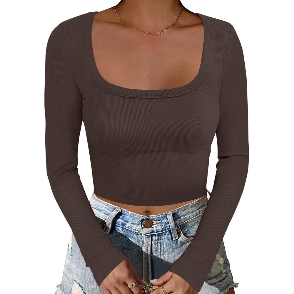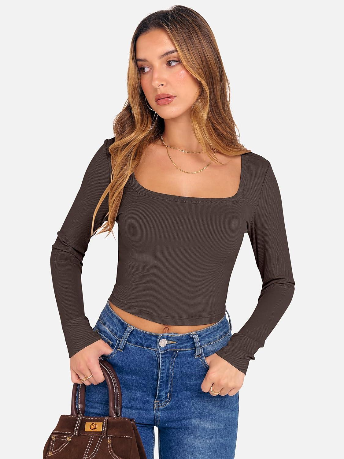 ANRABESS Women's Long Sleeve Square Neck Crop Top Ribbed Slim Fitted Basic Tee Layer Y2K Shirts Fall Fashion Outfits 2025(Coffee)