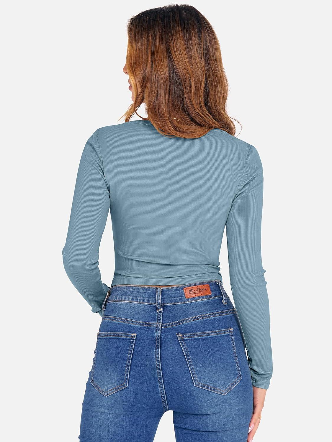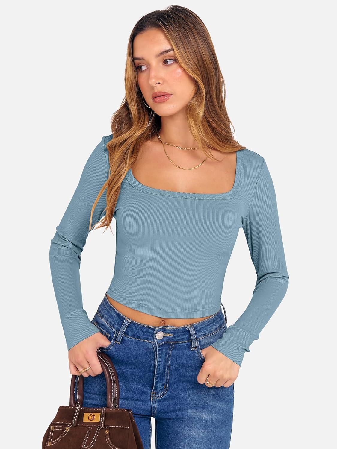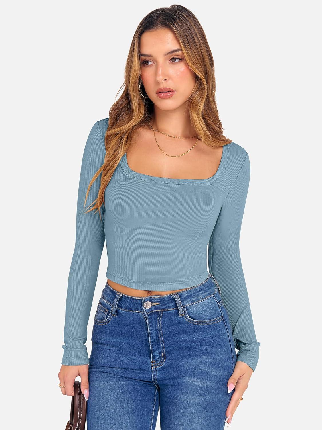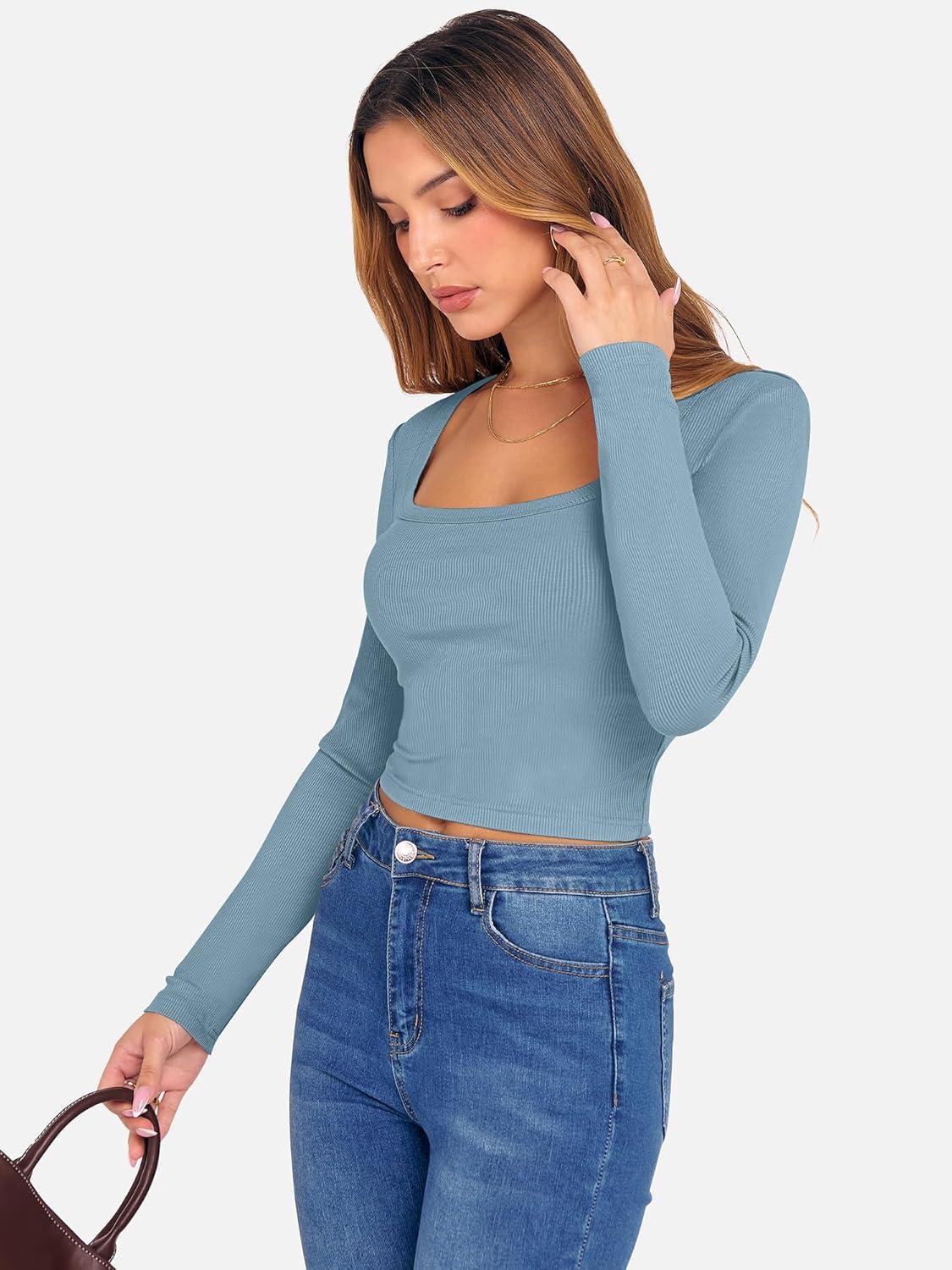 ANRABESS Women's Long Sleeve Square Neck Crop Top Ribbed Slim Fitted Basic Tee Layer Y2K Shirts Fall Fashion Outfits 2025(Grey Blue)