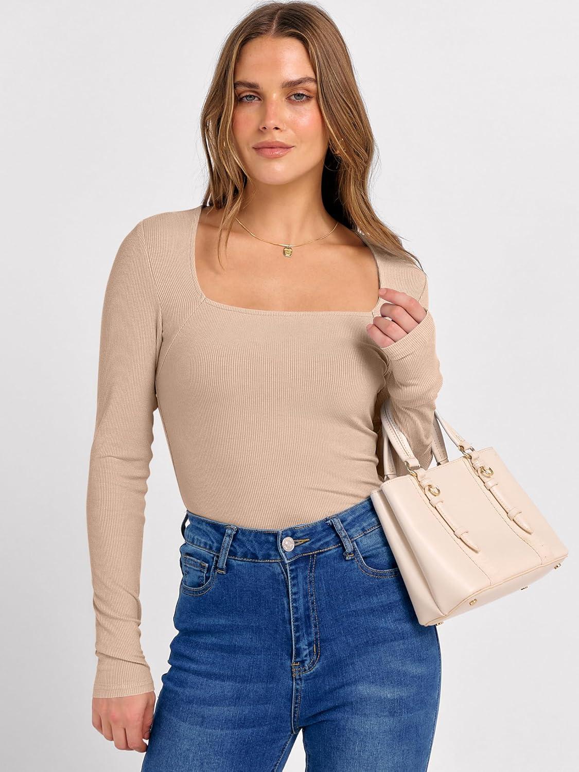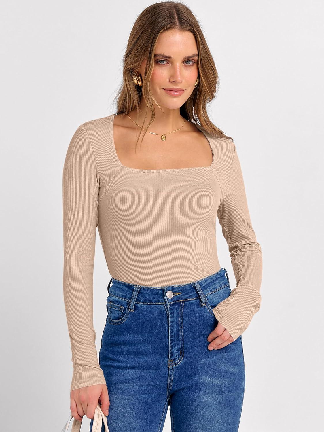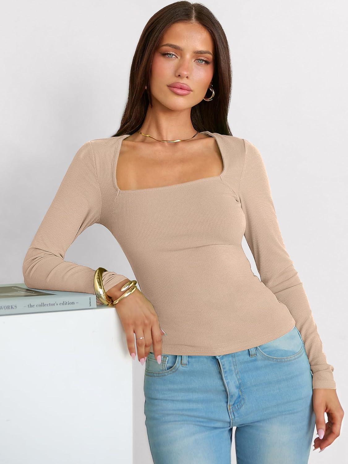 ANRABESS Womens Long Sleeve Square Neck Tops Ribbed Knit Slim Fit Shirts Basic Tee 2025 Fall Dressy Casual T-Shirts Clothes(Light Camel)