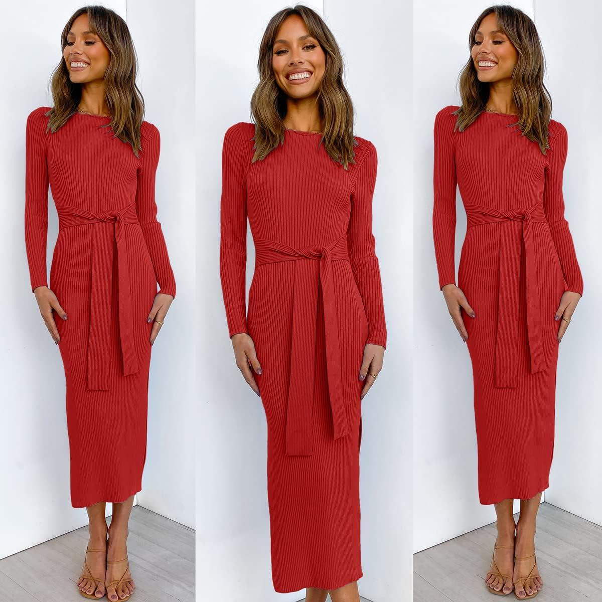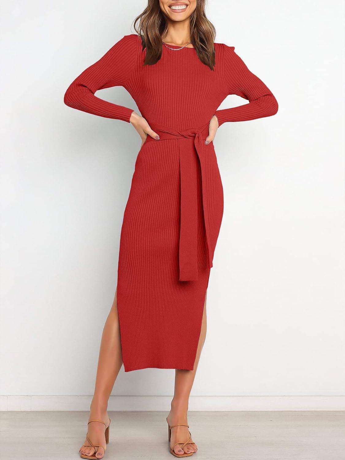 ANRABESS Womens Long Sleeve Sweater Dress Crew Neck Slim Fit Slit Tie Waist 2025 Ribbed Knit Bodycon Midi Dress Fall Outfits(Red)