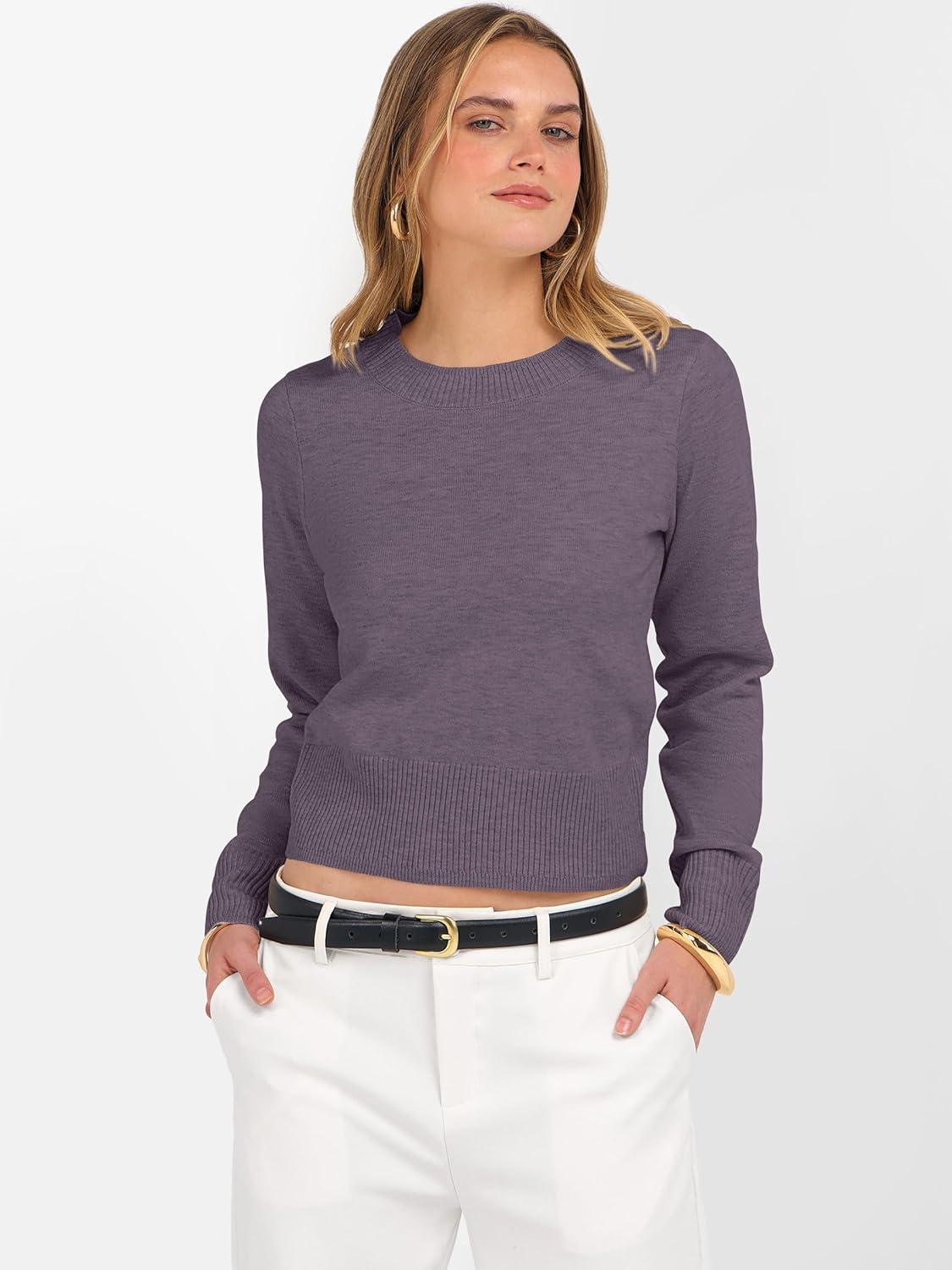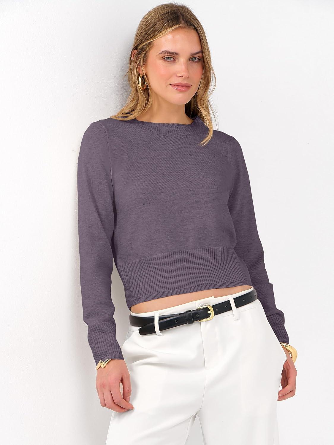 ANRABESS Women’s Long Sleeve Sweaters Cropped Crew Neck Business Casual Light Weight Sweater Tops Fall Fashion Clothes 2025(Deep Purple)