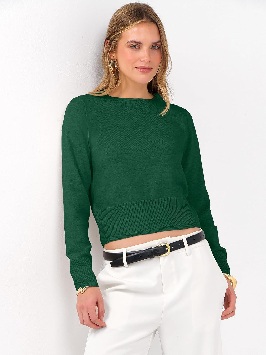 ANRABESS Women’s Long Sleeve Sweaters Cropped Crew Neck Business Casual Light Weight Sweater Tops Fall Fashion Clothes 2025(Forest Deep Green)