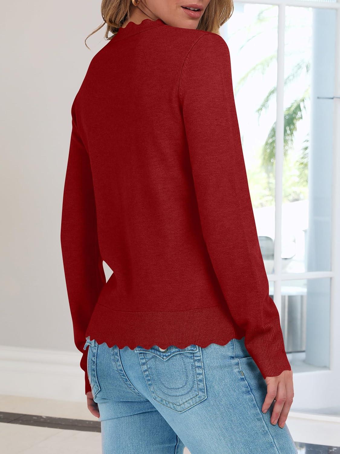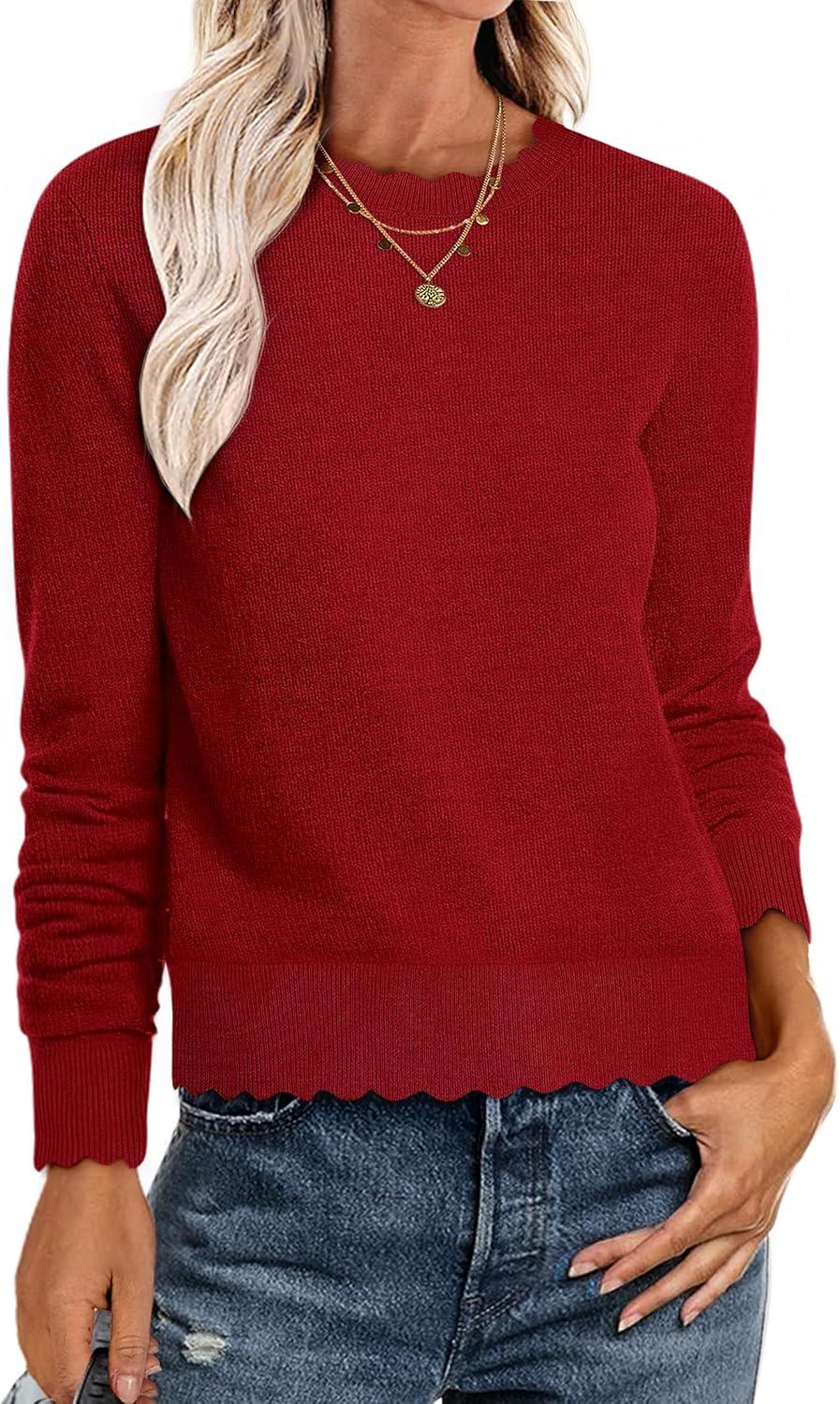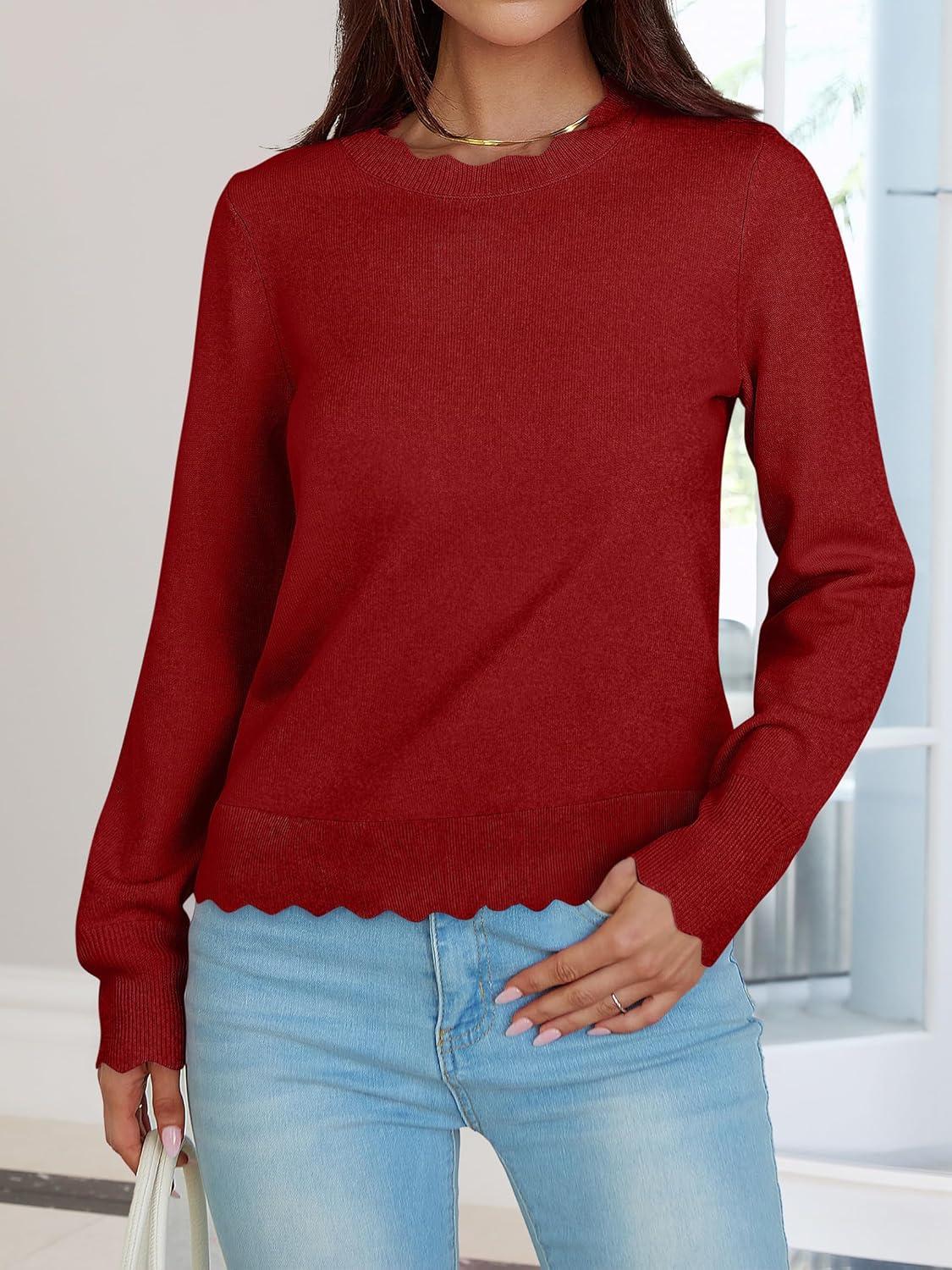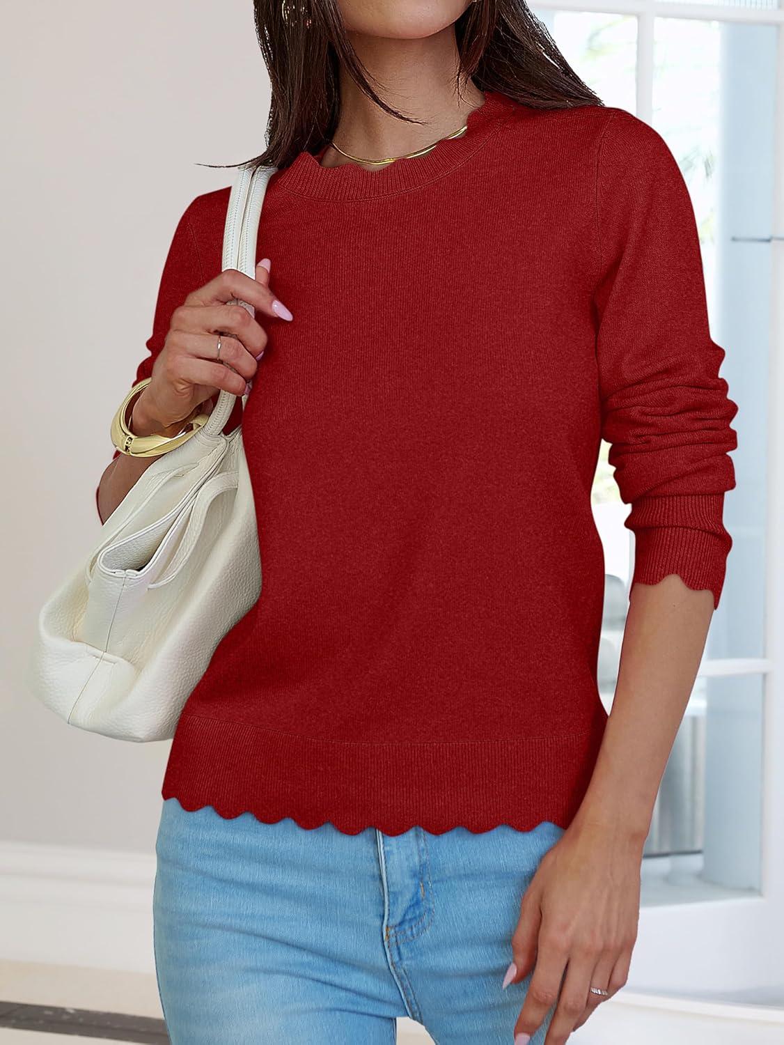 ANRABESS Womens Long Sleeve Sweaters Loose Fit Lightweight Scalloped Knit Soft Dressy Pullover Tops 2025 Fall Casual Outfits(Red)