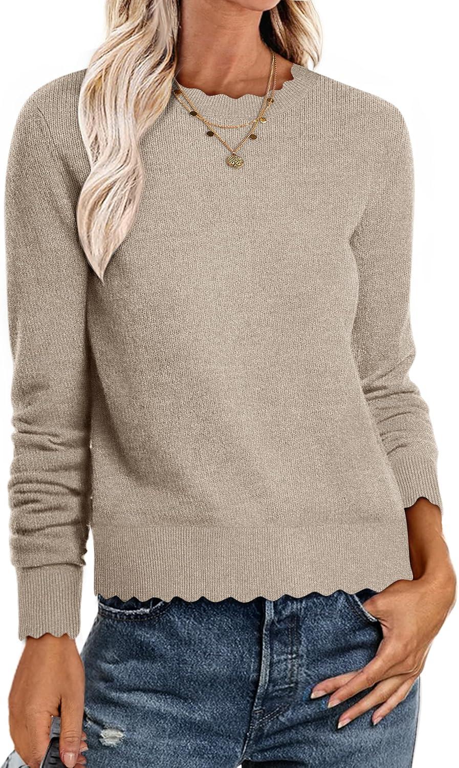 ANRABESS Womens Long Sleeve Sweaters Loose Fit Lightweight Scalloped Knit Soft Dressy Pullover Tops 2025 Fall Casual Outfits(Tan)