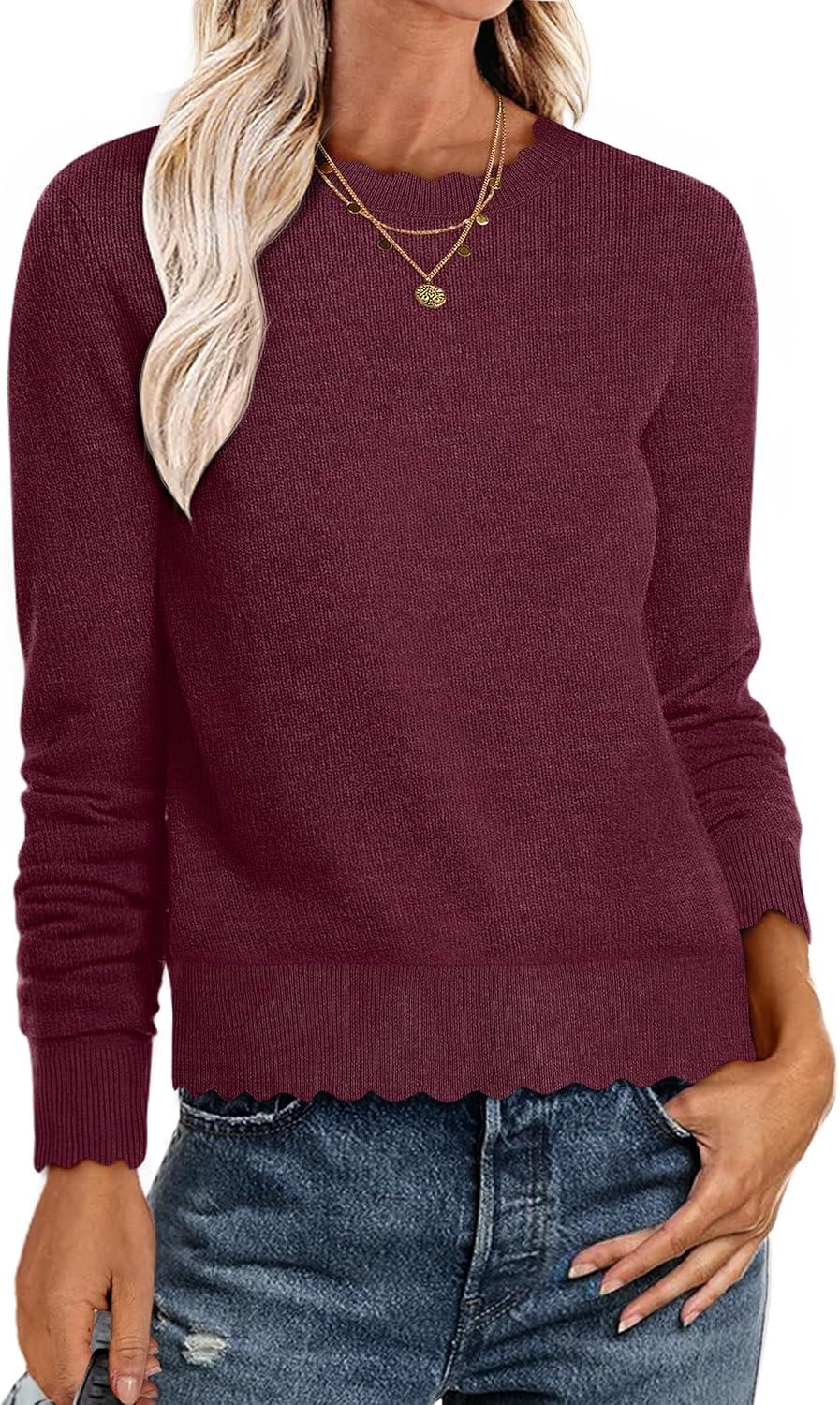 ANRABESS Womens Long Sleeve Sweaters Loose Fit Lightweight Scalloped Knit Soft Dressy Pullover Tops 2025 Fall Casual Outfits(Wine Red)