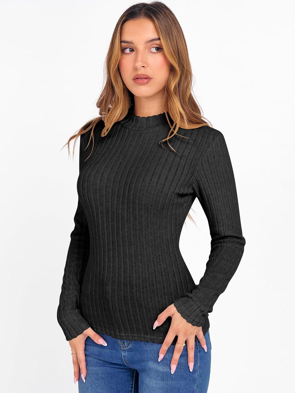 ANRABESS Women’s Long Sleeve Tops Mock Neck Ribbed Knit Slim Fit Pleated Basic T Shirts Lightweight Sweater Going Out Clothes(Black)