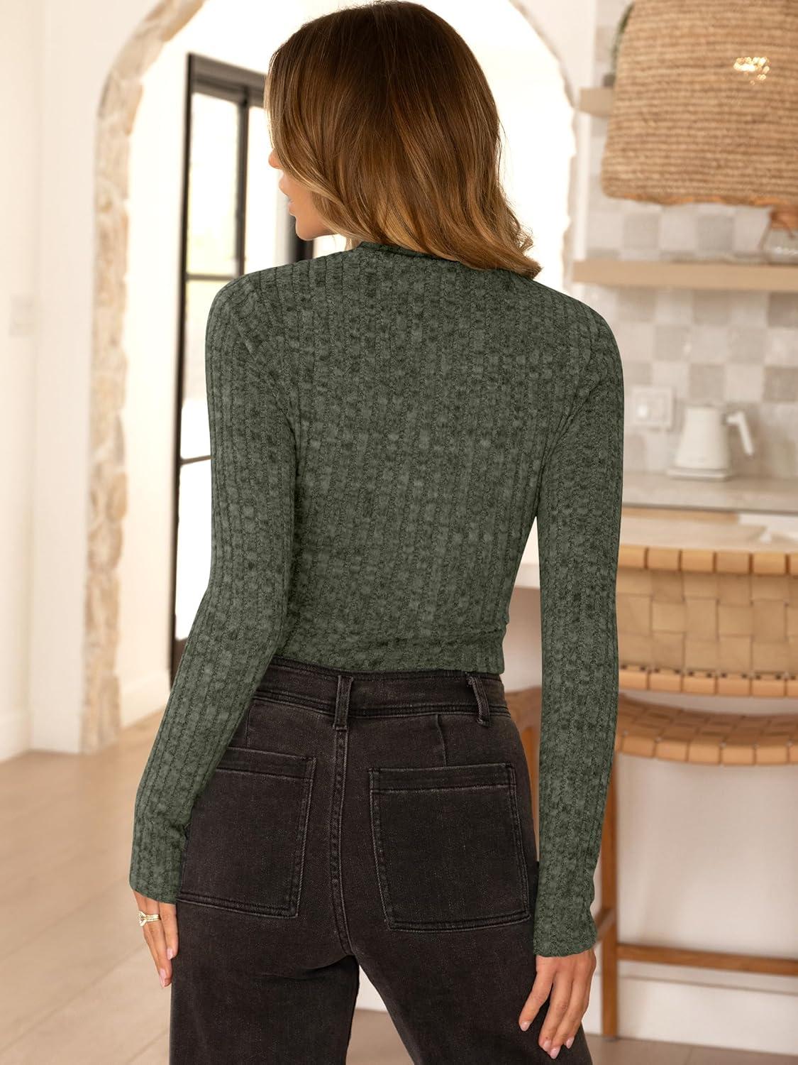 ANRABESS Women's Long Sleeve Tops Mock Neck Ribbed Knit Slim Fit Pleated Basic T Shirts Lightweight Sweater Going Out Clothes(Olive Green)