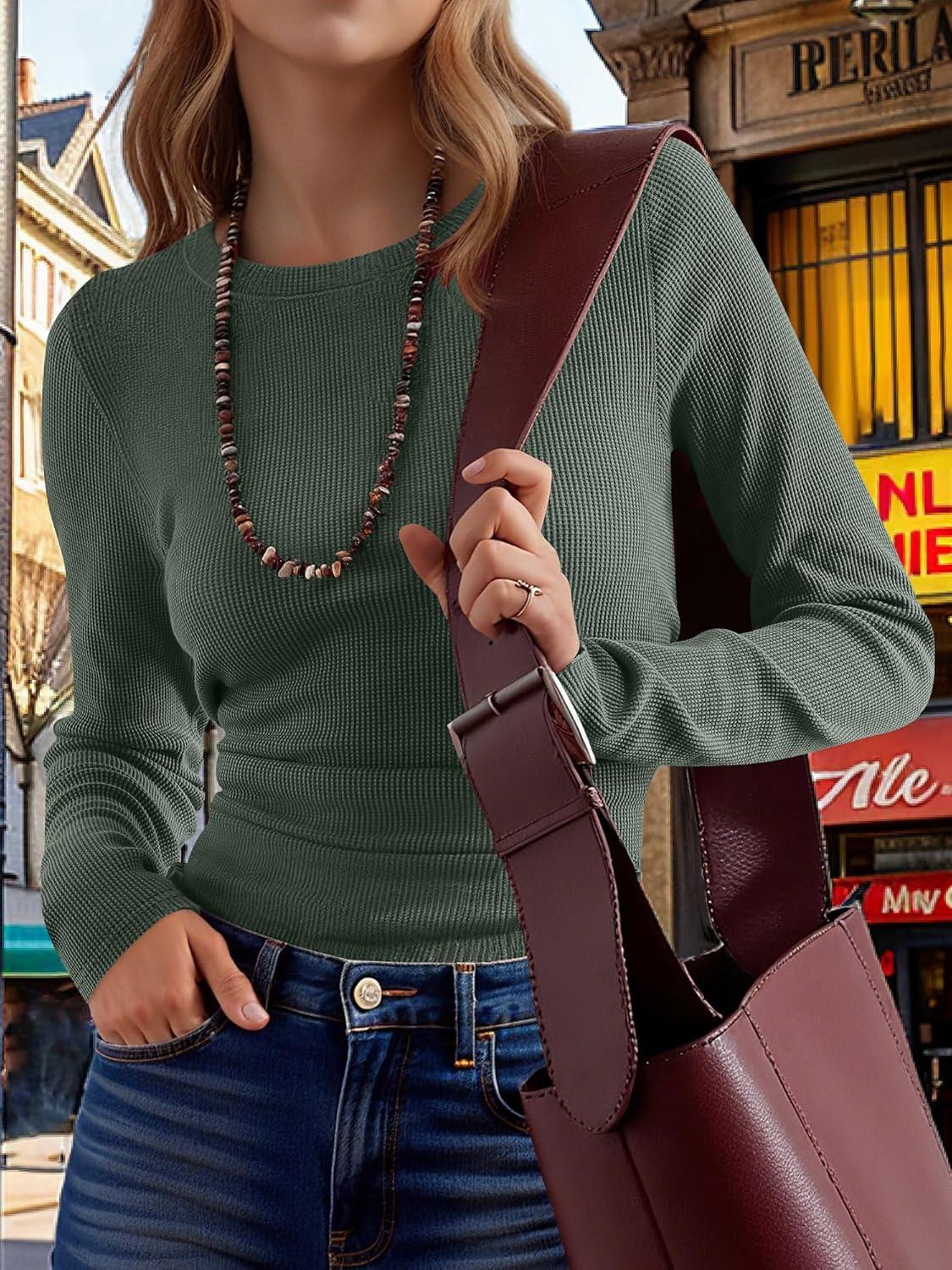 ANRABESS Women's Long Sleeve Waffle Knit Shirts Casual Slim Fitted Crew Neck Thermal Tops Basic Tee 2025 Fall Trendy Outfits(Army Green)