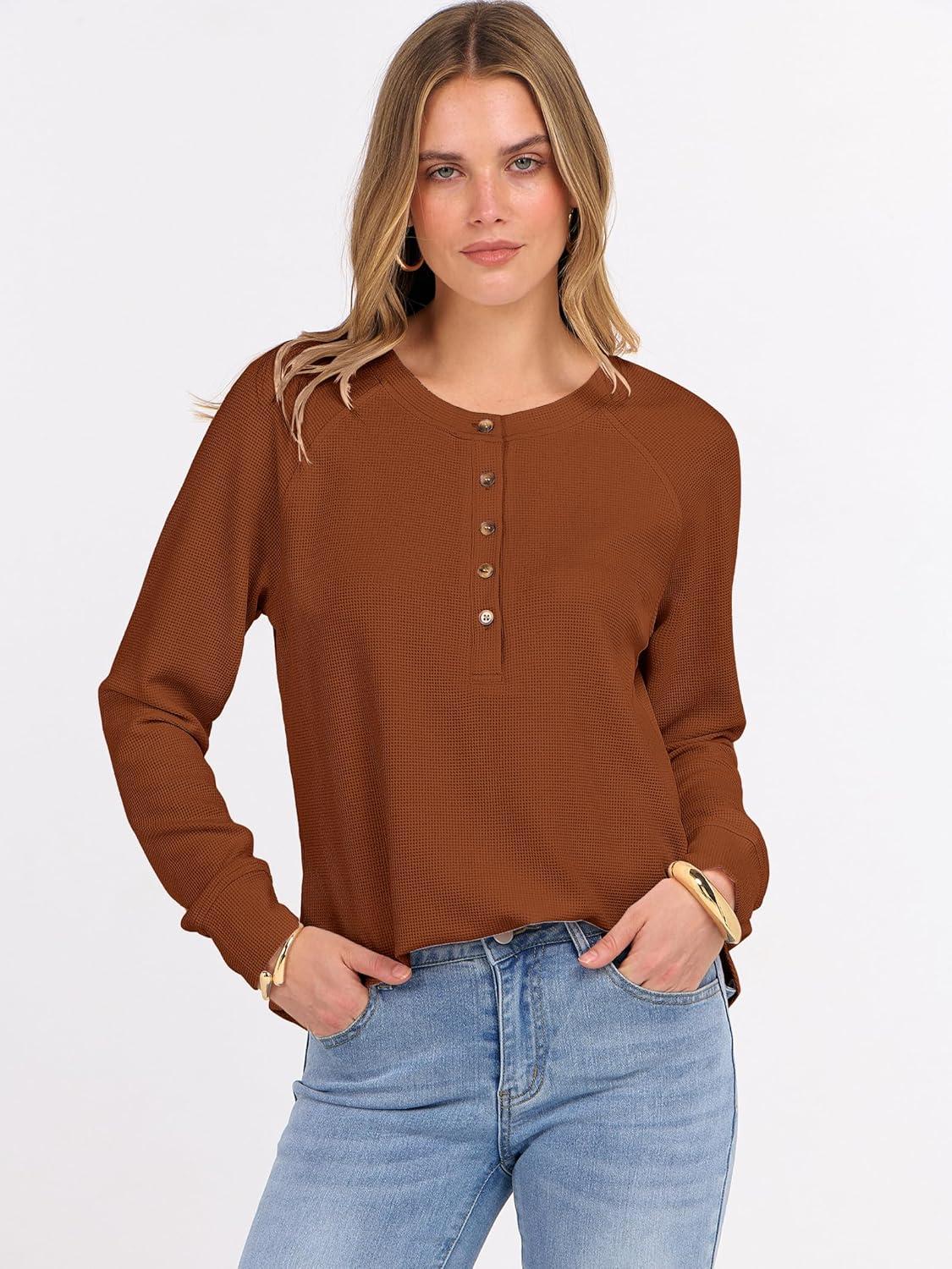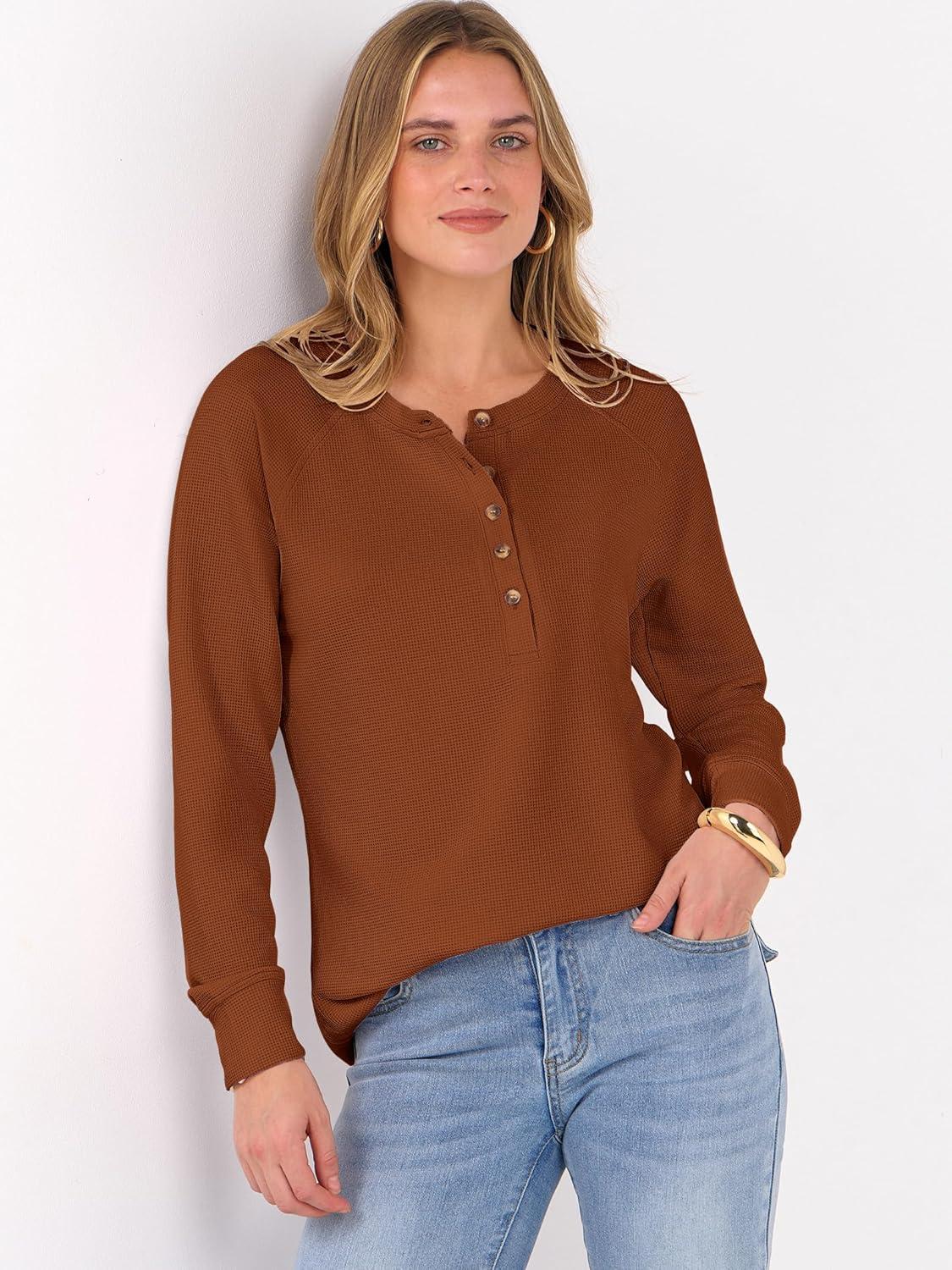 ANRABESS Women's Long Sleeve Waffle Knit Shirts Dressy Casual Loose Button Up V Neck Henley Tops 2025 Fall Basic Tee Blouse(Burnt Orange)