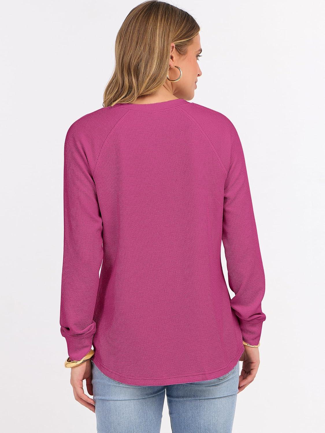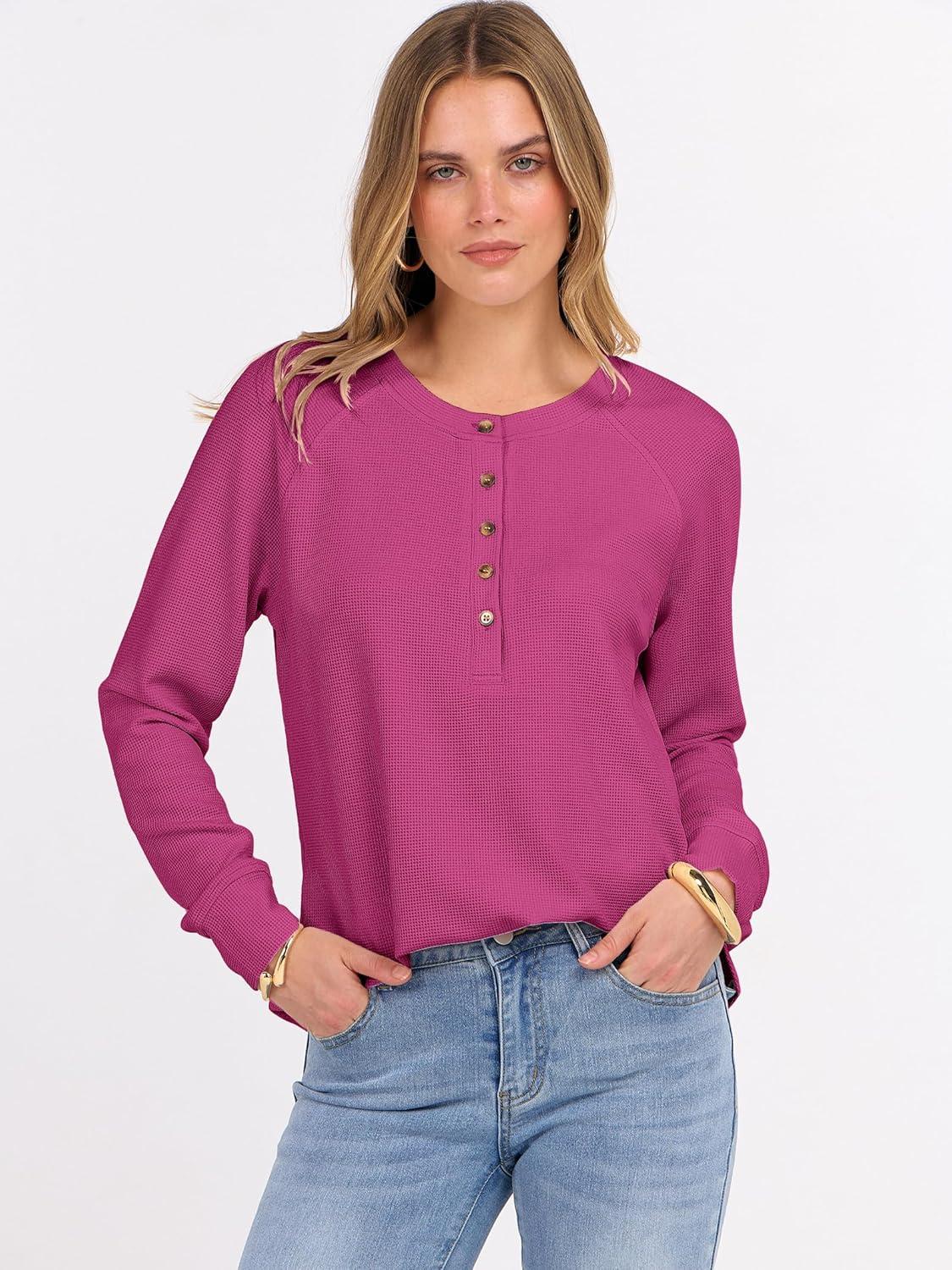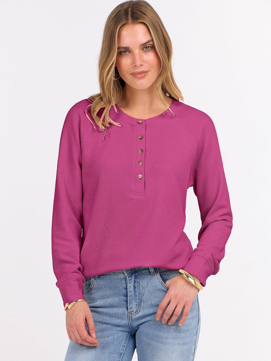 ANRABESS Women’s Long Sleeve Waffle Knit Shirts Dressy Casual Loose Button Up V Neck Henley Tops 2025 Fall Basic Tee Blouse(Hot Pink)