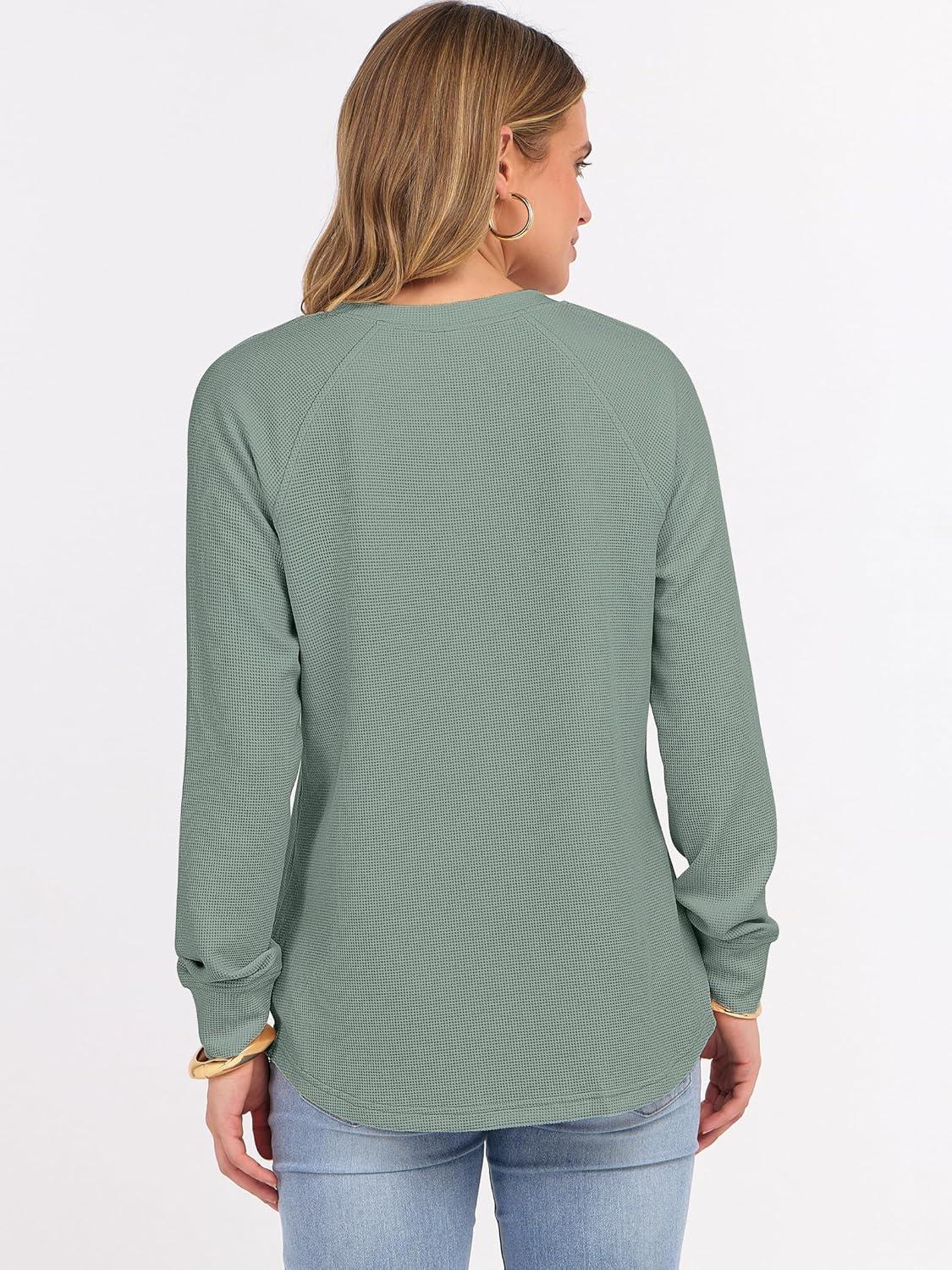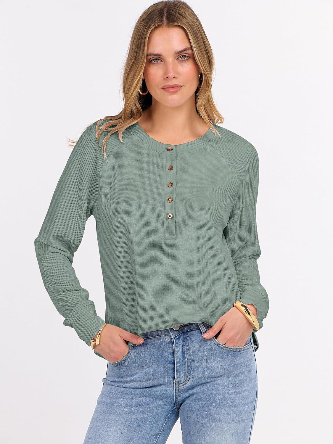 ANRABESS Women’s Long Sleeve Waffle Knit Shirts Dressy Casual Loose Button Up V Neck Henley Tops 2025 Fall Basic Tee Blouse(Light Green)