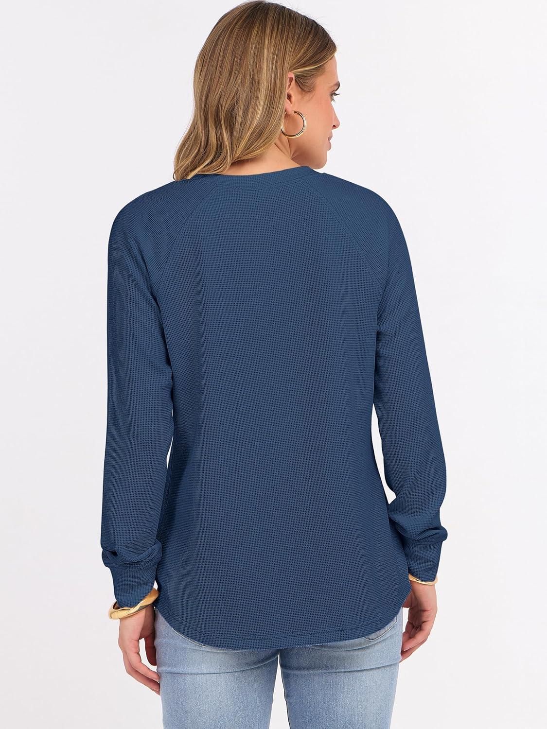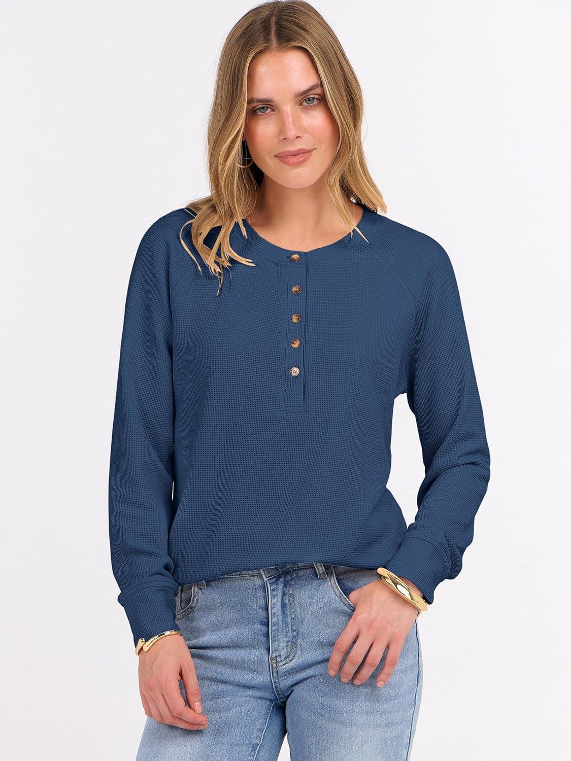 ANRABESS Women’s Long Sleeve Waffle Knit Shirts Dressy Casual Loose Button Up V Neck Henley Tops 2025 Fall Basic Tee Blouse(Navy Blue)