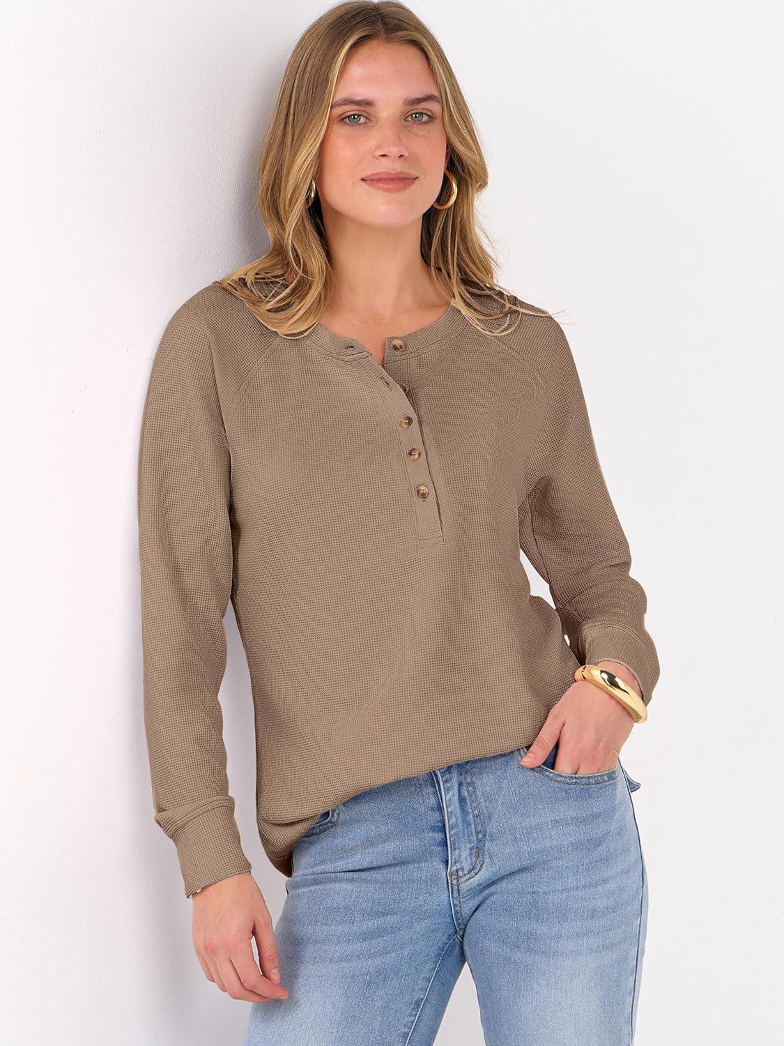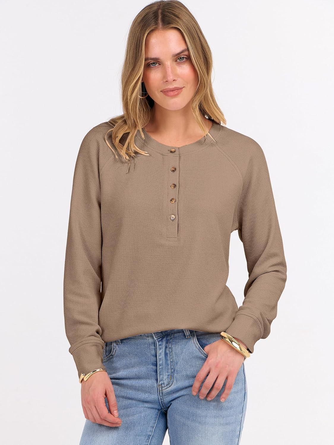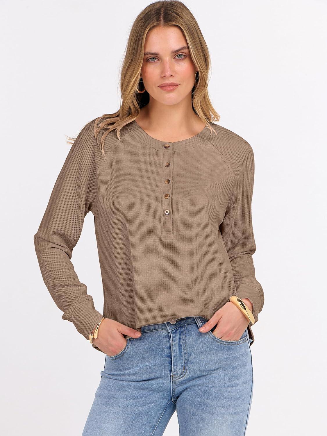 ANRABESS Women’s Long Sleeve Waffle Knit Shirts Dressy Casual Loose Button Up V Neck Henley Tops 2025 Fall Basic Tee Blouse(Tan)