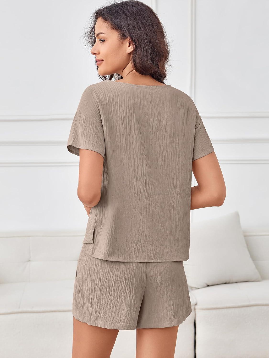 imageANRABESS Womens Lounge Pajamas Short Set 2026 Casual Summer 2 Piece Outfits Lightweight Loungewear ClothesBeige