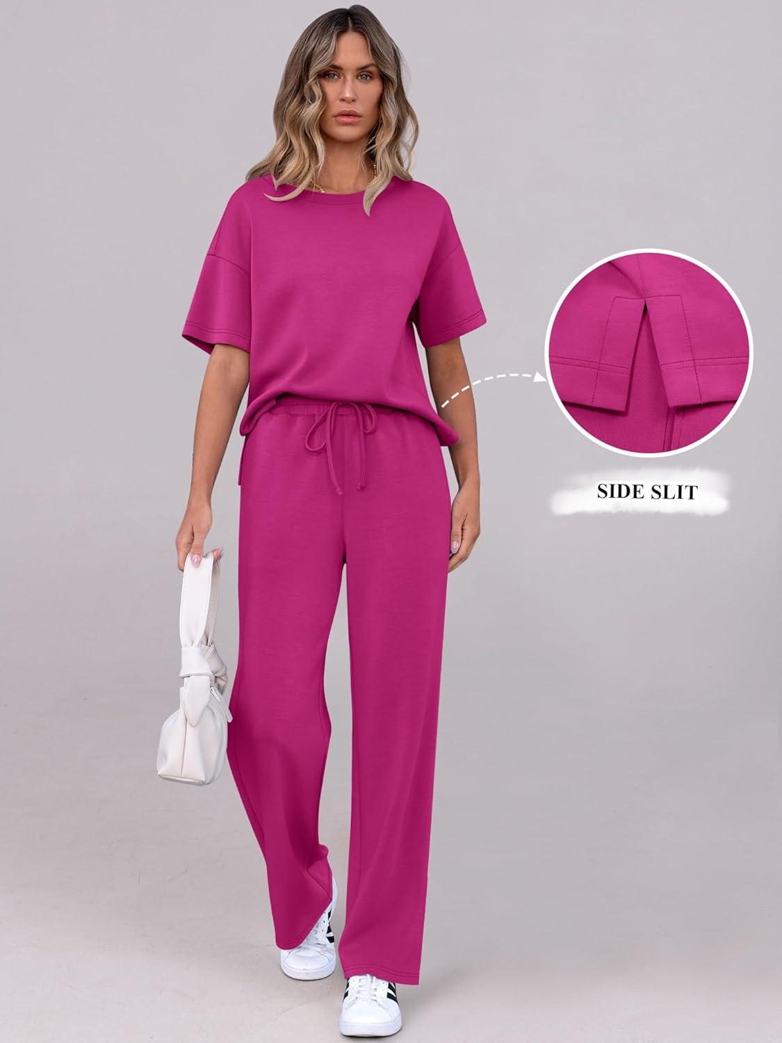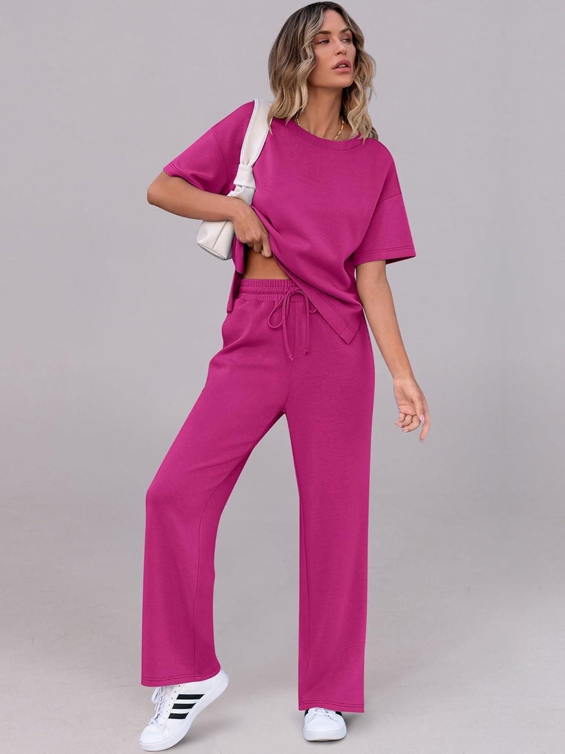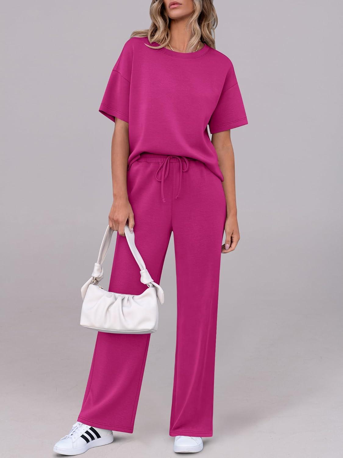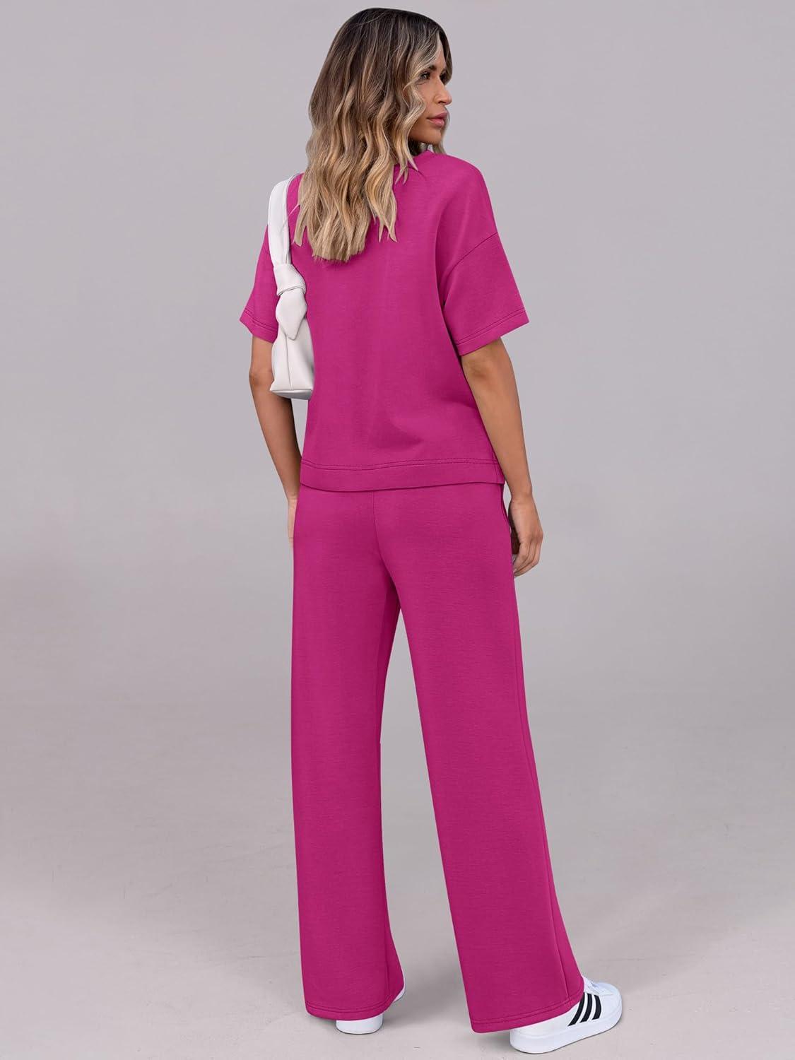 ANRABESS Women’s Lounge Sets 2 Piece Outfits 2026 Summer Casual Short Sleeve Sweatsuits Matching Tracksuits Wide Leg Pant Set(Hot Pink)