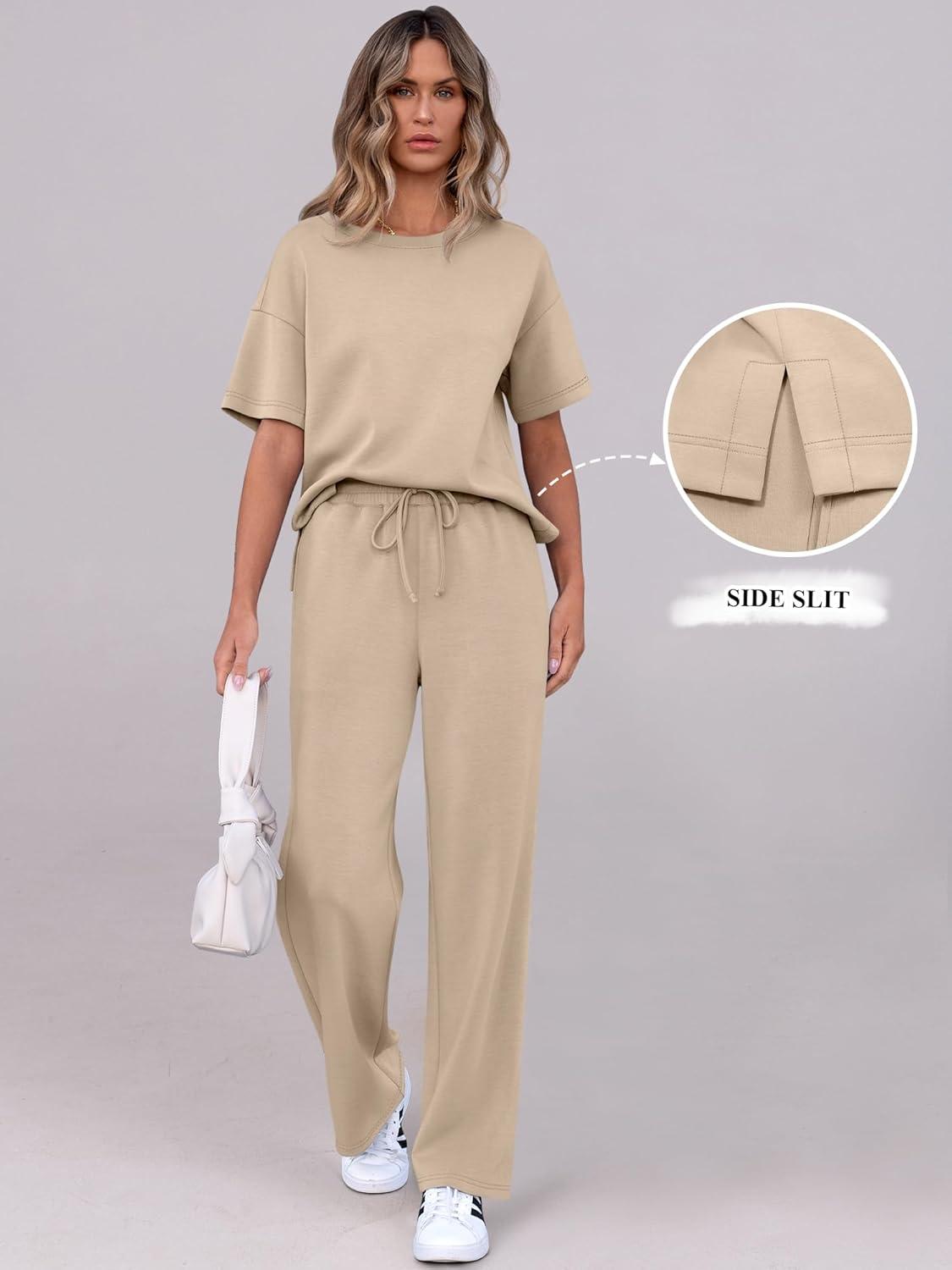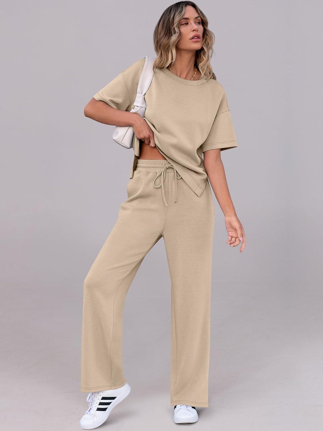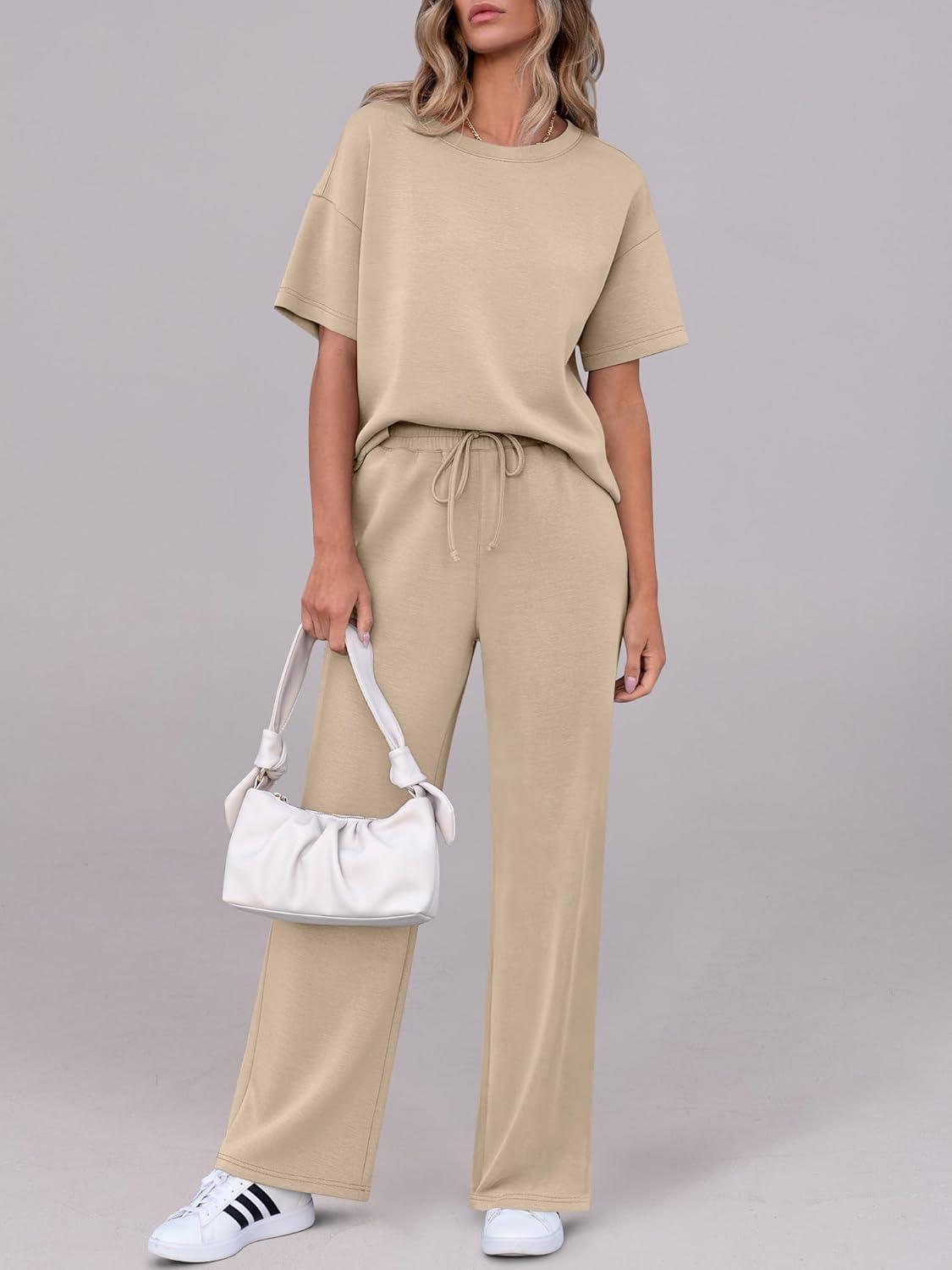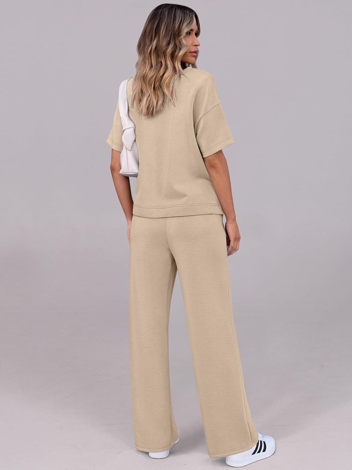 ANRABESS Women’s Lounge Sets 2 Piece Outfits 2026 Summer Casual Short Sleeve Sweatsuits Matching Tracksuits Wide Leg Pant Set(Khaki)