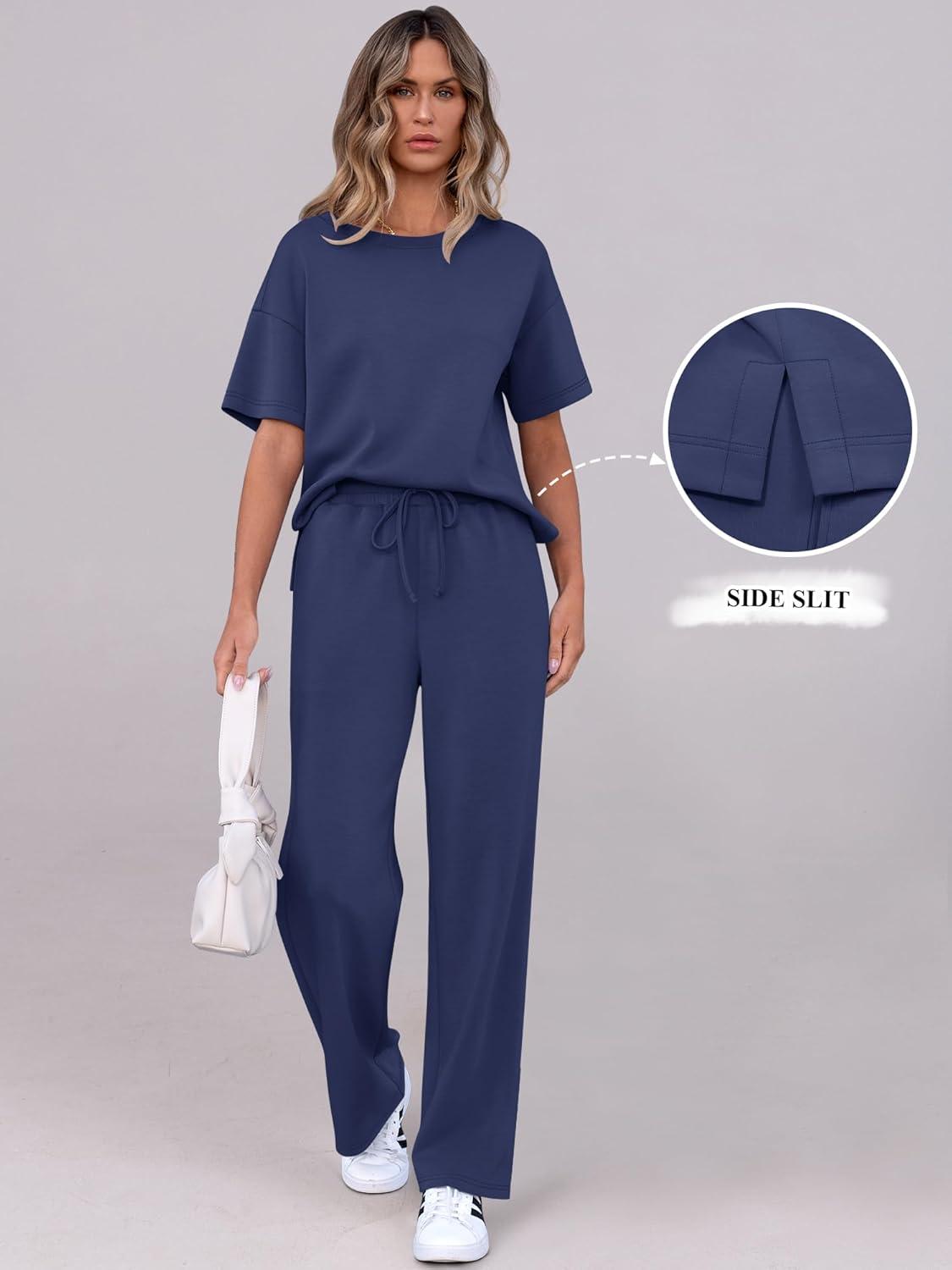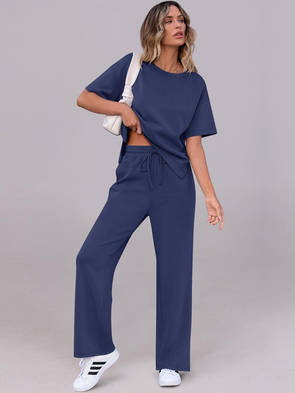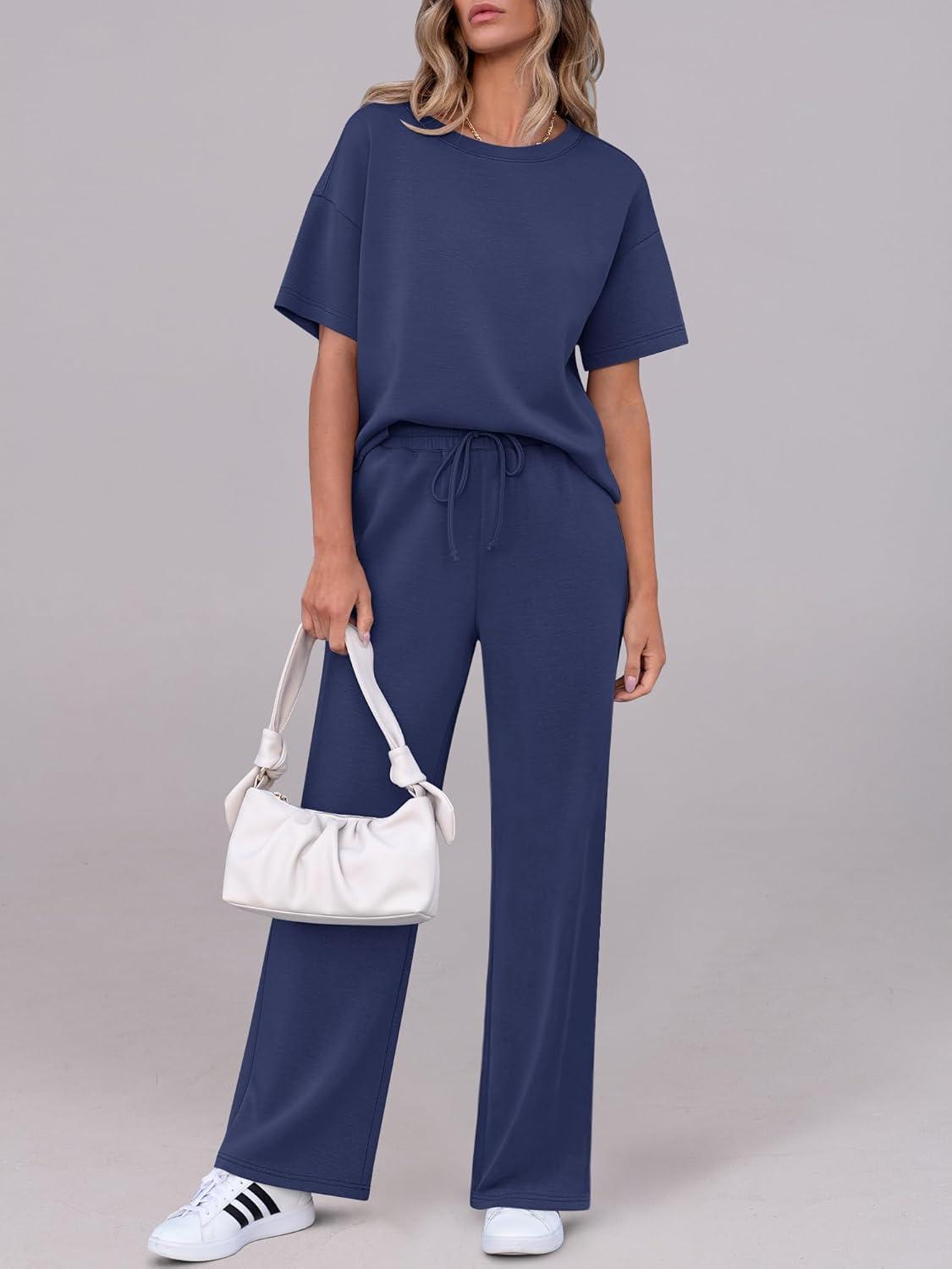 ANRABESS Women’s Lounge Sets 2 Piece Outfits 2026 Summer Casual Short Sleeve Sweatsuits Matching Tracksuits Wide Leg Pant Set(Navy Blue)