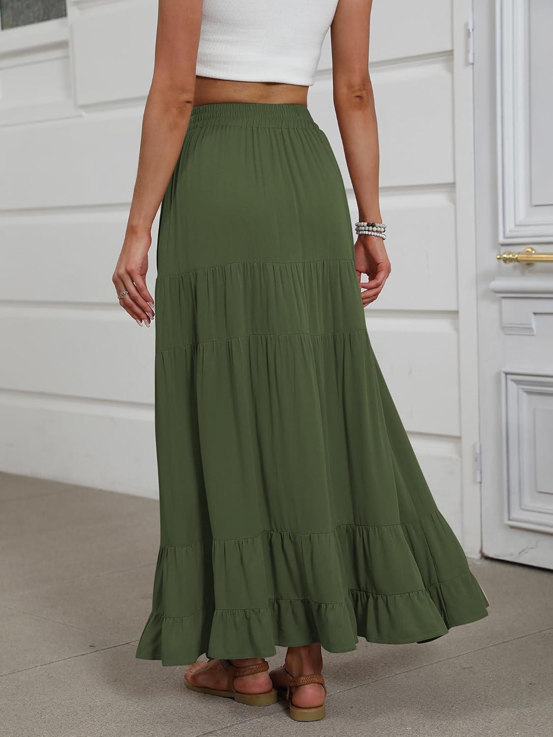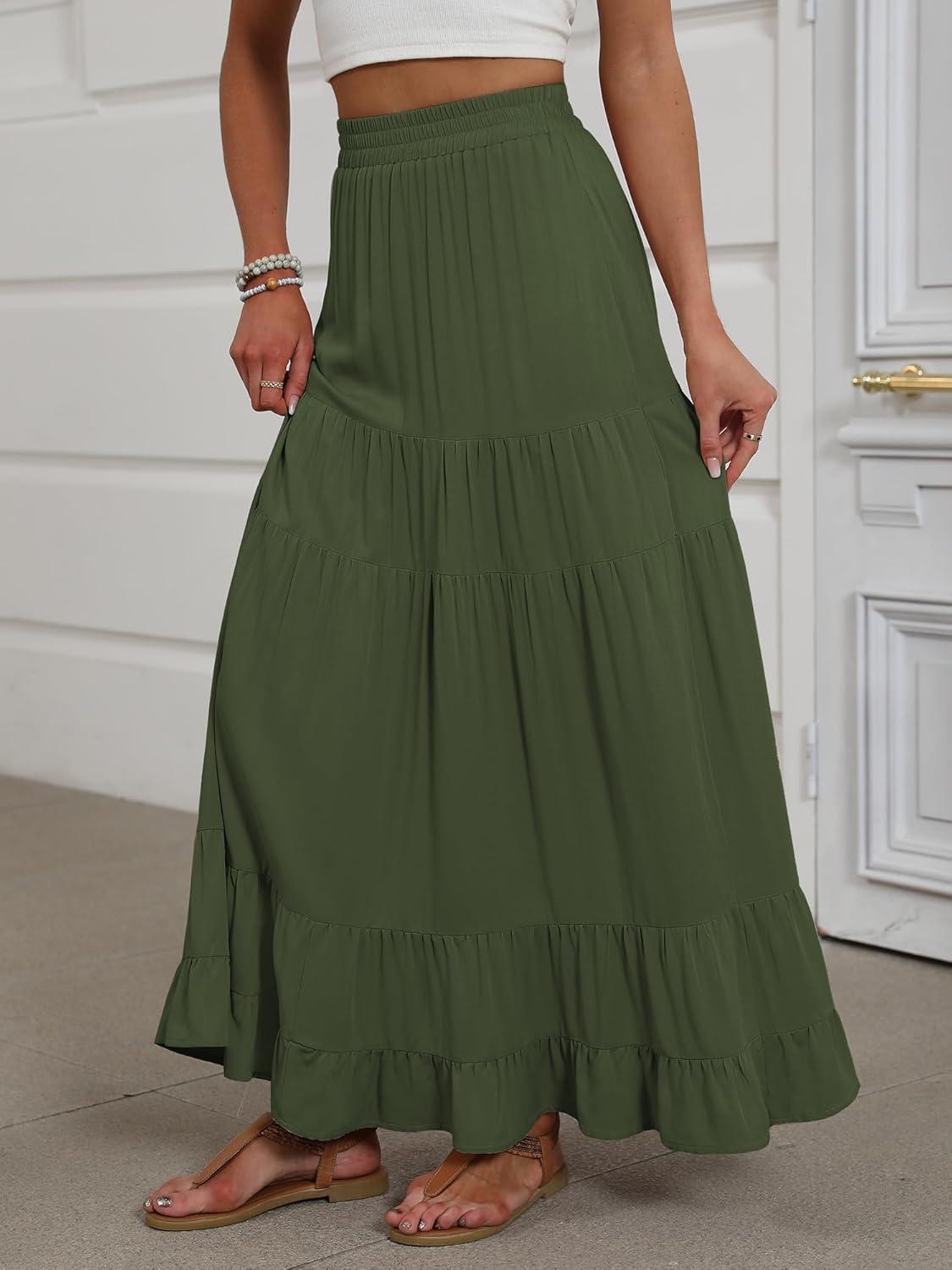 ANRABESS Womens Maxi Skirt Elastic High Waist Swing Tiered A-line Flowy Pleated Boho Beach Vacation Long Skirts(Dark Green)