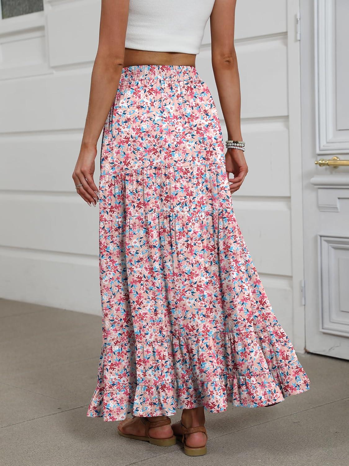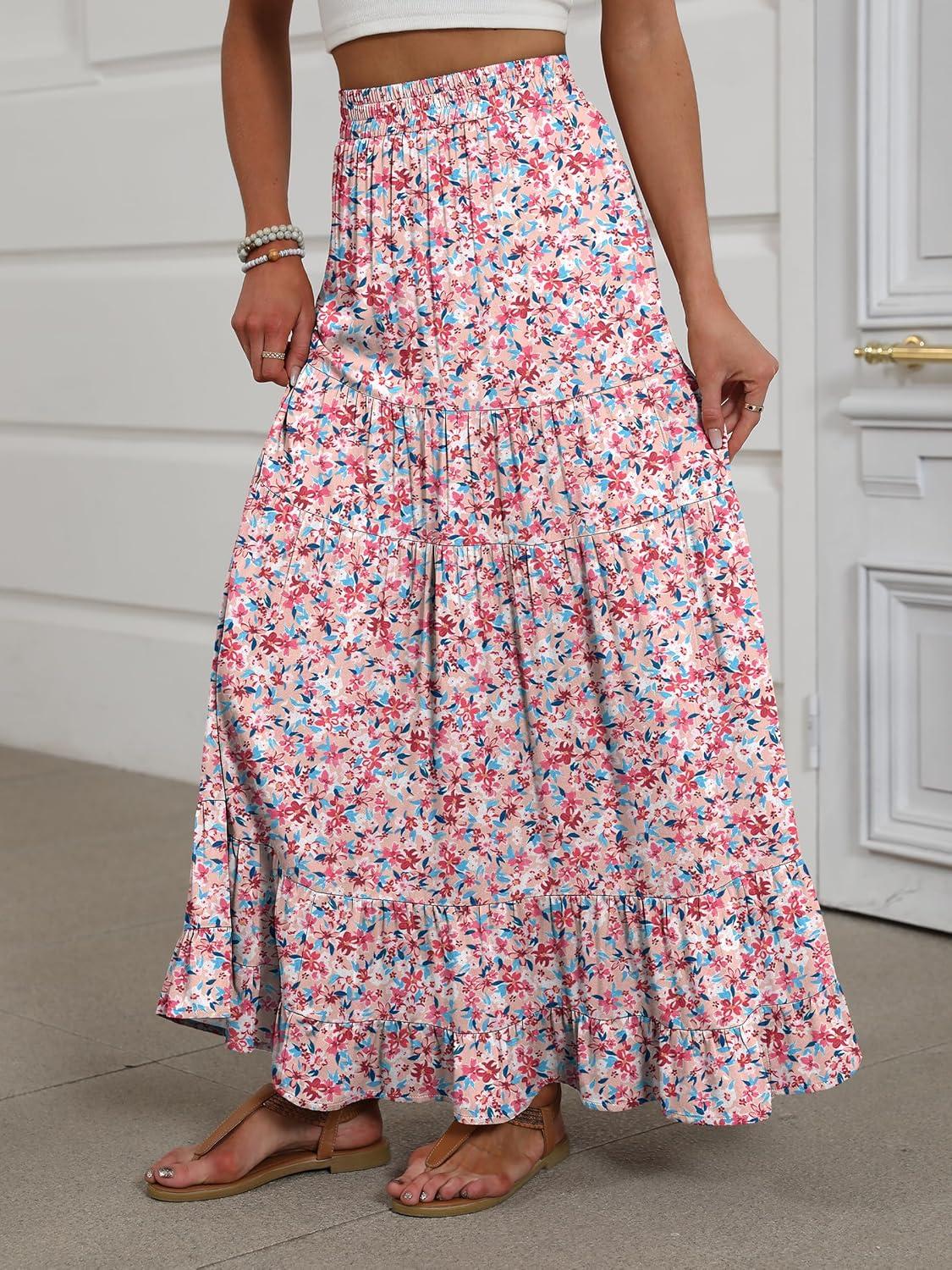 ANRABESS Womens Maxi Skirt Elastic High Waist Swing Tiered A-line Flowy Pleated Boho Beach Vacation Long Skirts(Floral Pink)