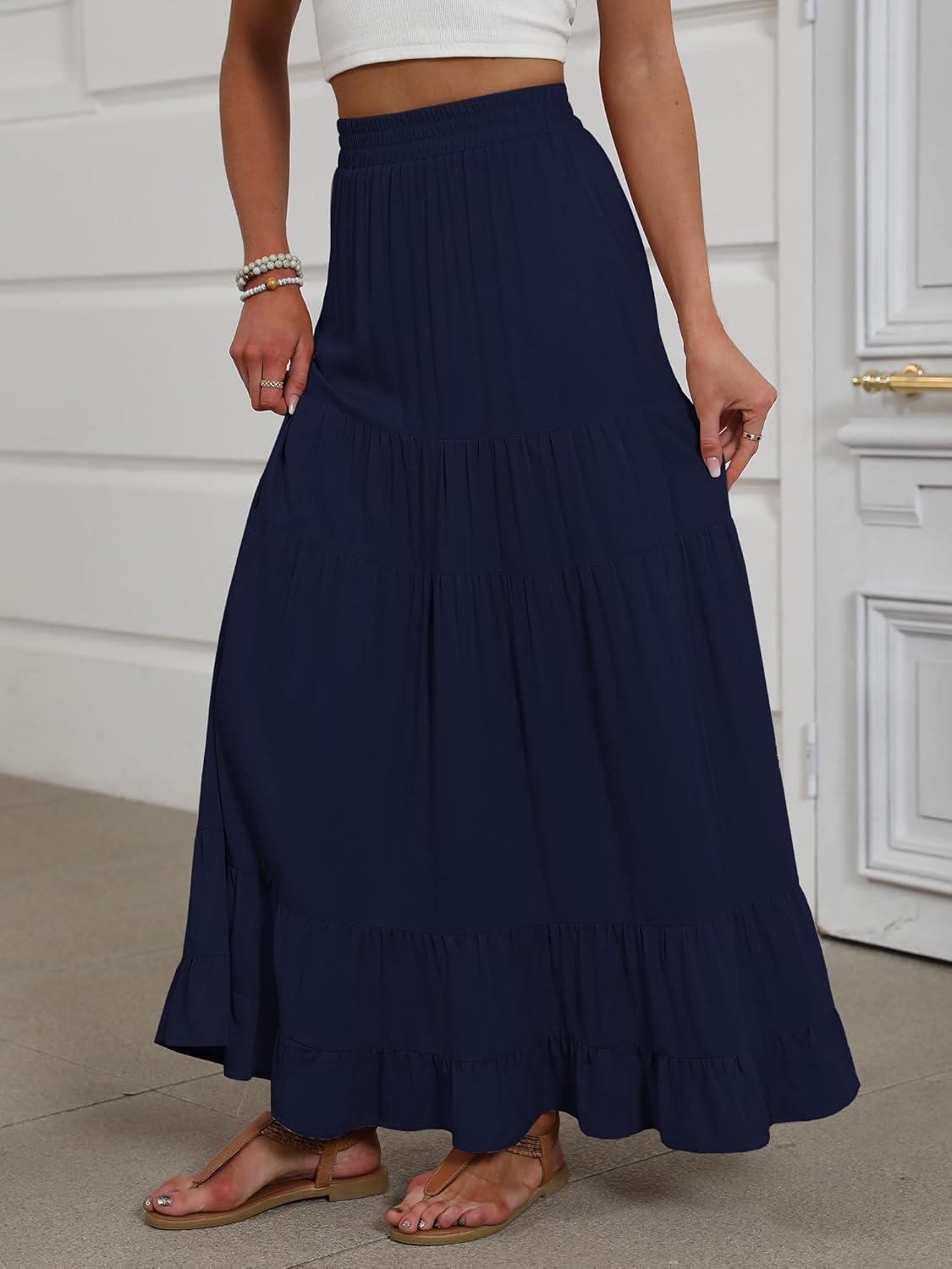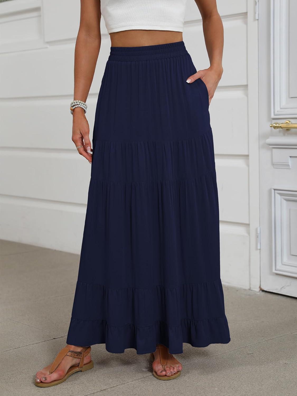 ANRABESS Womens Maxi Skirt Elastic High Waist Swing Tiered A-line Flowy Pleated Boho Beach Vacation Long Skirts(Navy Blue)
