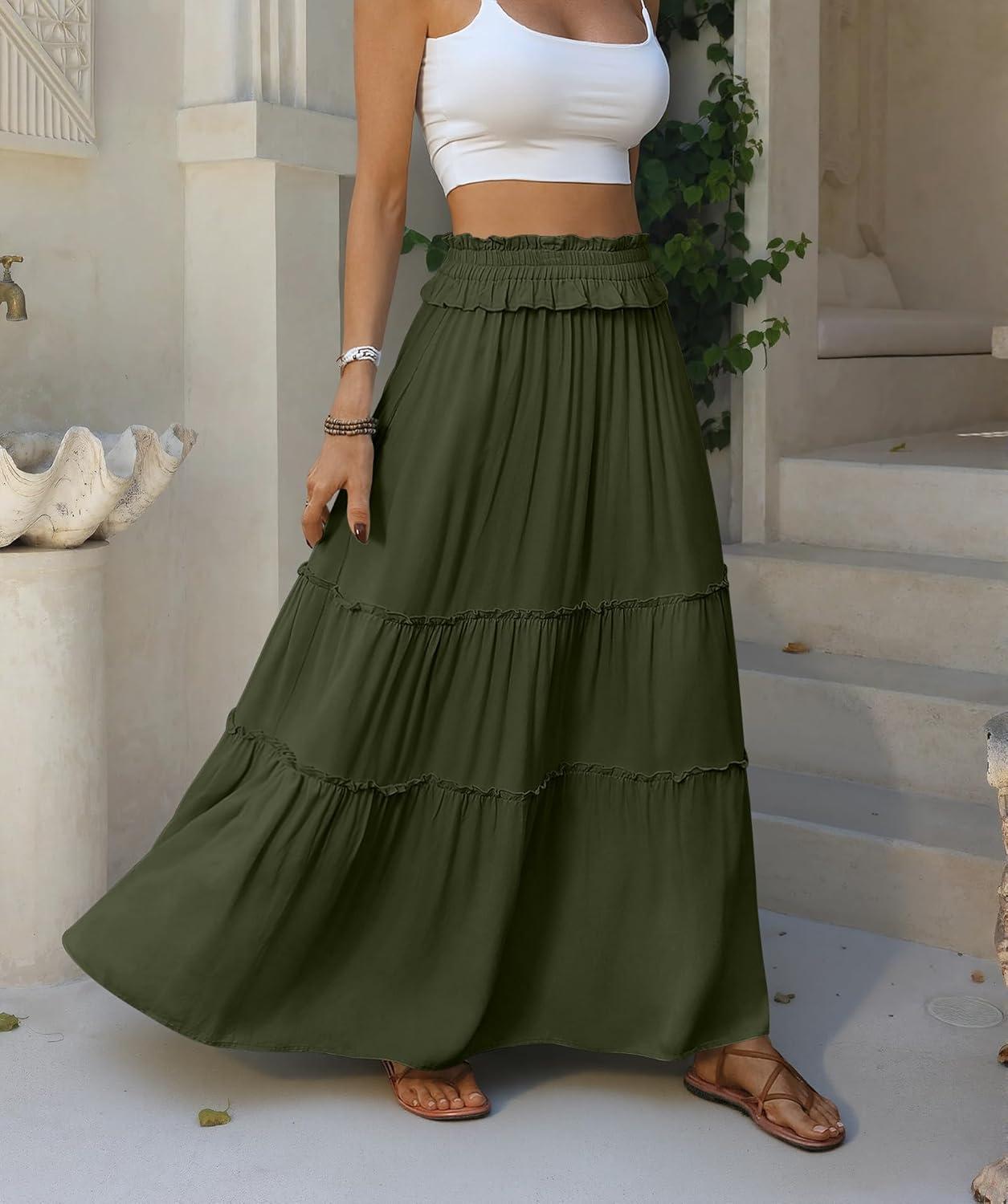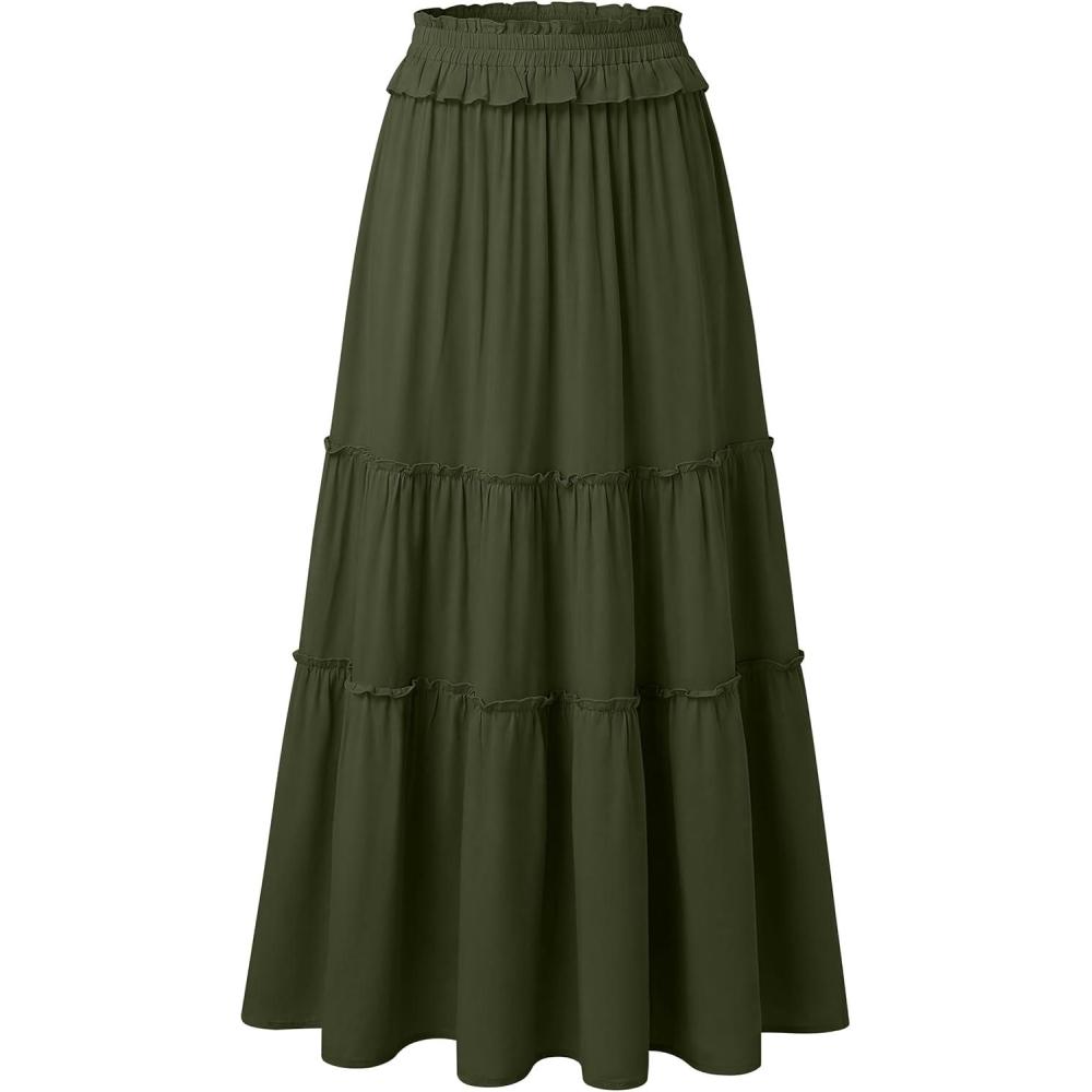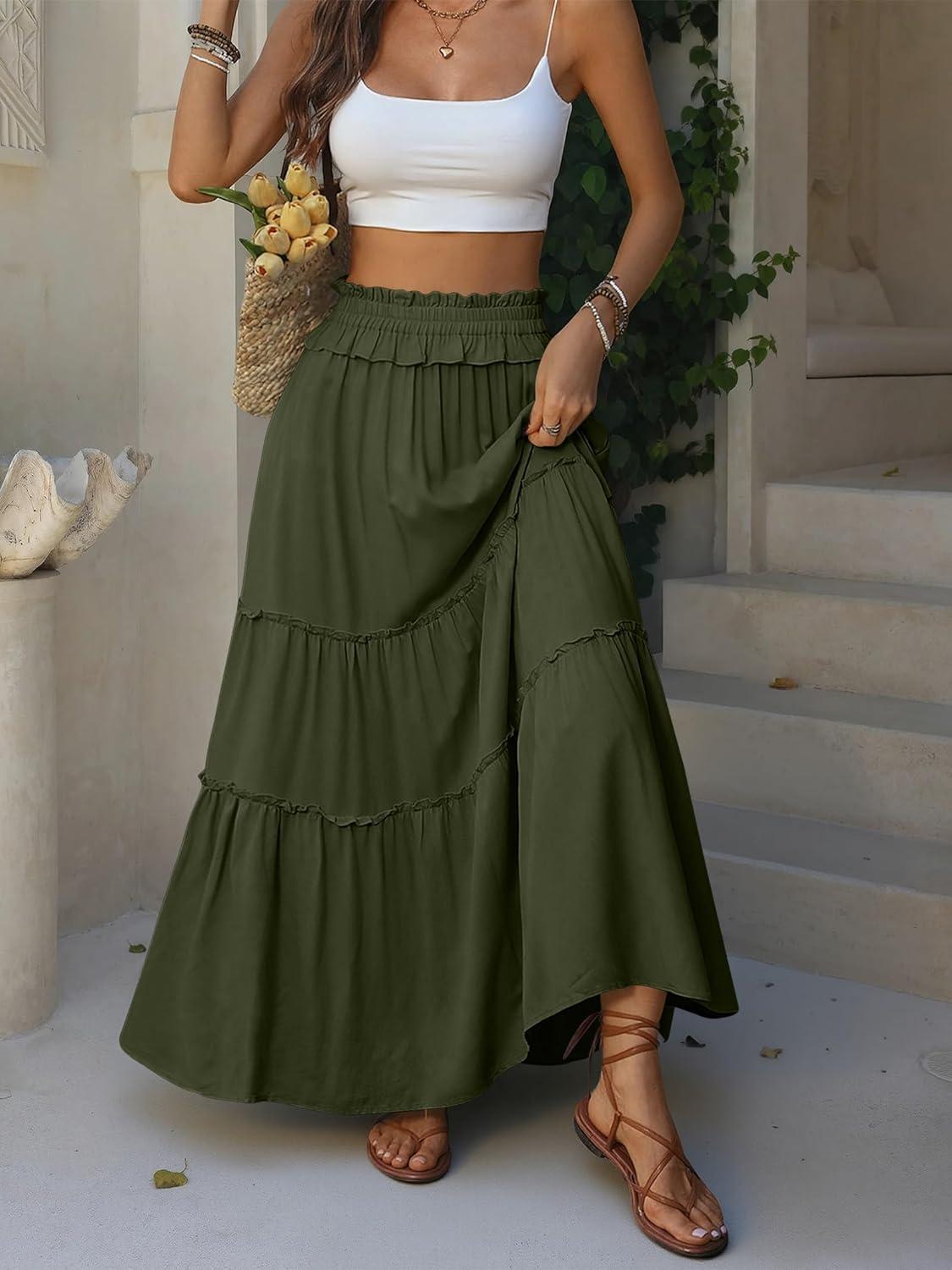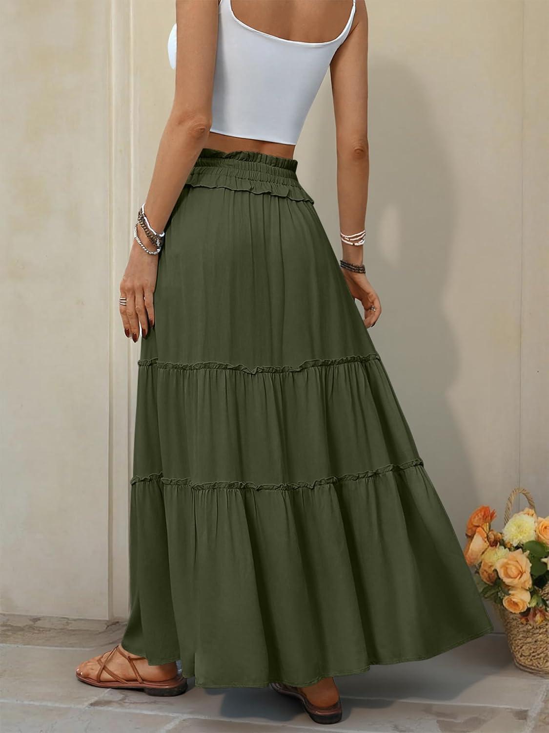 ANRABESS Womens Maxi Skirt Flowy Swing Ruffle Tiered Elastic High Waist Long Skirts 2026 Summer Casual Beach Vacation Clothes(Green)