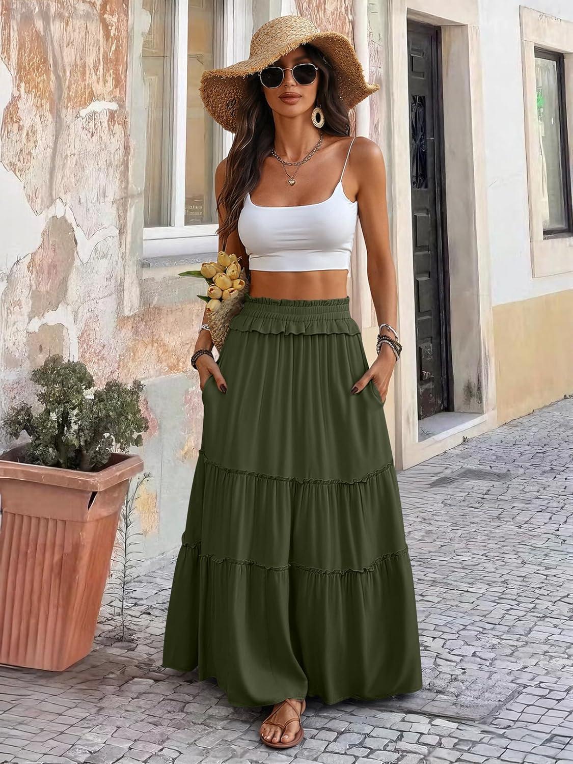 Women's maxi skirt with useful pockets, a cute ruffled hem, elastic smocked high waist, and a tiered, A-line flowy design, made from soft and breathable fabric. This long skirt can be easily paired with slippers, heels, or sneakers, as well as various types of tops such as vests, T-shirts, etc. Our skirts are perfect for daily wear, home leisure, strolling outside, traveling, beach walking, vacationing, or office work.