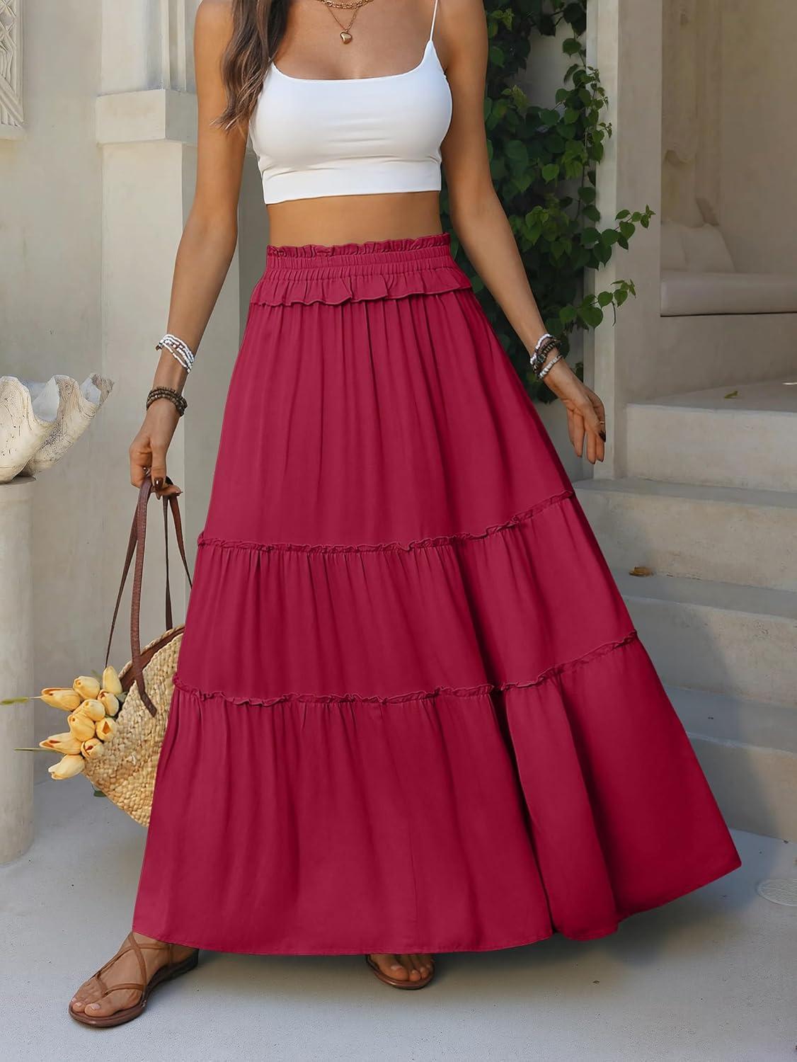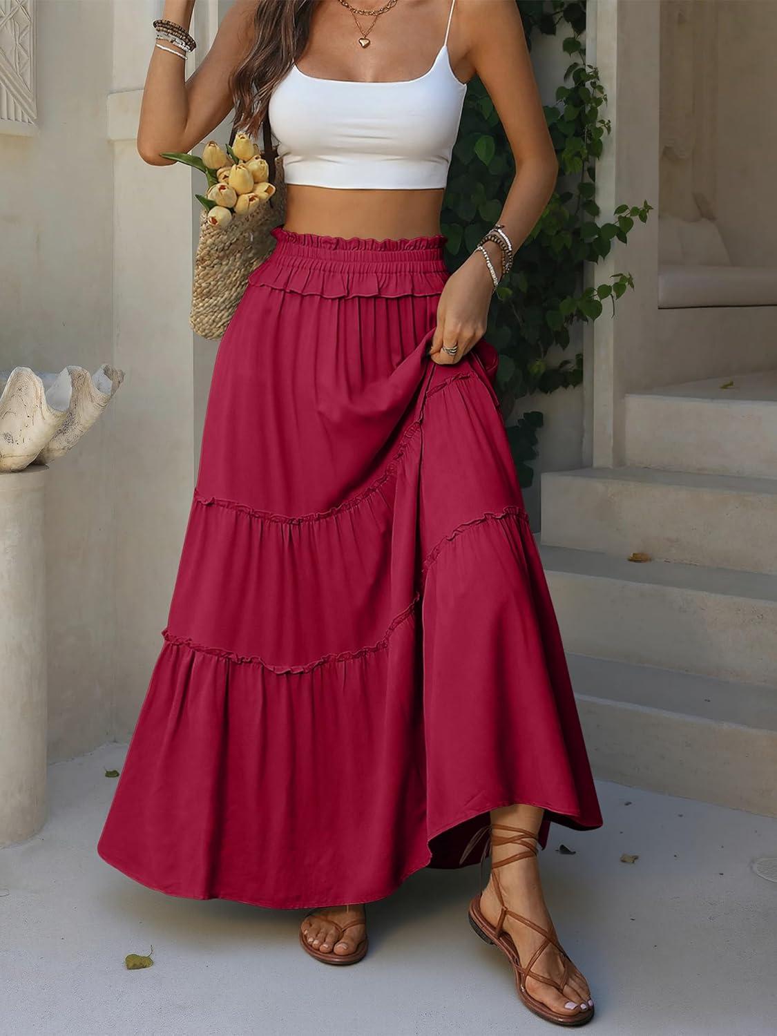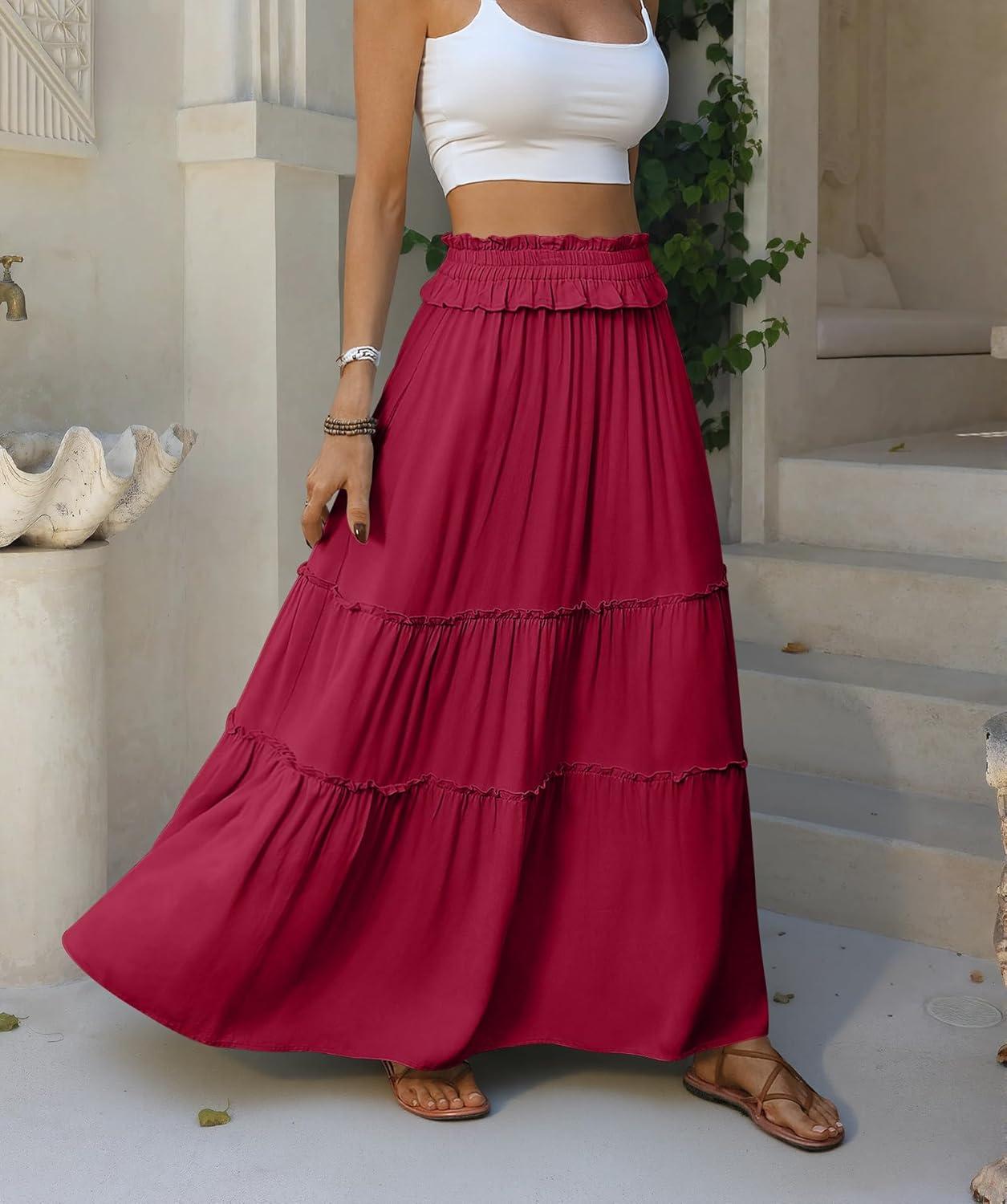 ANRABESS Womens Maxi Skirt Flowy Swing Ruffle Tiered Elastic High Waist Long Skirts 2026 Summer Casual Beach Vacation Clothes(Red)
