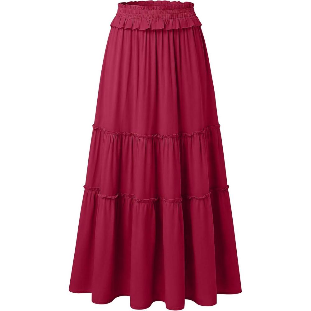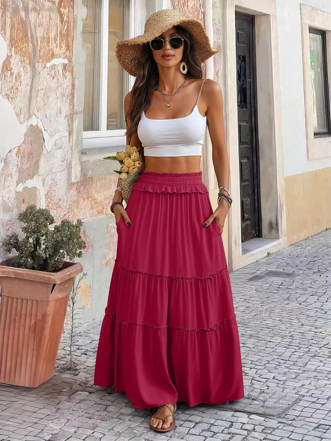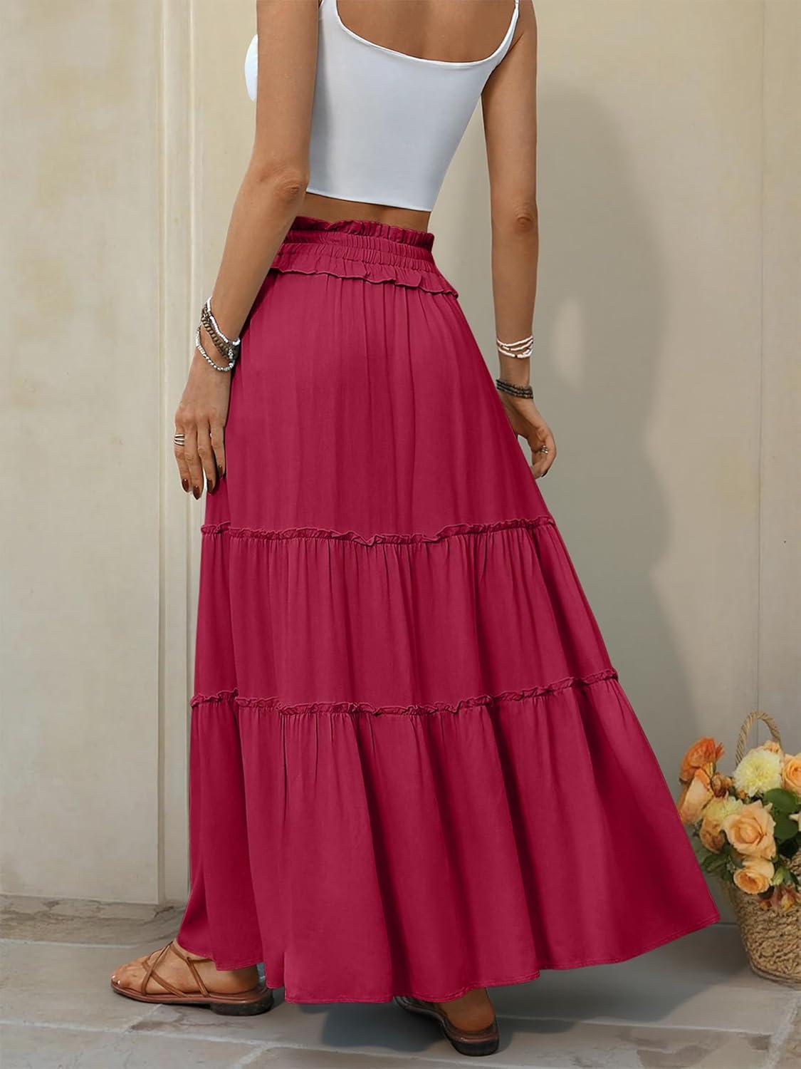 ANRABESS Womens Maxi Skirt Flowy Swing Ruffle Tiered Elastic High Waist Long Skirts 2026 Summer Casual Beach Vacation Clothes(Red)
