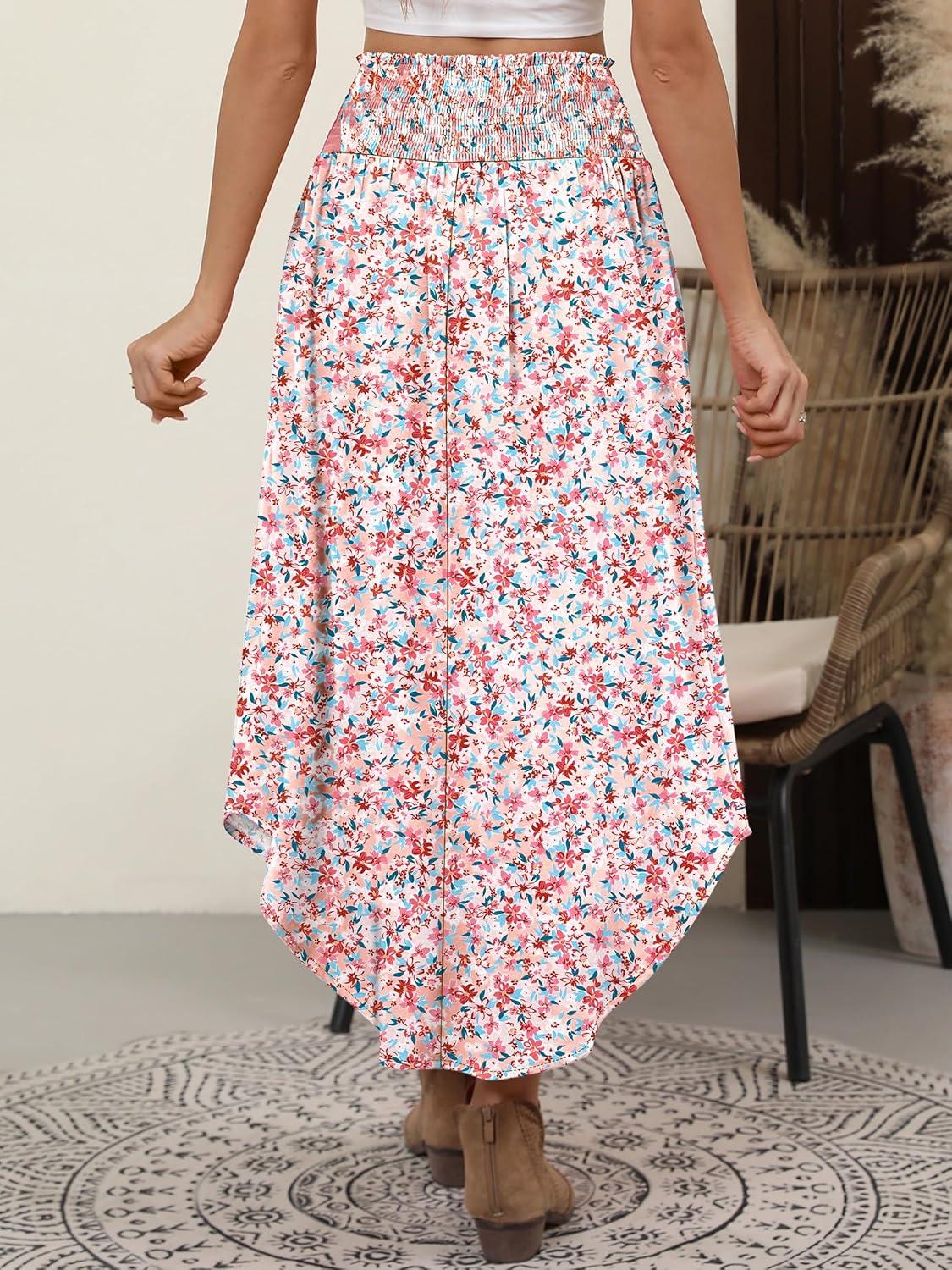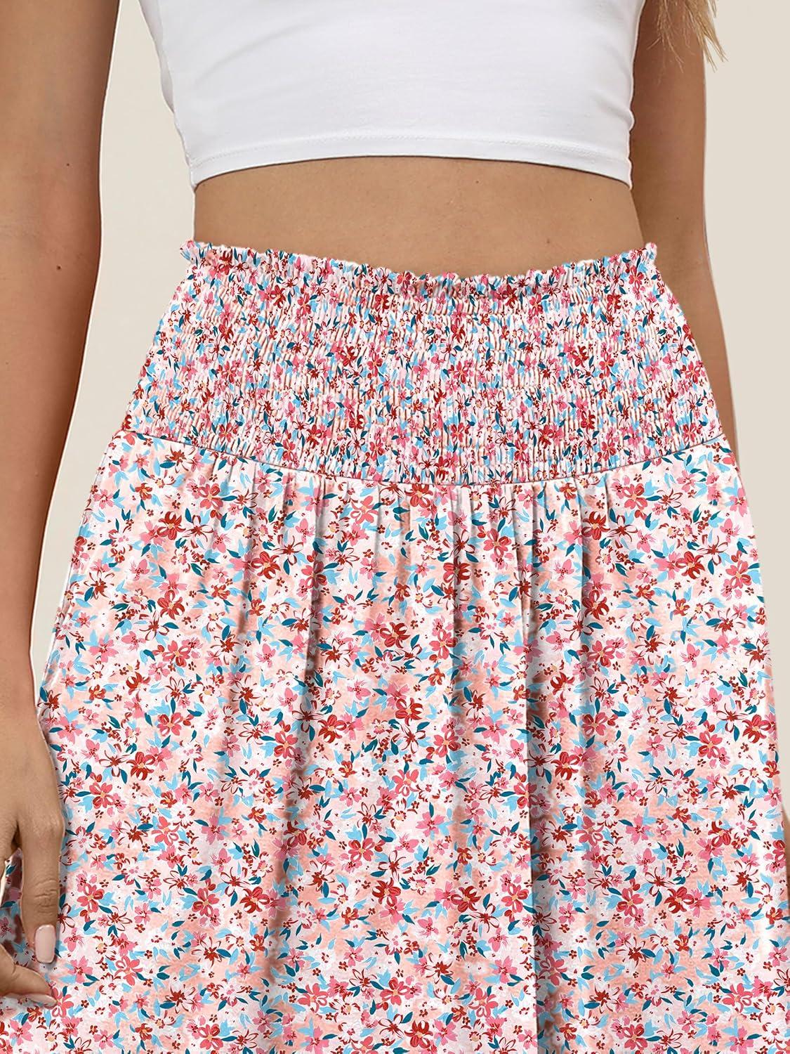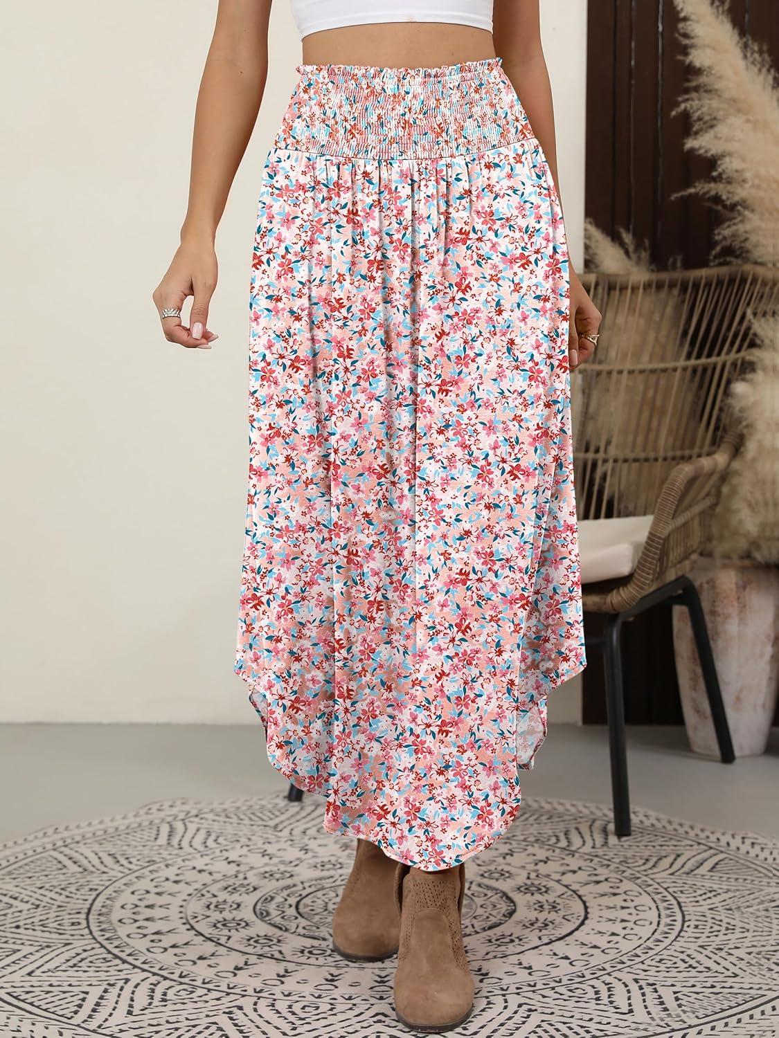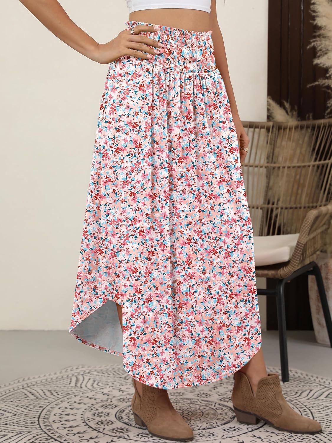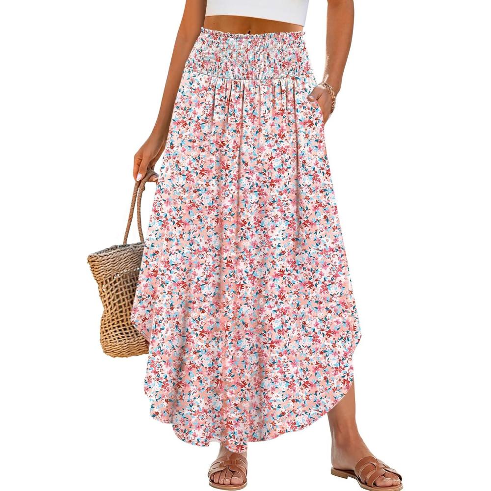 ANRABESS Women’s Maxi Skirts Summer Boho Floral High Waisted Flowy Swing Pleated Beach Long Skirt with Pockets(Floral Pink)