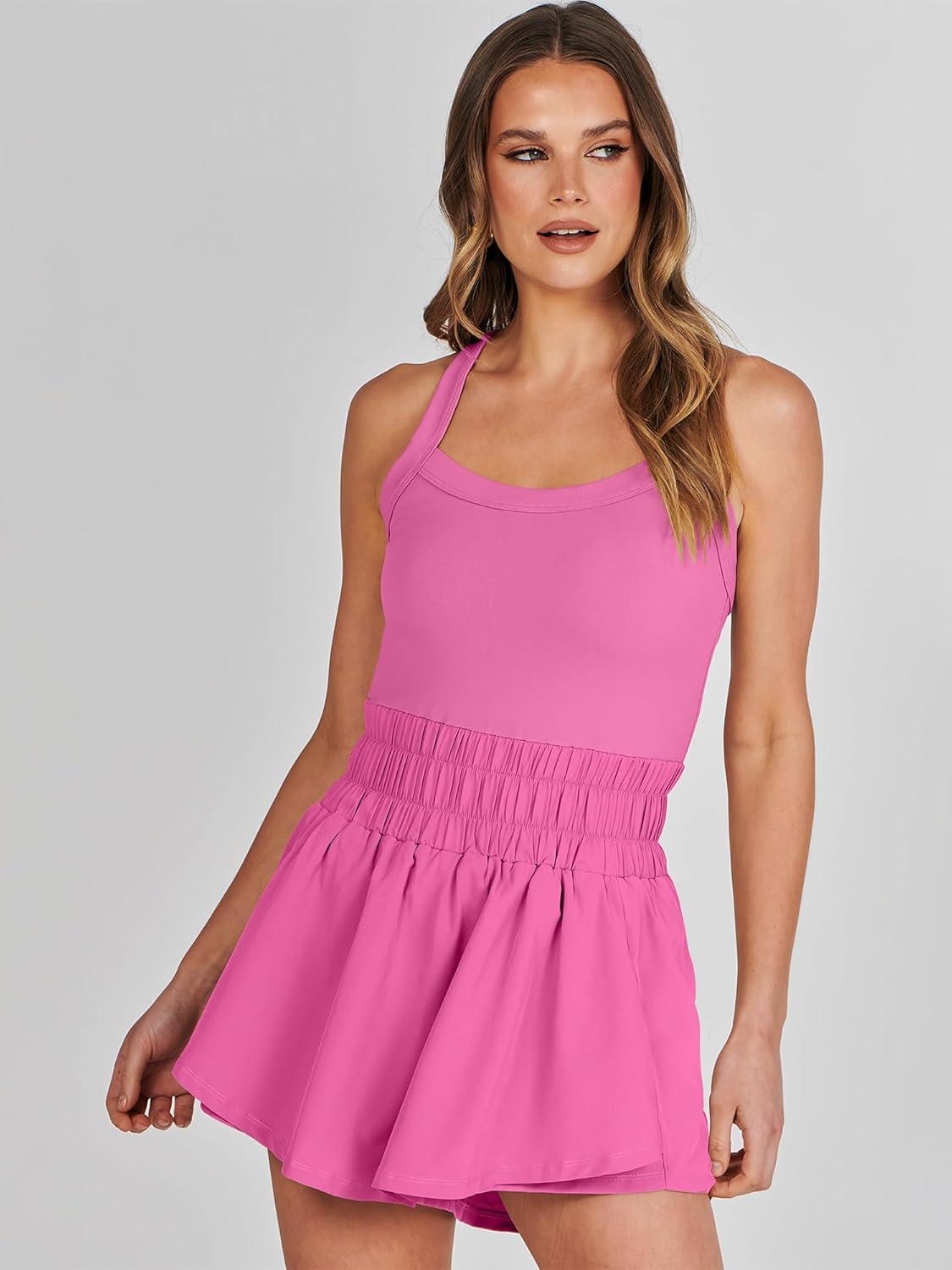 ANRABESS Womens Mini Tennis Dresses Skort Summer Sleeveless One Piece Workout Romper Dress with Shorts Athletic 2025 Outfit(Hot Pink)