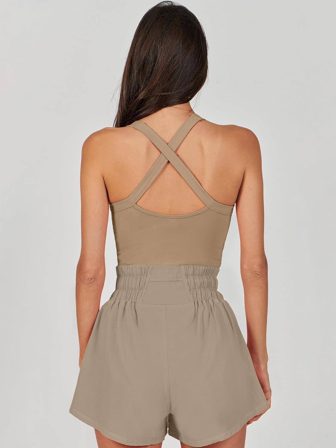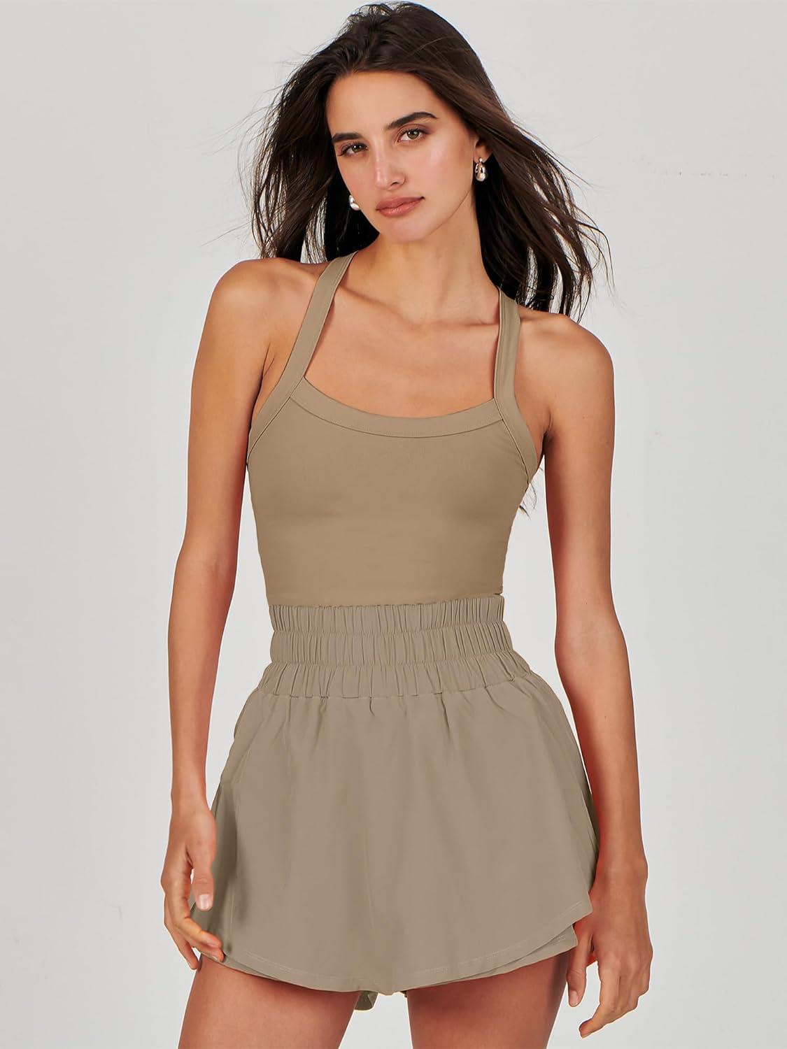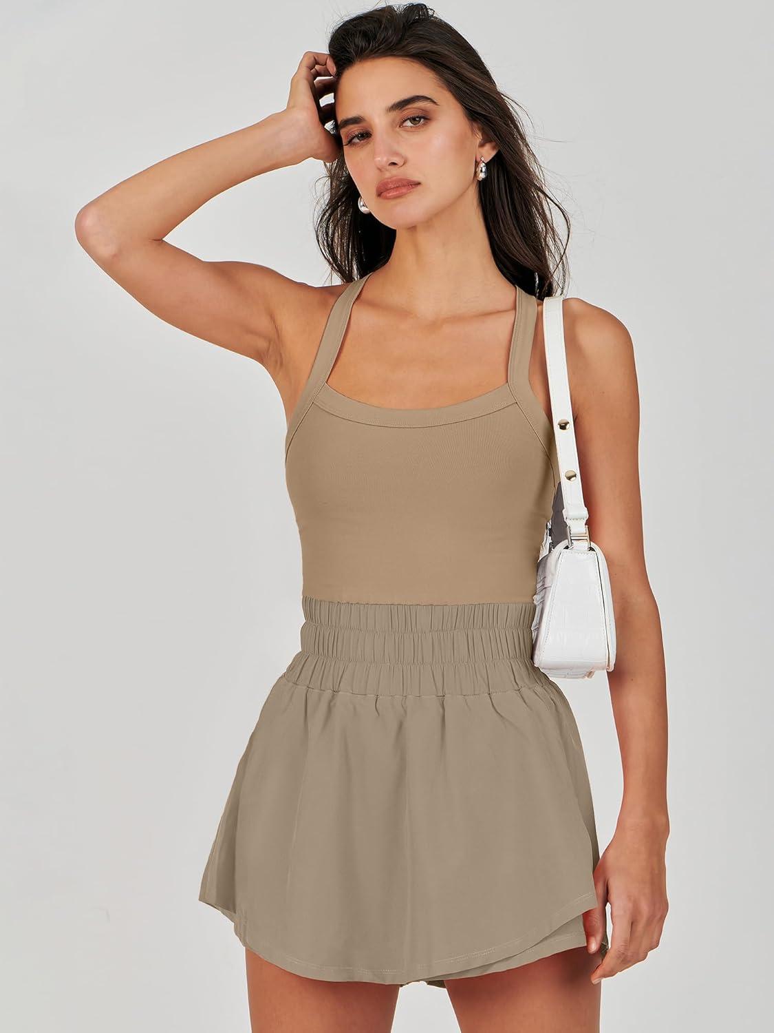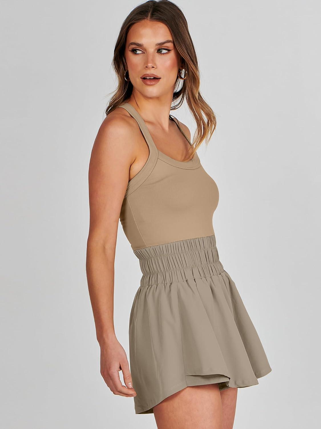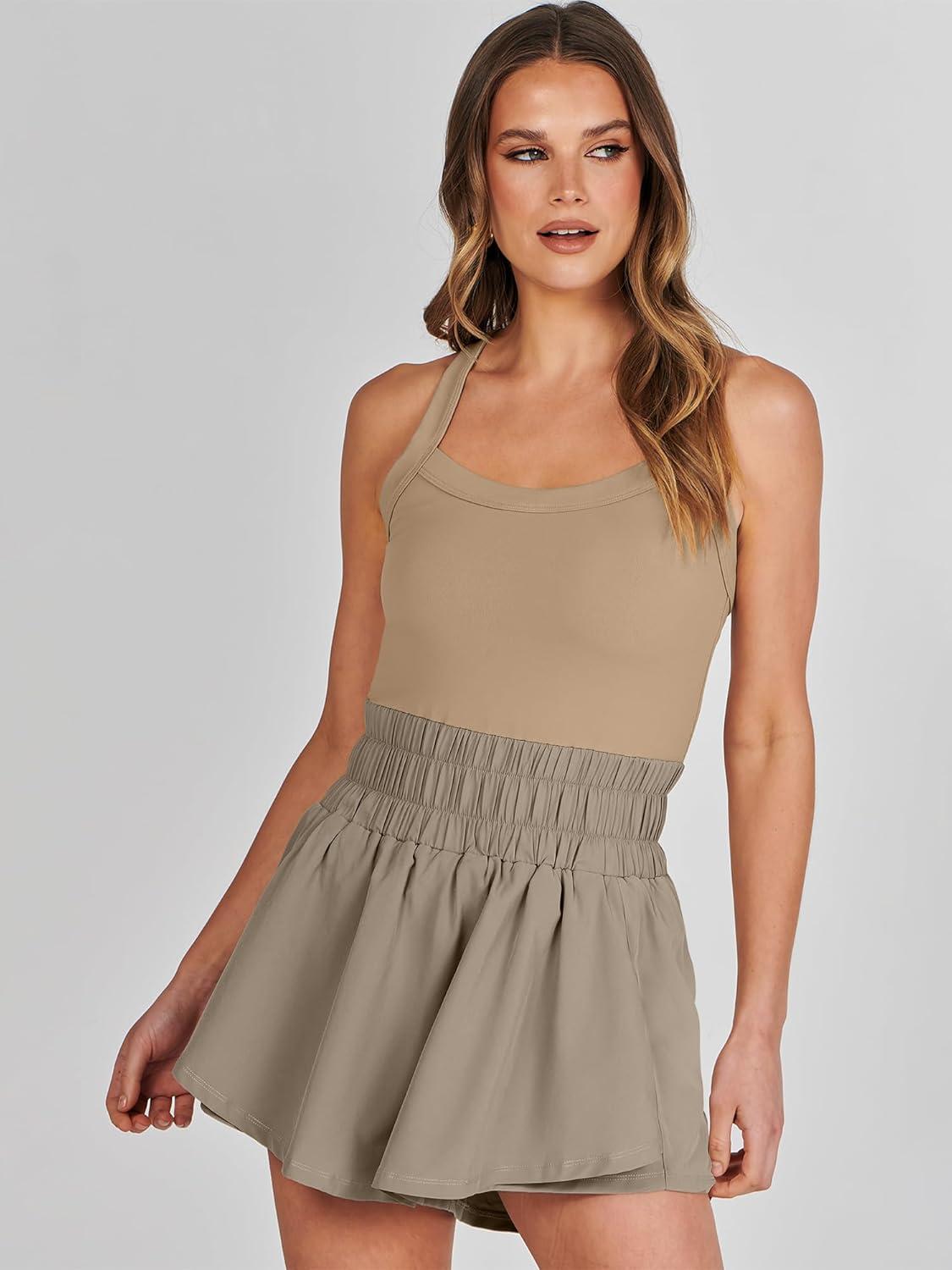 ANRABESS Womens Mini Tennis Dresses Skort Summer Sleeveless One Piece Workout Romper Dress with Shorts Athletic 2025 Outfit(Khaki)