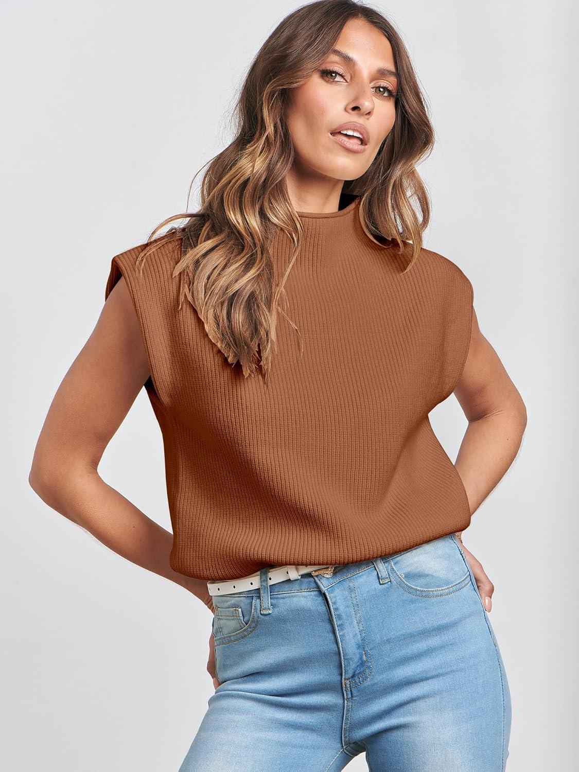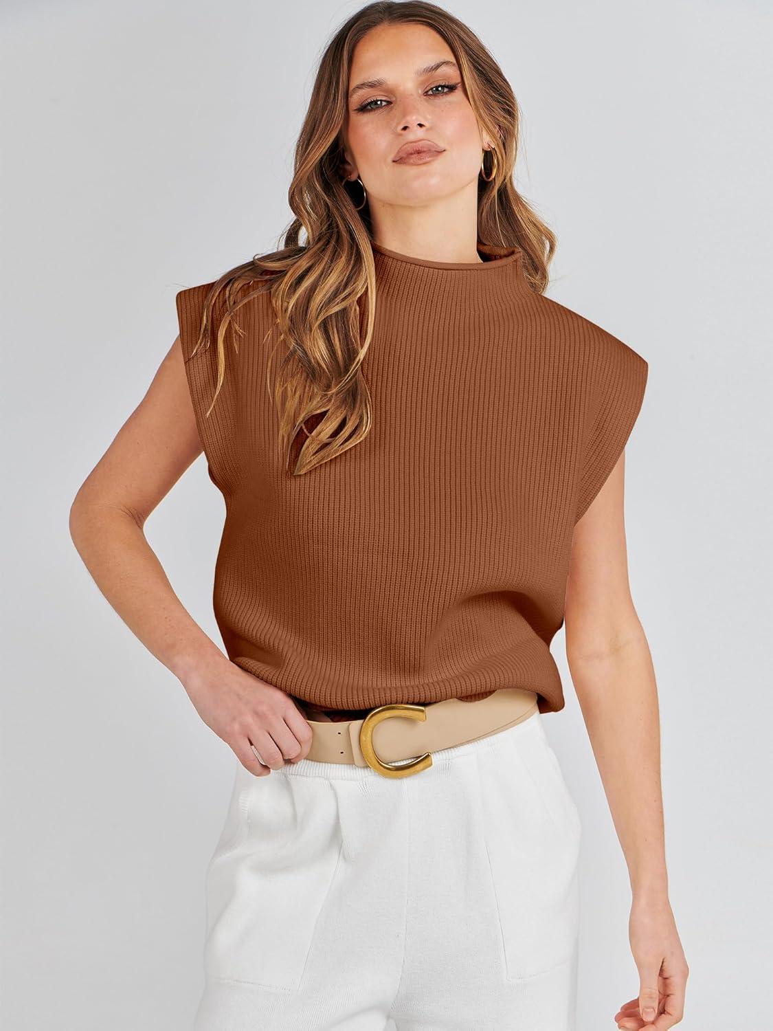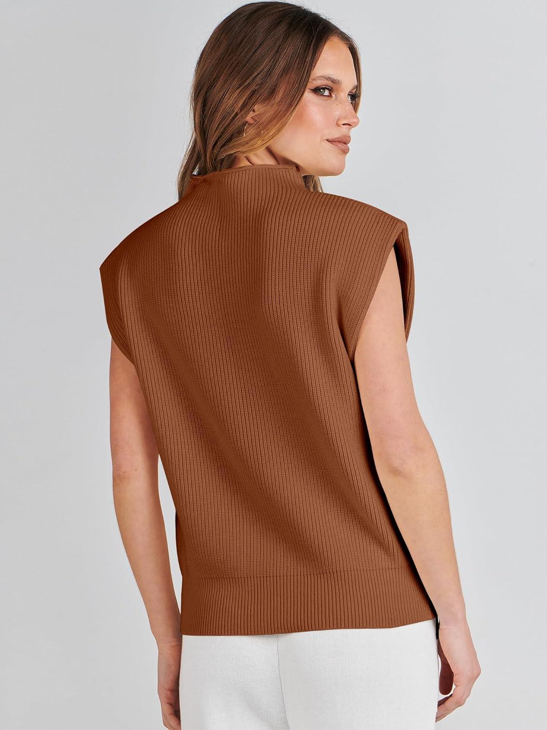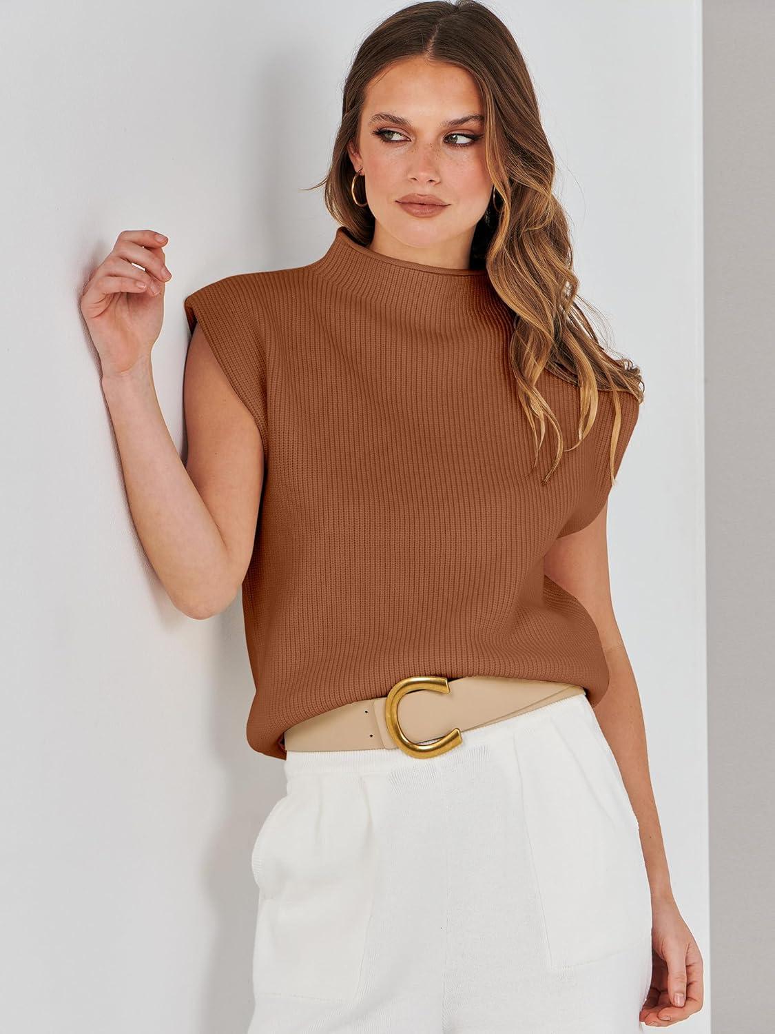 ANRABESS Women’s Mock Neck Sleeveless Sweater Vest Casual Cap Sleeve Knit Pullover Tank Tops 2026 Fall Clothes(Caramel)
