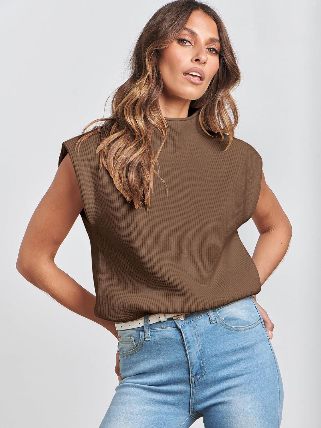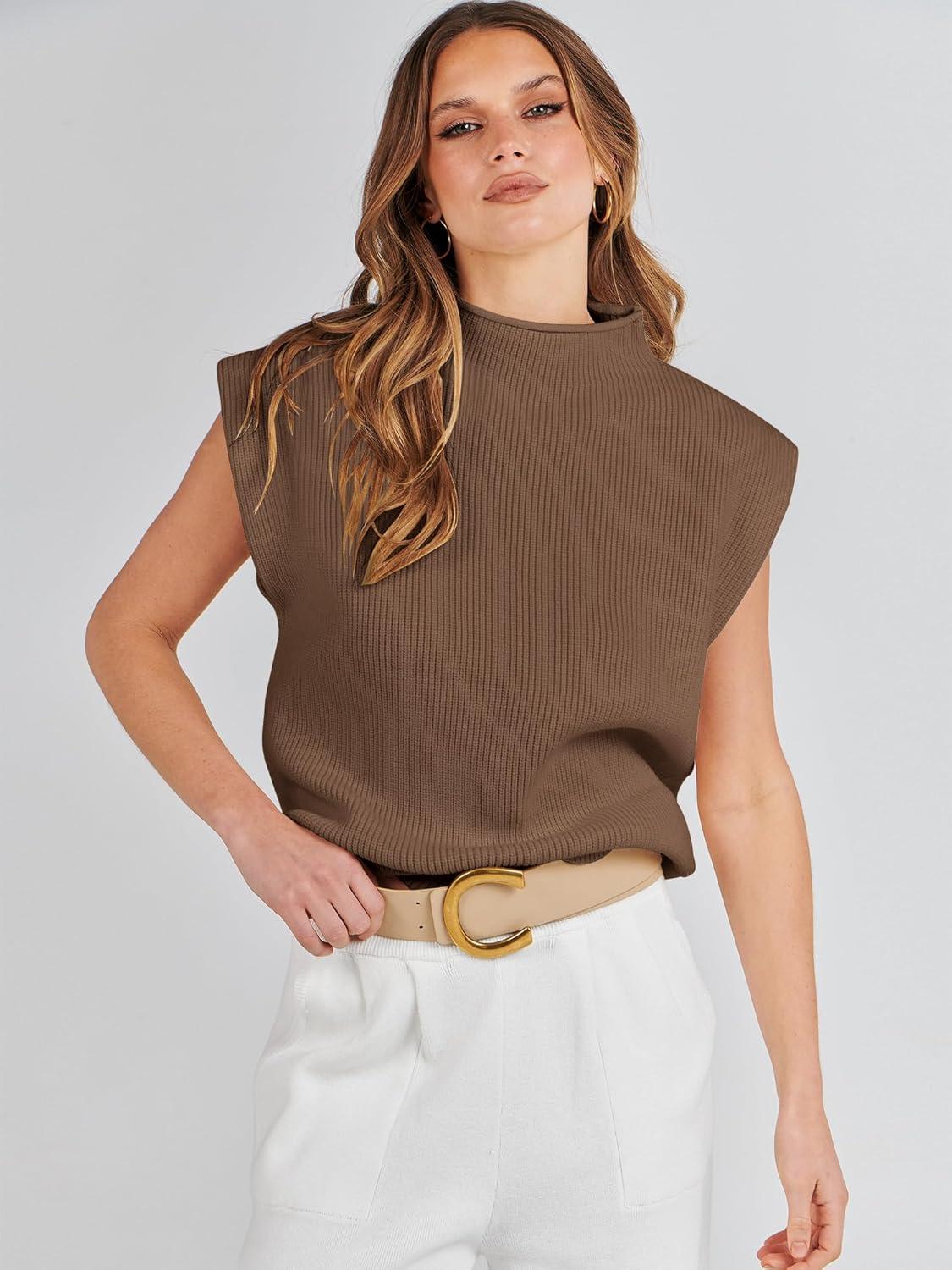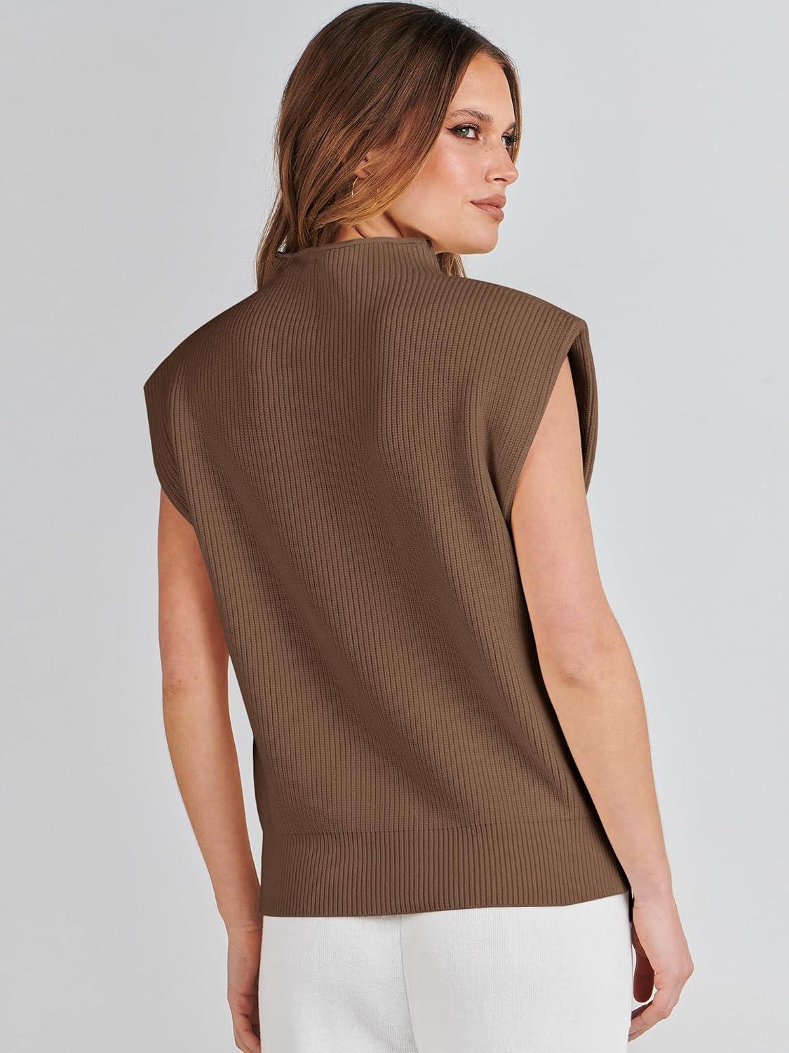 ANRABESS Women’s Mock Neck Sleeveless Sweater Vest Casual Cap Sleeve Knit Pullover Tank Tops 2026 Fall Clothes(Deep Brown)