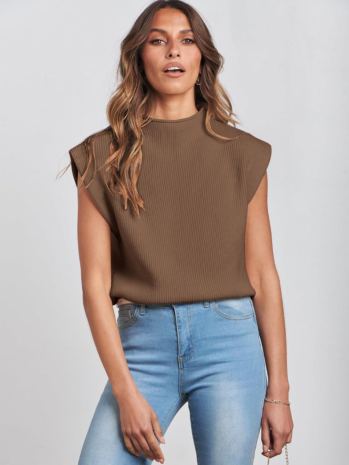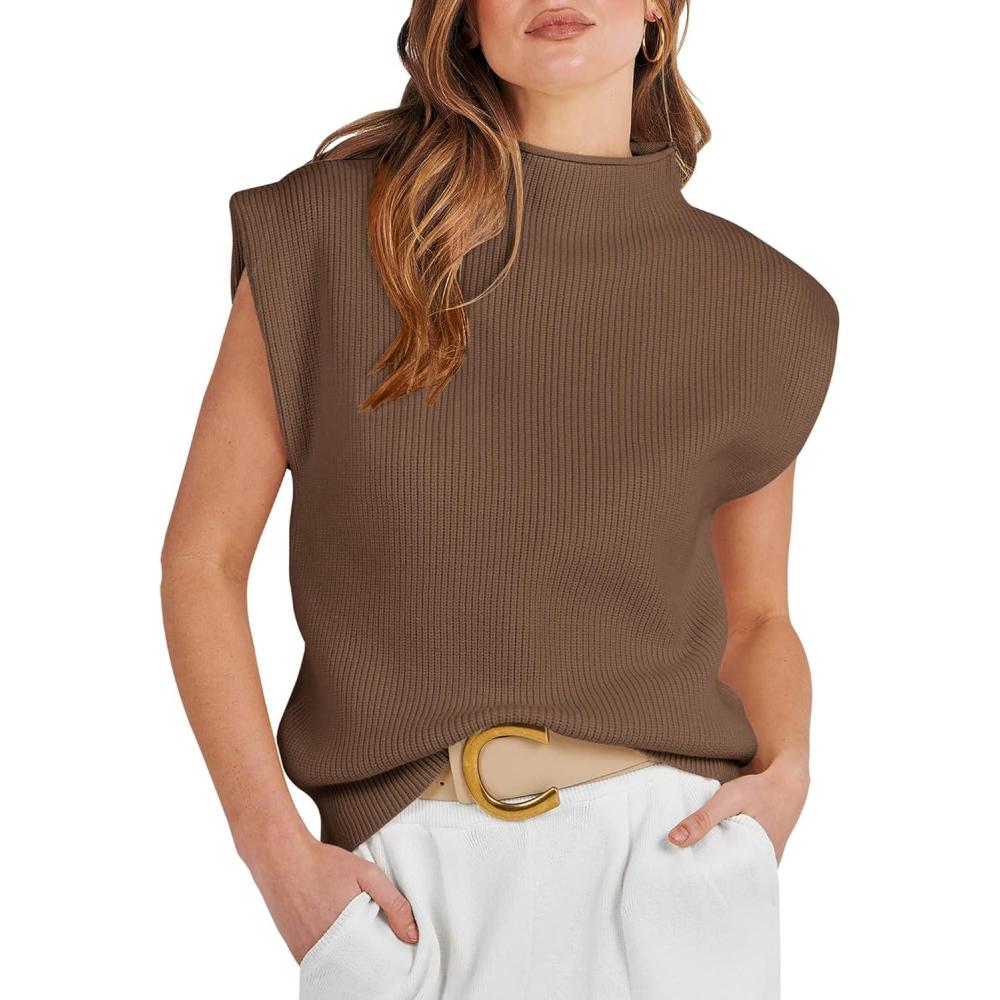 ANRABESS Women's Mock Neck Sleeveless Sweater Vest Casual Cap Sleeve Knit Pullover Tank Tops 2026 Fall Clothes(Deep Brown)
