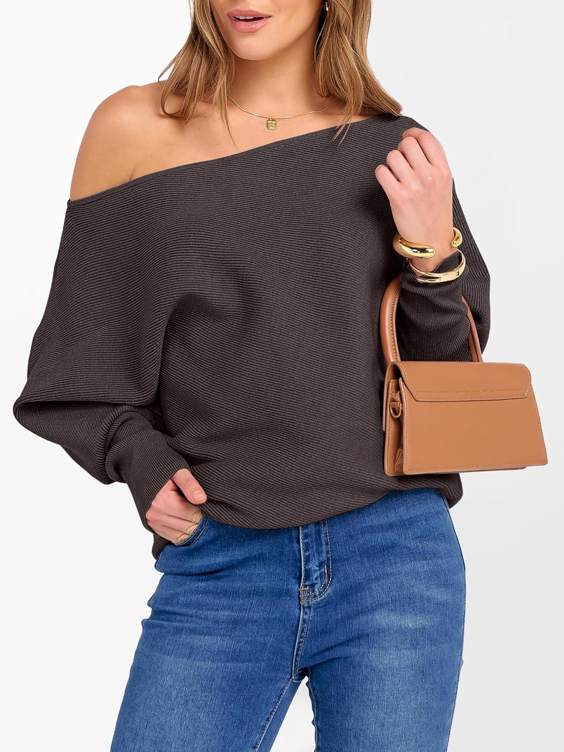 ANRABESS Womens Off Shoulder Sweaters 2025 Fall Long Batwing Sleeve Loose Fit Knit Tops Casual Pullovers Jumpers(Red Coffee)