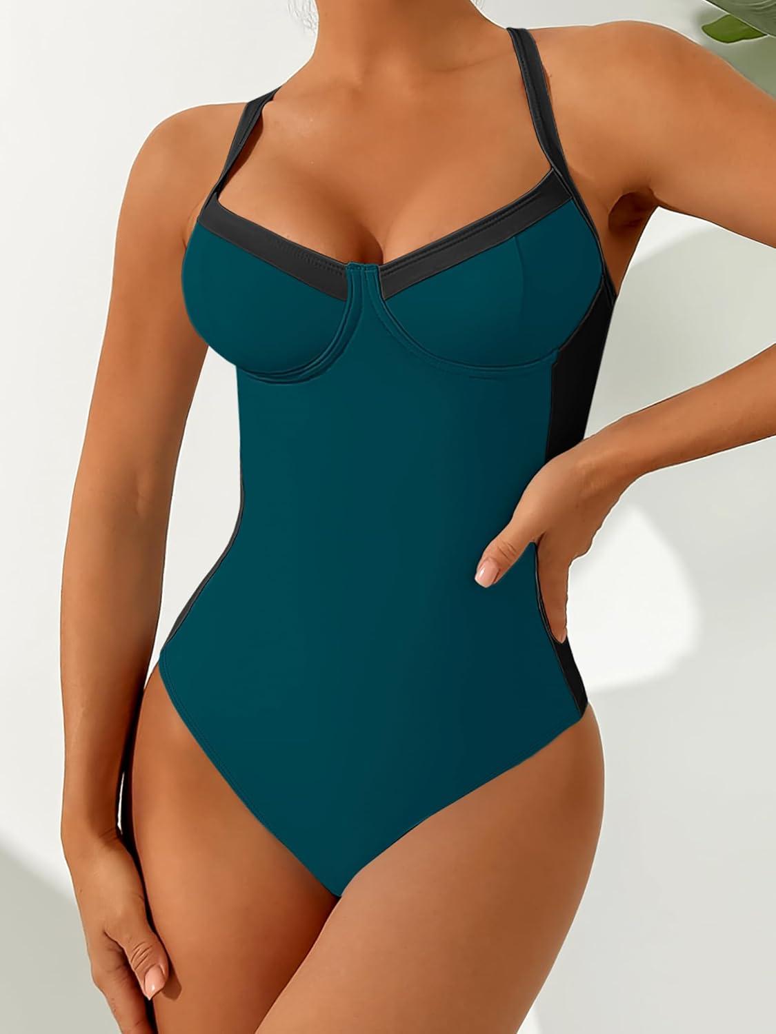 ANRABESS Womens One Piece Swimsuit Slimming Color Block Bathing Suit Full Coverage Swimwear 2026 Beach Vacation Clothes(Dark Green Black)