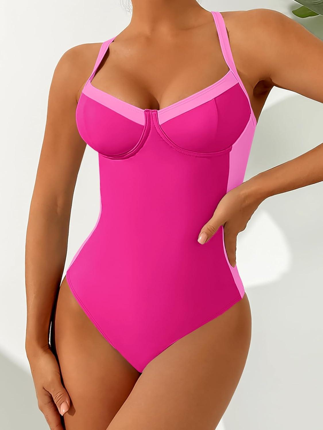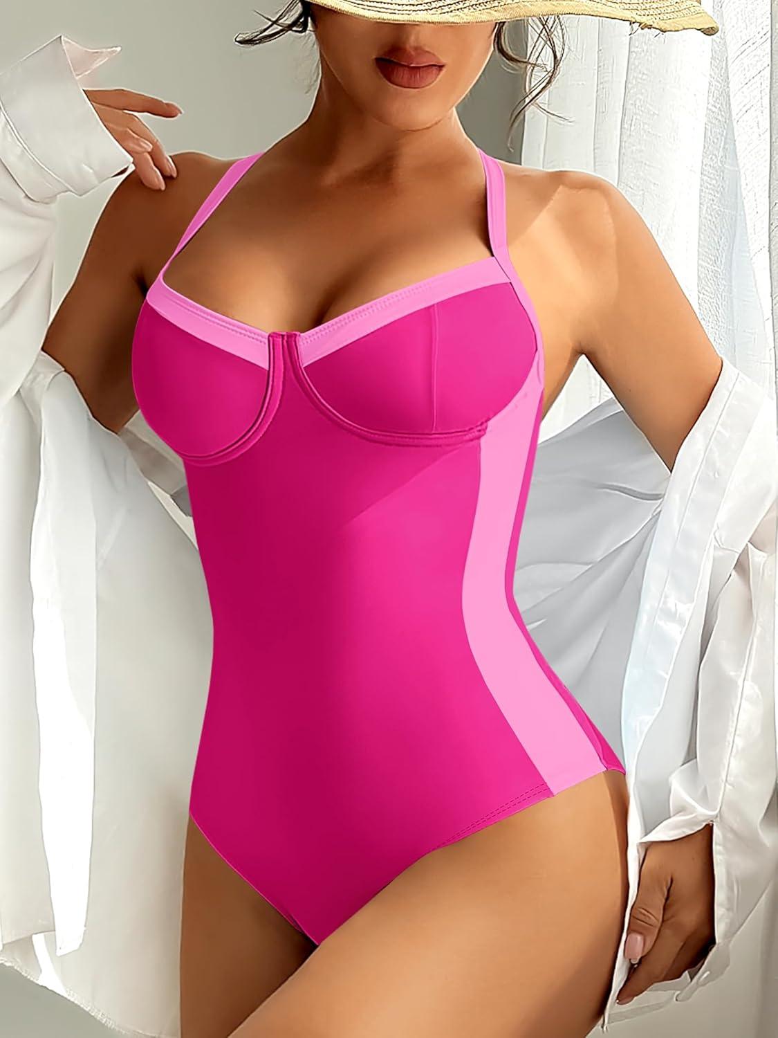 ANRABESS Womens One Piece Swimsuit Slimming Color Block Bathing Suit Full Coverage Swimwear 2026 Beach Vacation Clothes(Hot Pink)