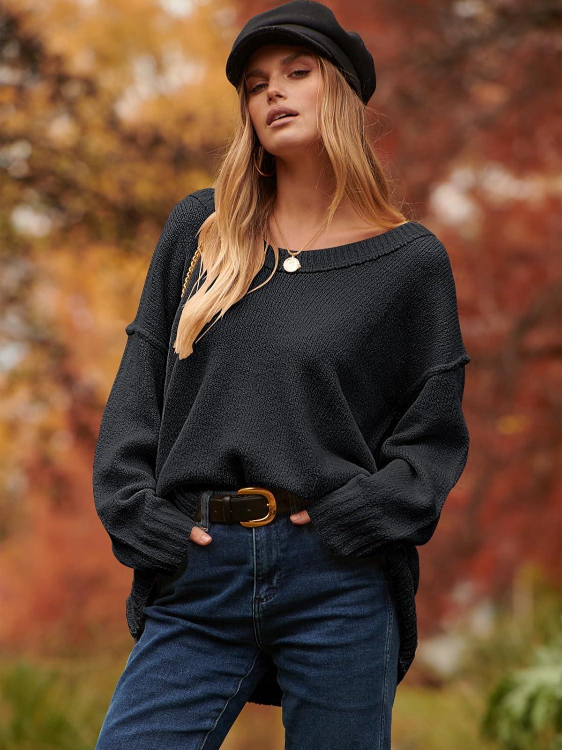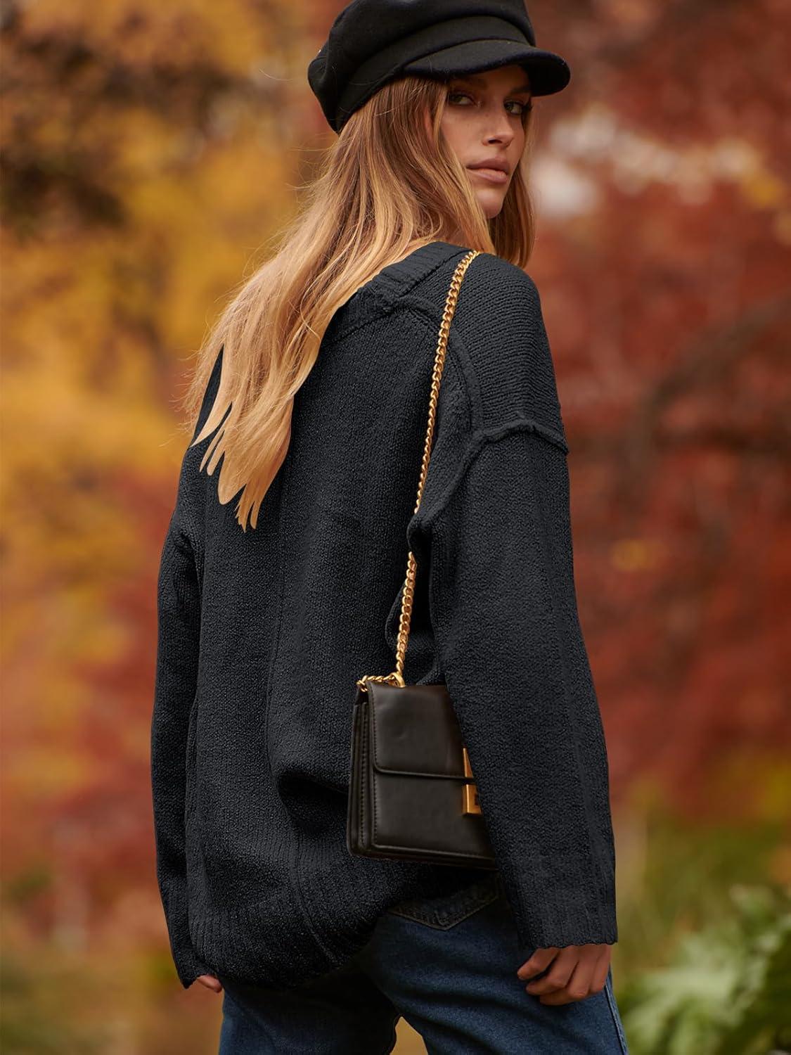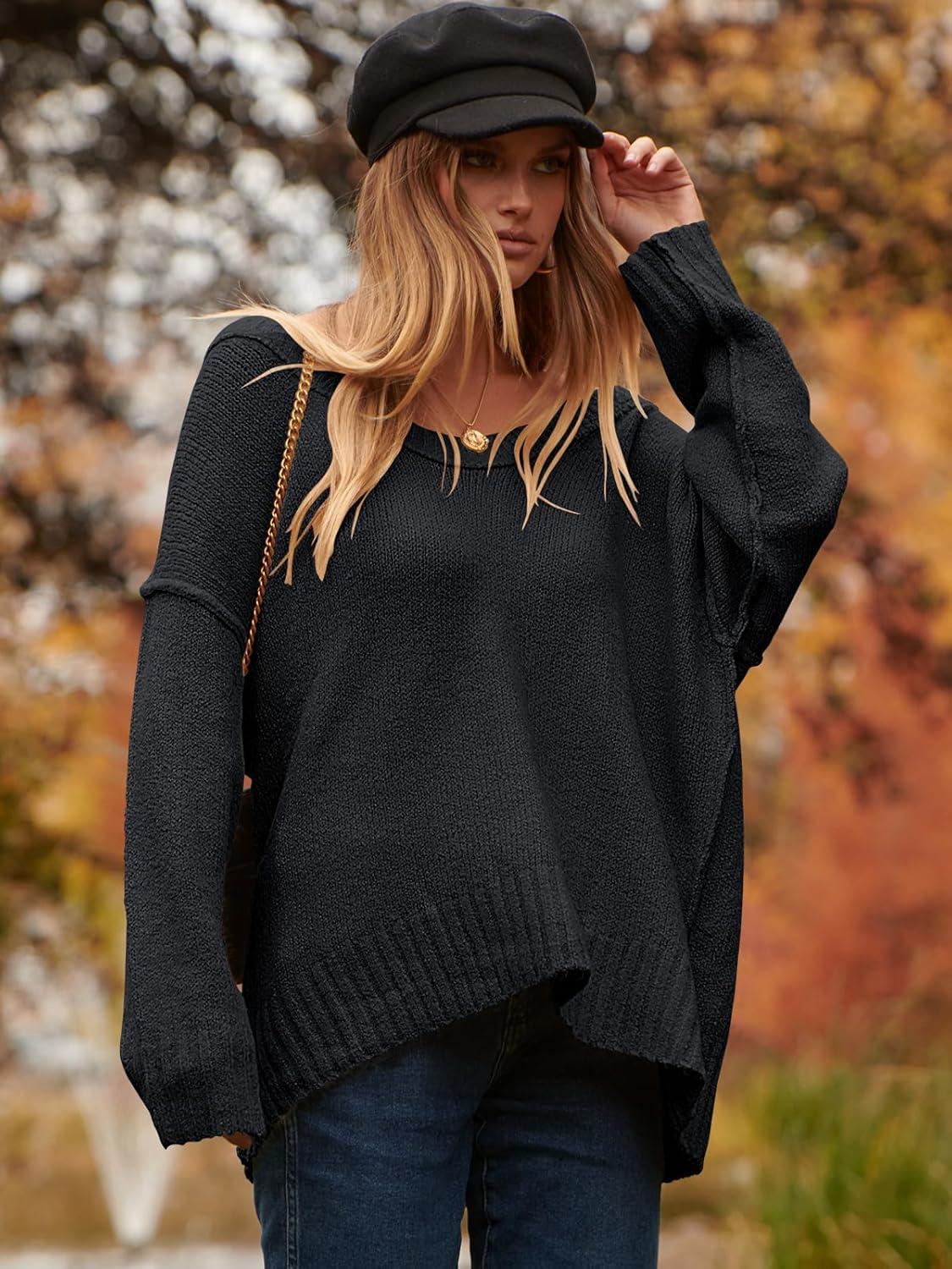 ANRABESS Women’s Oversized Casual Loose Slouchy Scoop V Neck Batwing Long Sleeve Knit 2025 Fall Pullover Sweaters(Black)