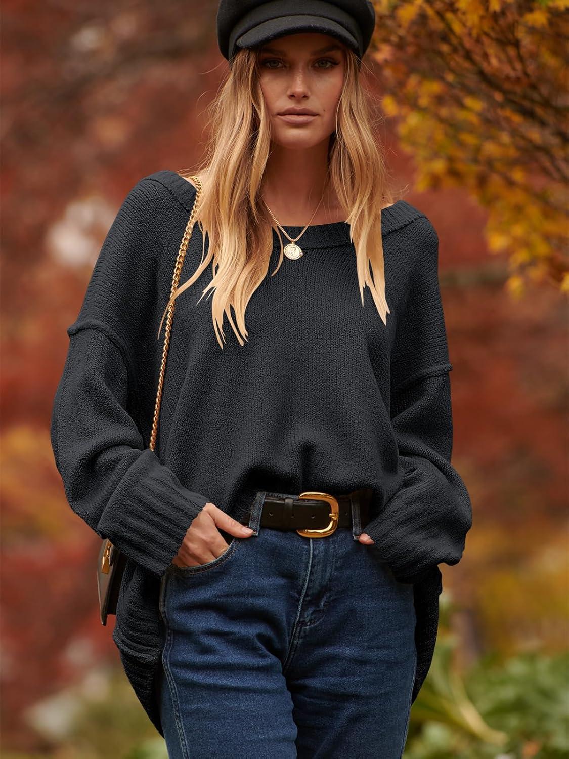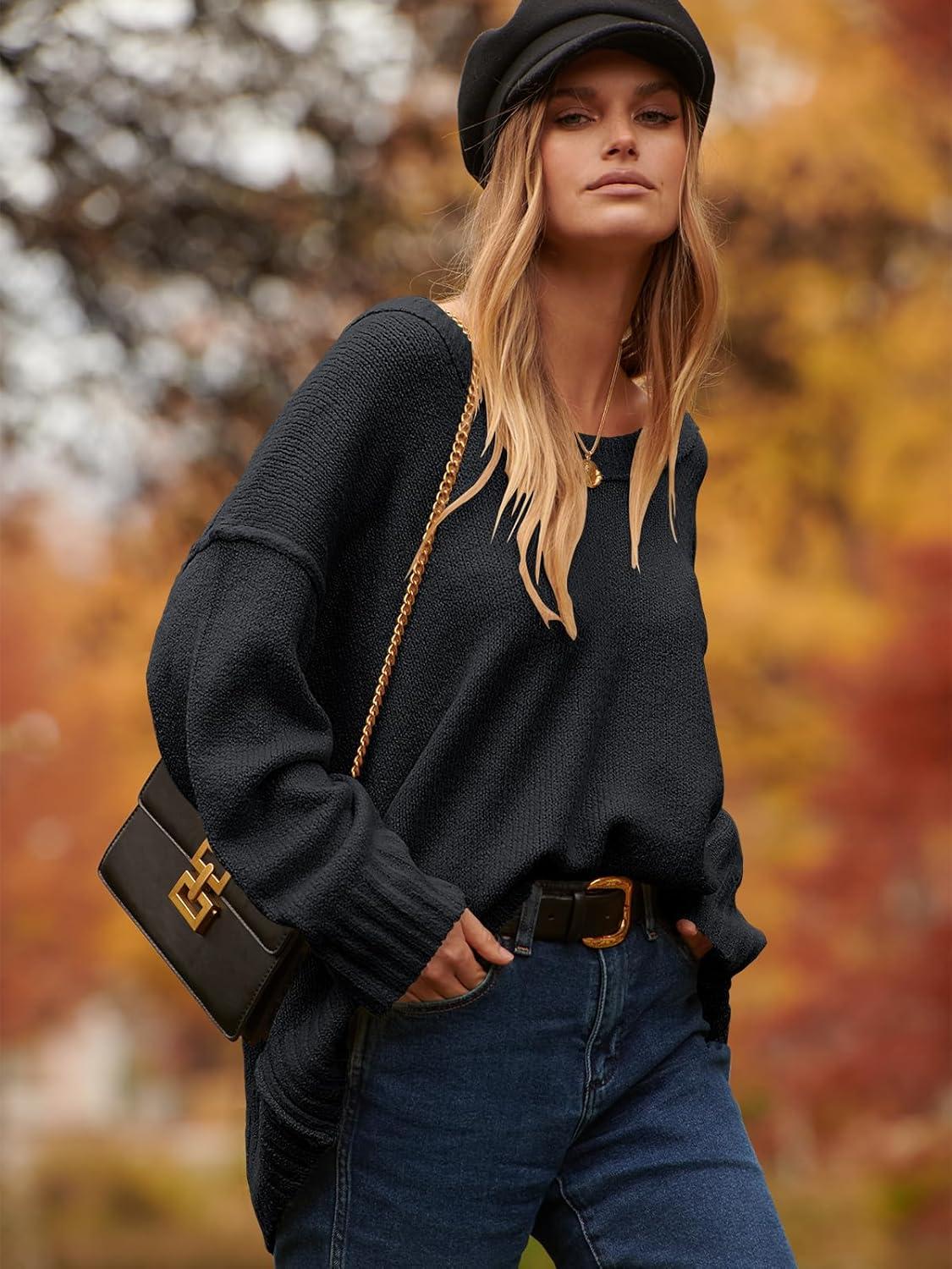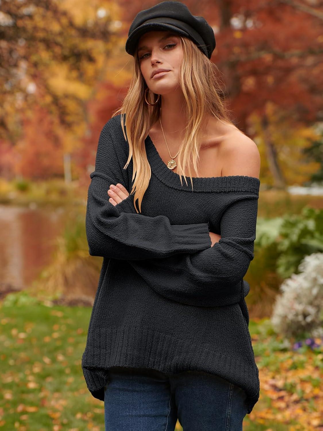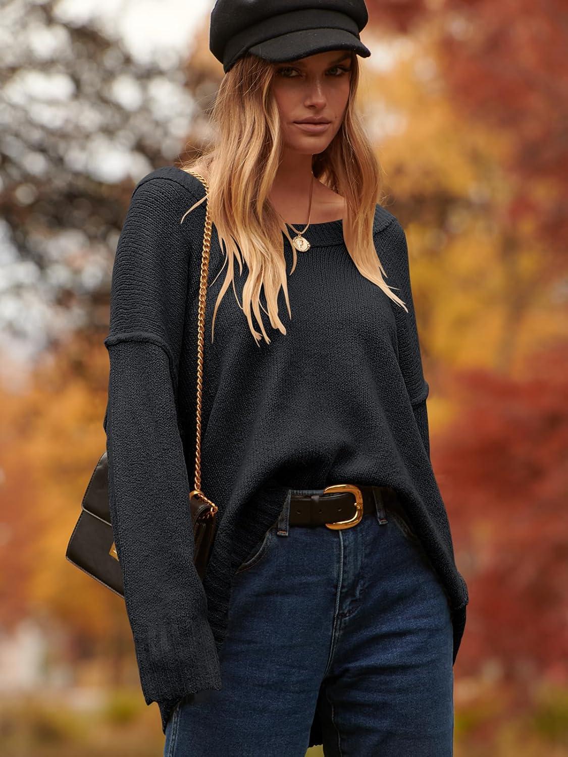 ANRABESS Women’s Oversized Casual Loose Slouchy Scoop V Neck Batwing Long Sleeve Knit 2025 Fall Pullover Sweaters(Black)