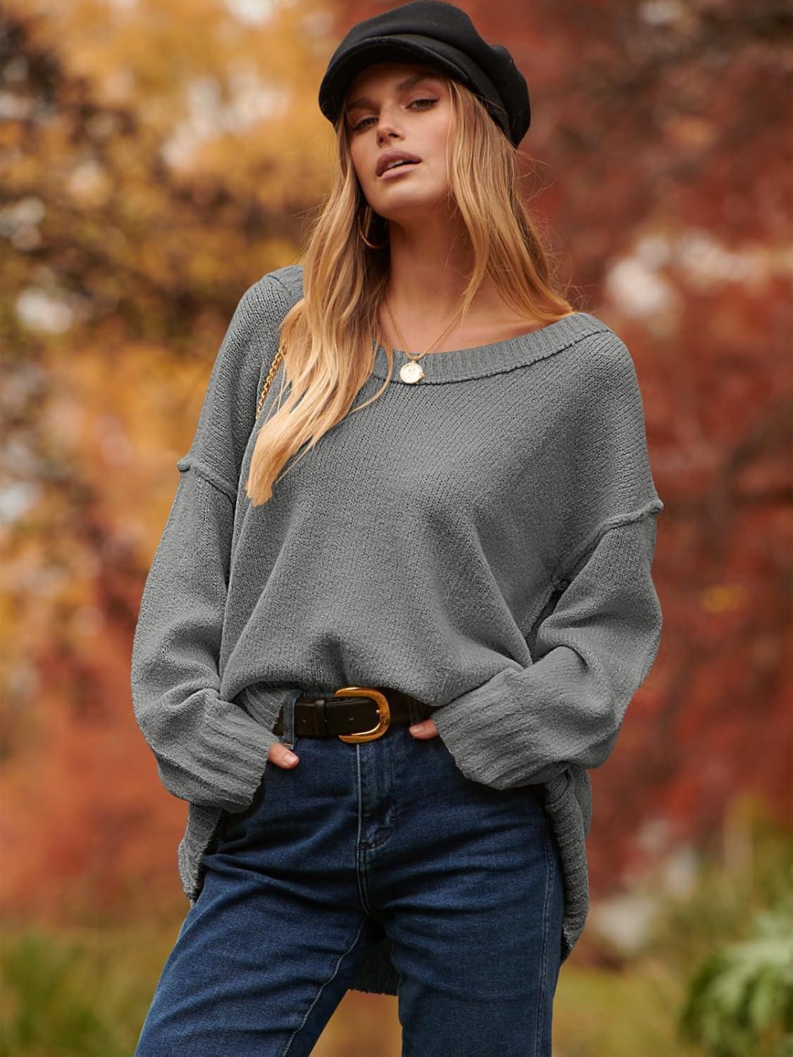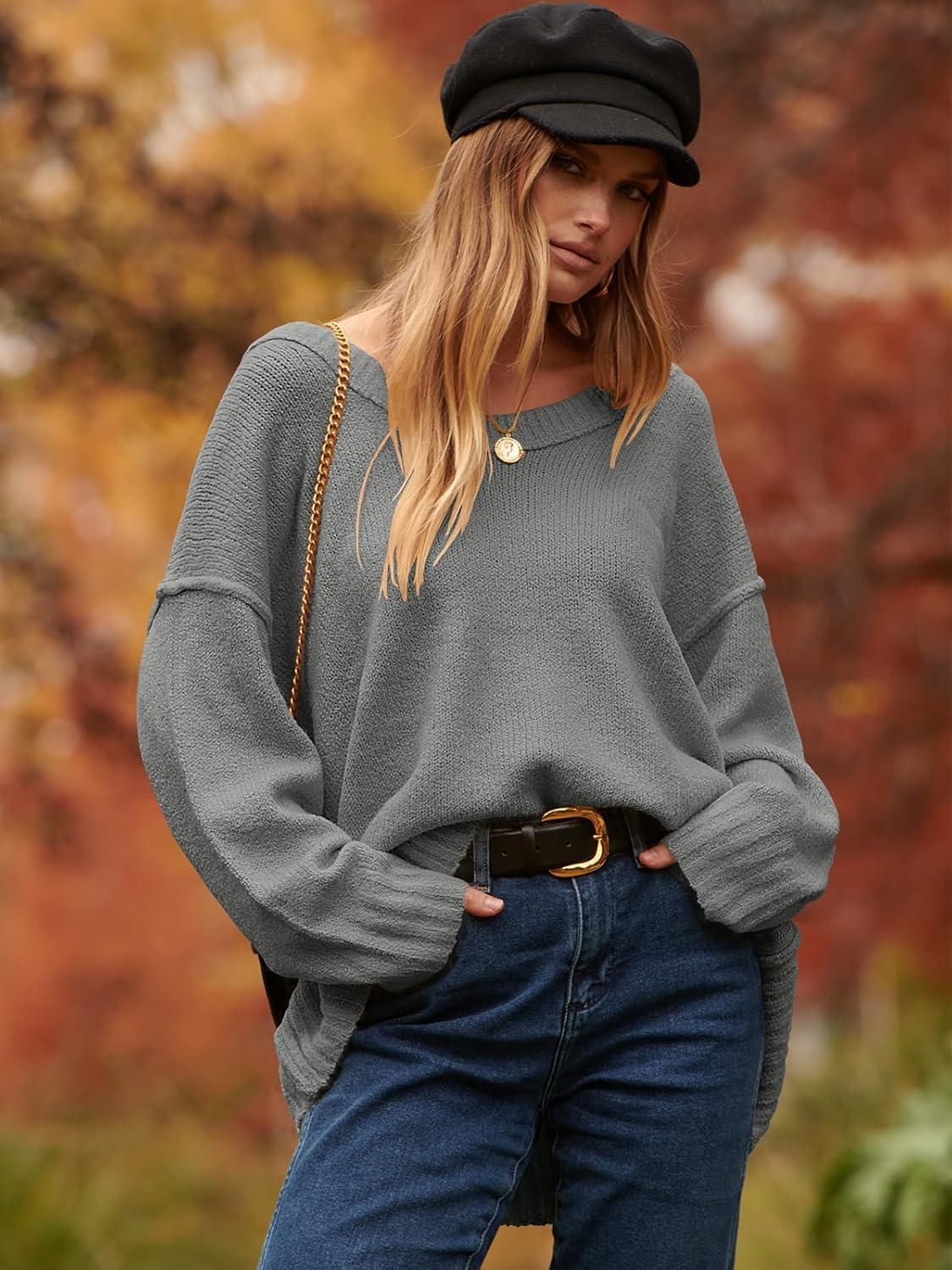 ANRABESS Women's Oversized Casual Loose Slouchy Scoop V Neck Batwing Long Sleeve Knit 2025 Fall Pullover Sweaters(Dark Gray)