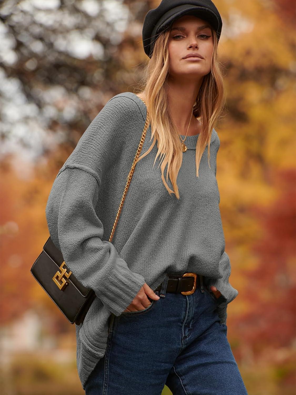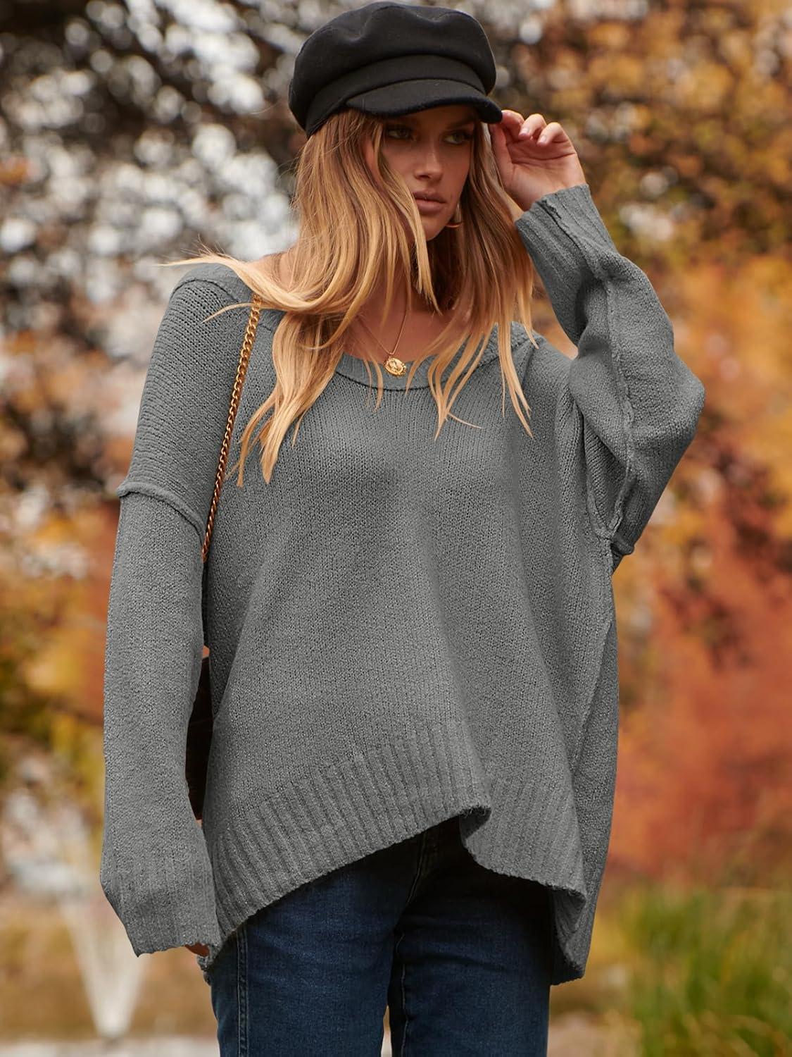 ANRABESS Women’s Oversized Casual Loose Slouchy Scoop V Neck Batwing Long Sleeve Knit 2025 Fall Pullover Sweaters(Dark Gray)