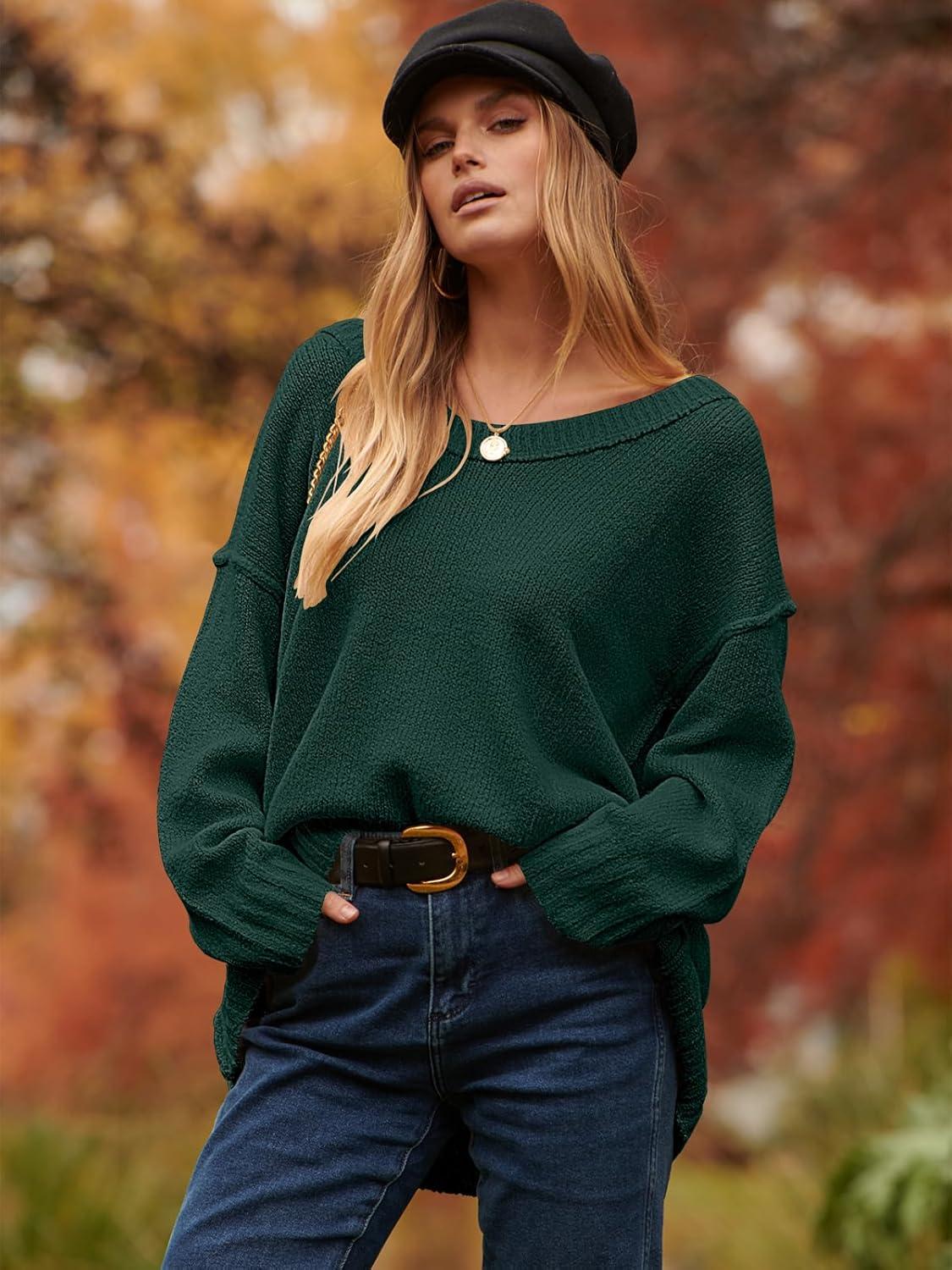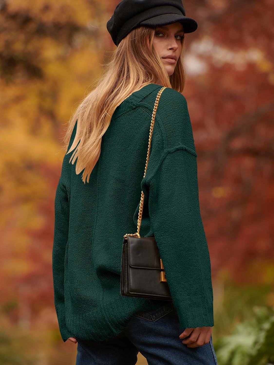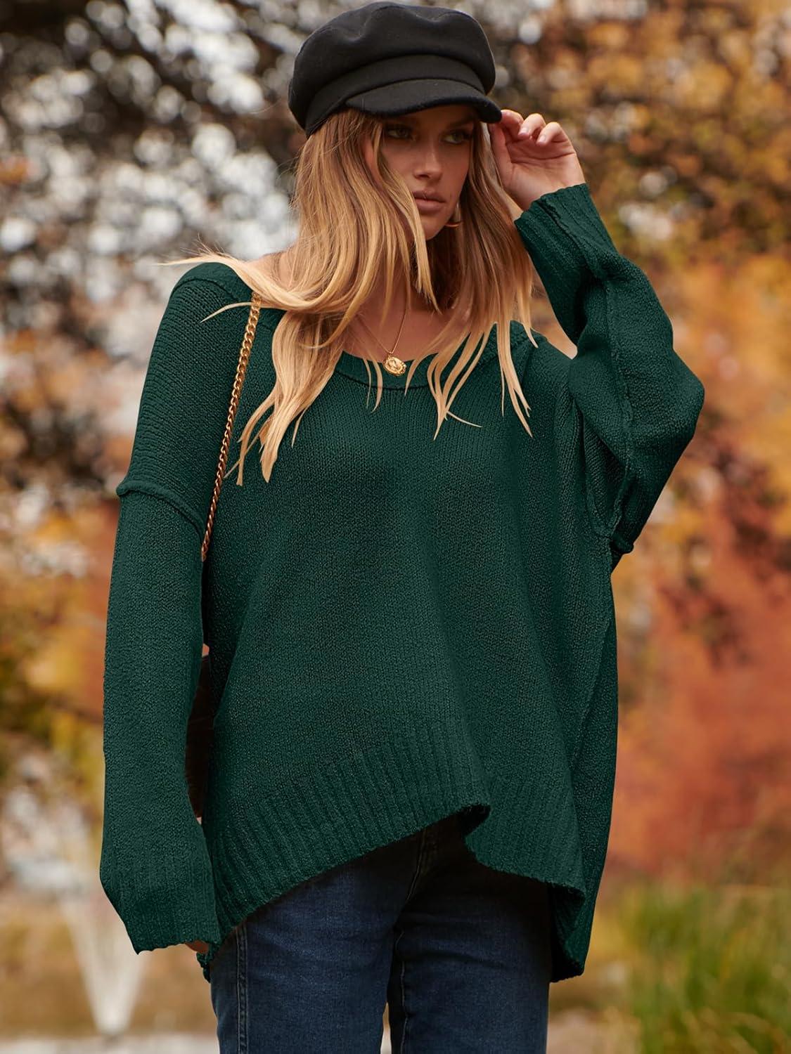ANRABESS Women’s Oversized Casual Loose Slouchy Scoop V Neck Batwing Long Sleeve Knit 2025 Fall Pullover Sweaters(Dark Green)