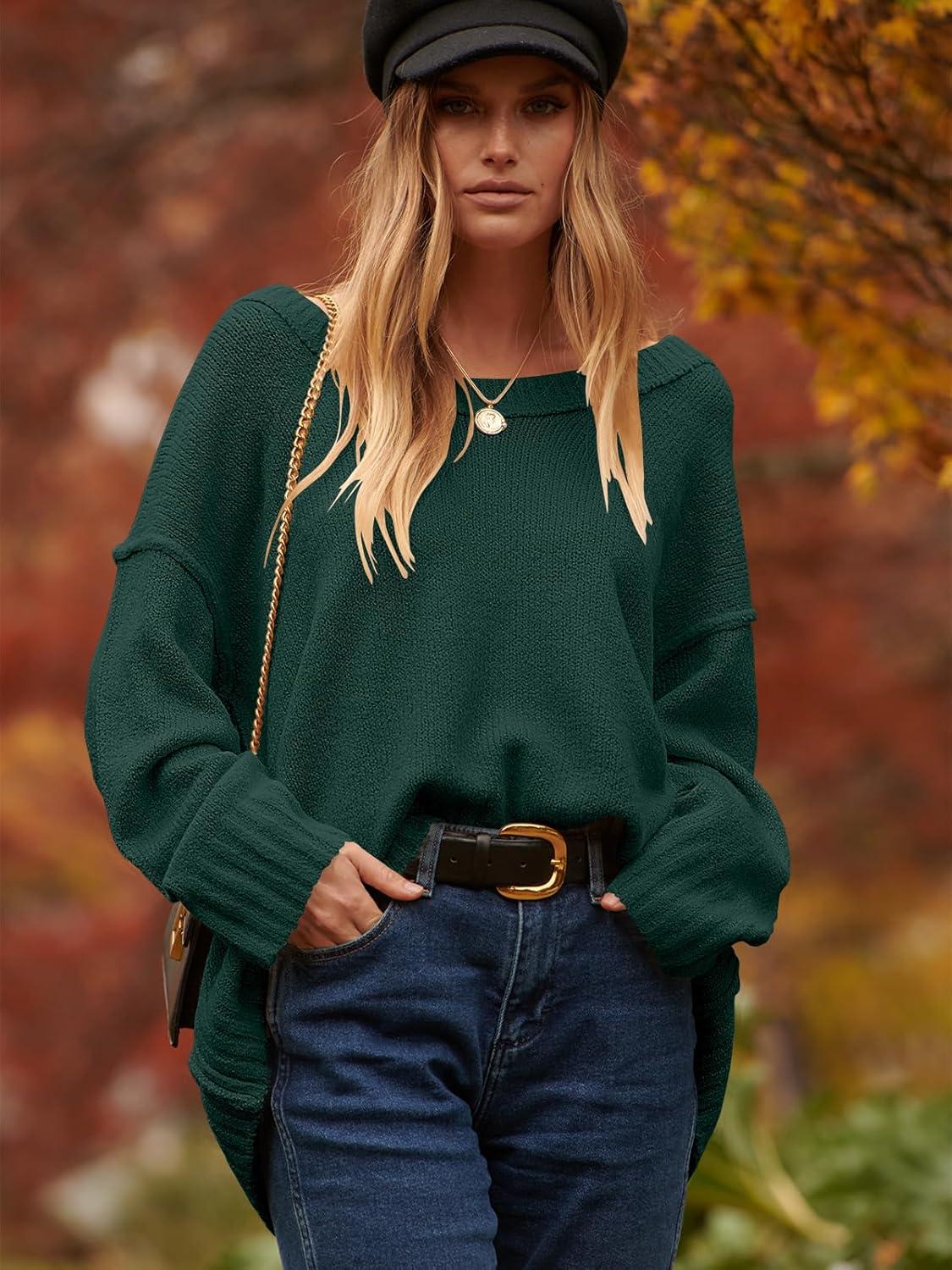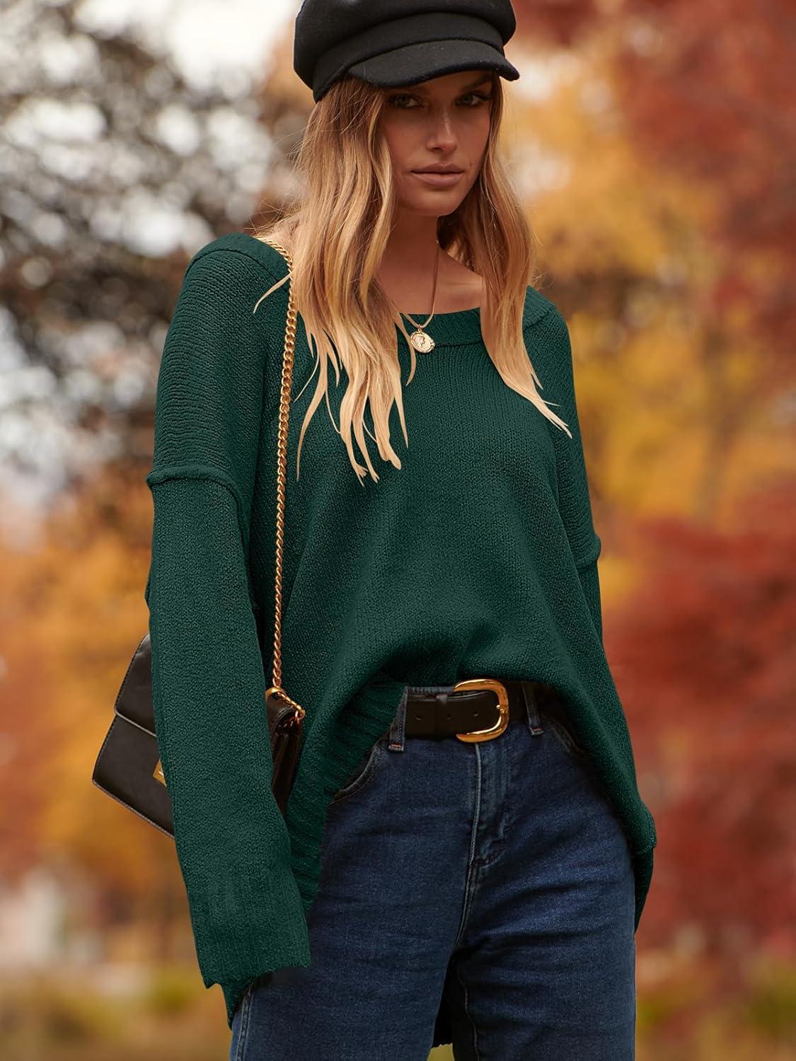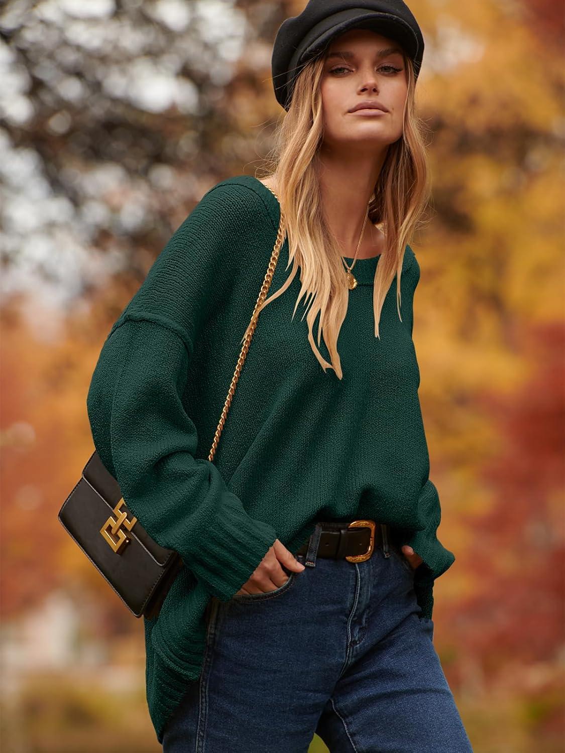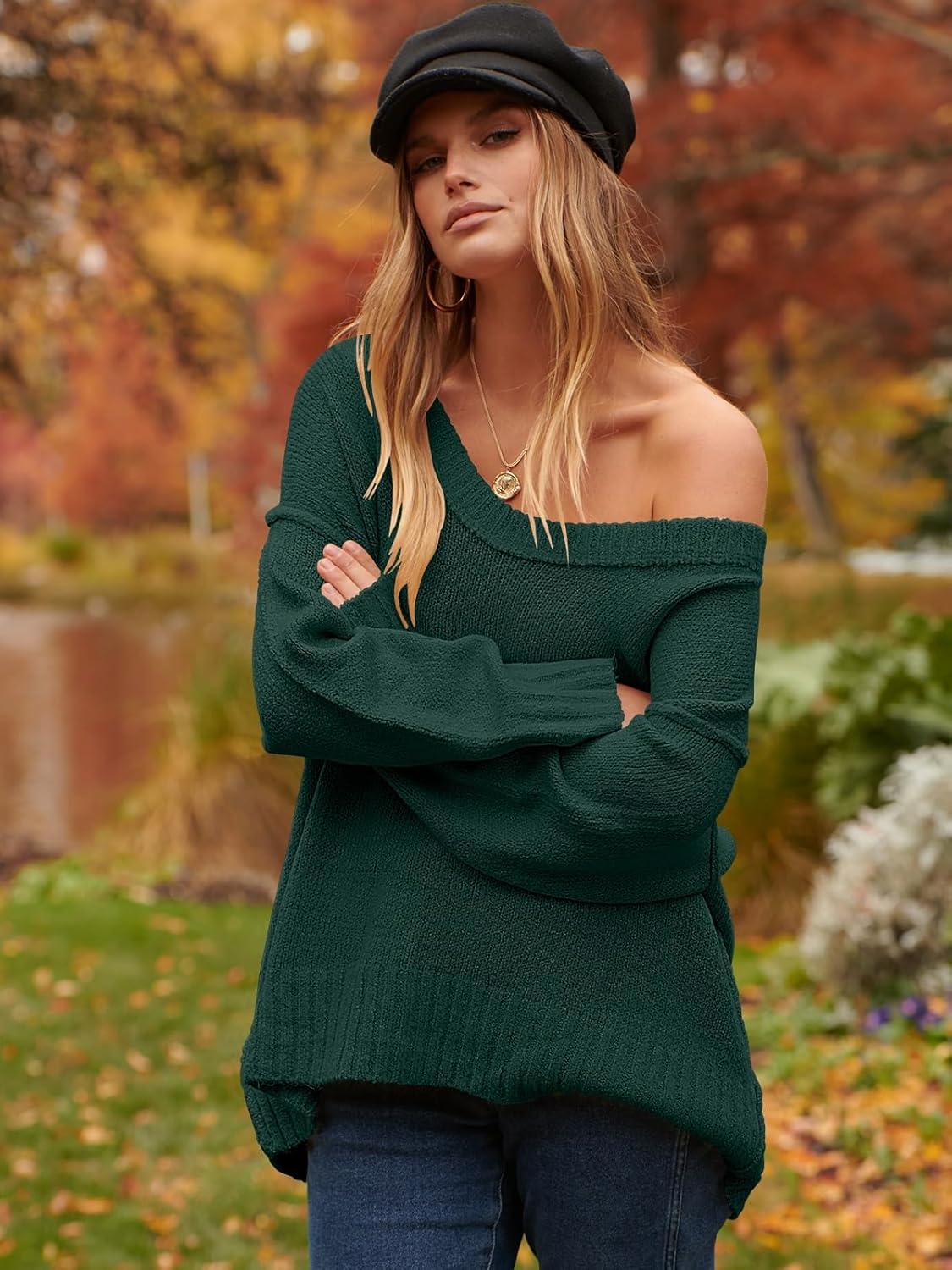 ANRABESS Women’s Oversized Casual Loose Slouchy Scoop V Neck Batwing Long Sleeve Knit 2025 Fall Pullover Sweaters(Dark Green)