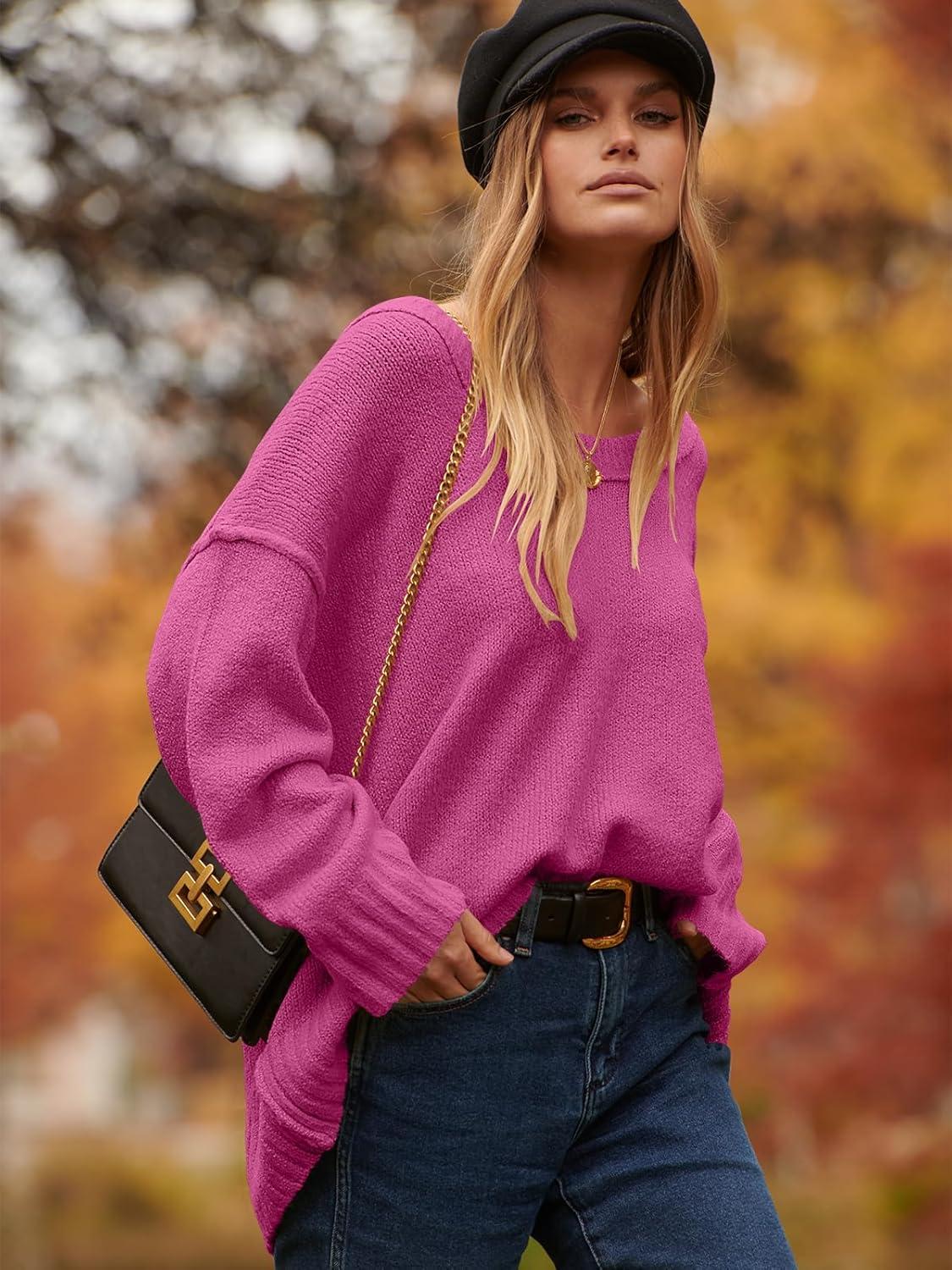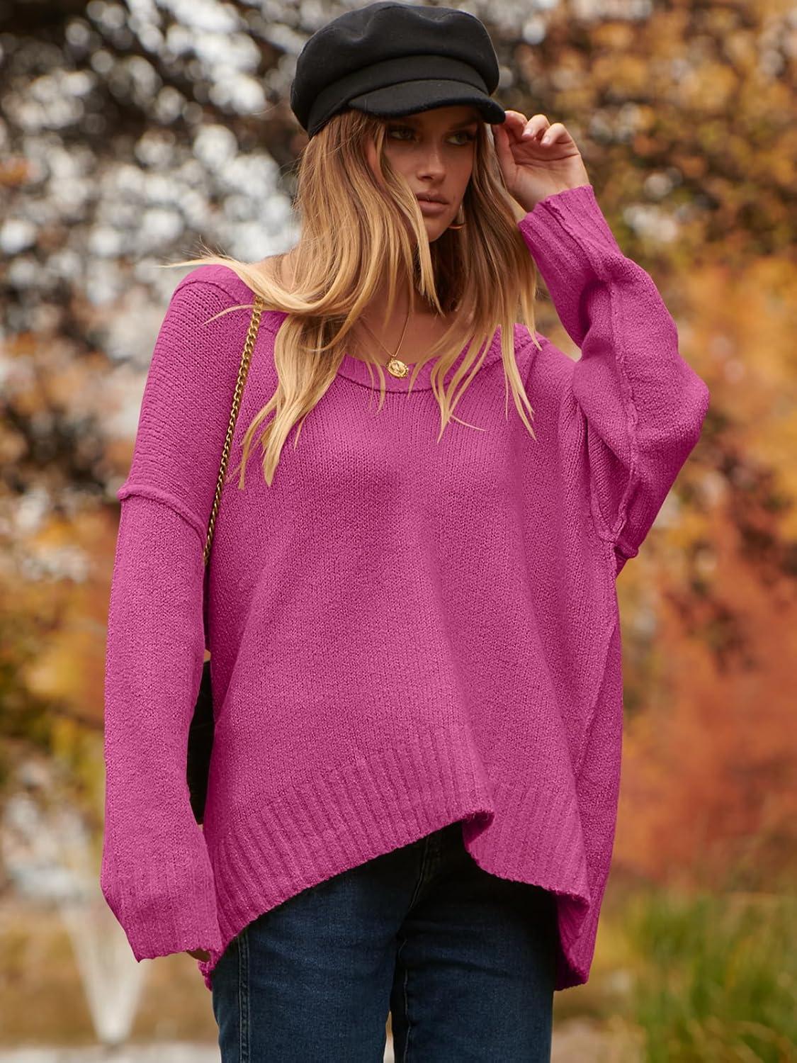 ANRABESS Women's Oversized Casual Loose Slouchy Scoop V Neck Batwing Long Sleeve Knit 2025 Fall Pullover Sweaters(Rose)