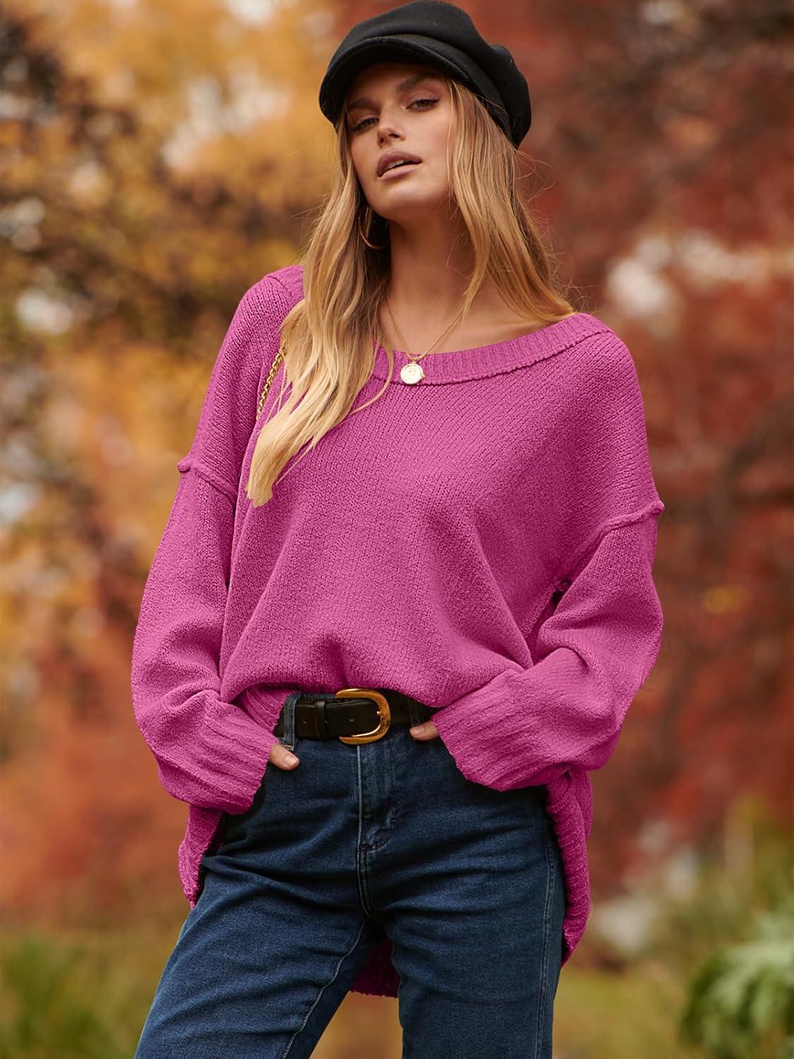ANRABESS Women’s Oversized Casual Loose Slouchy Scoop V Neck Batwing Long Sleeve Knit 2025 Fall Pullover Sweaters(Rose)