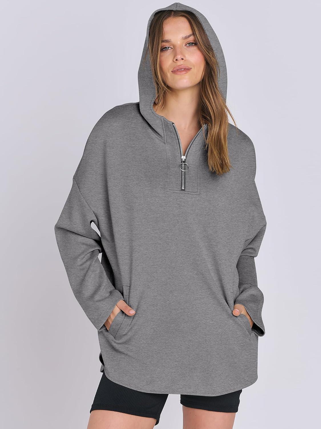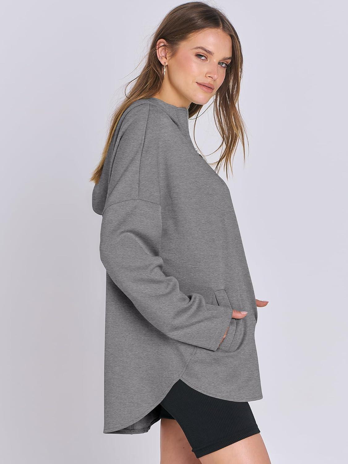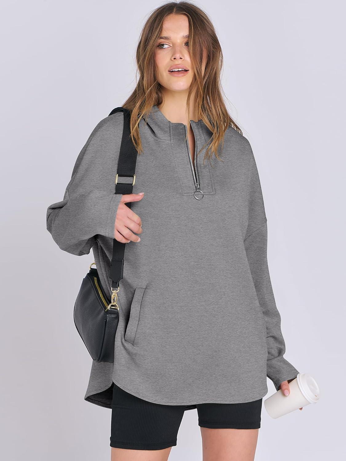 ANRABESS Womens Oversized Hoodie Quarter Zip Sweatshirts 2025 Fall Winter Tunic Pullover Top Trendy Teen Girls Preppy Clothes(Grey)