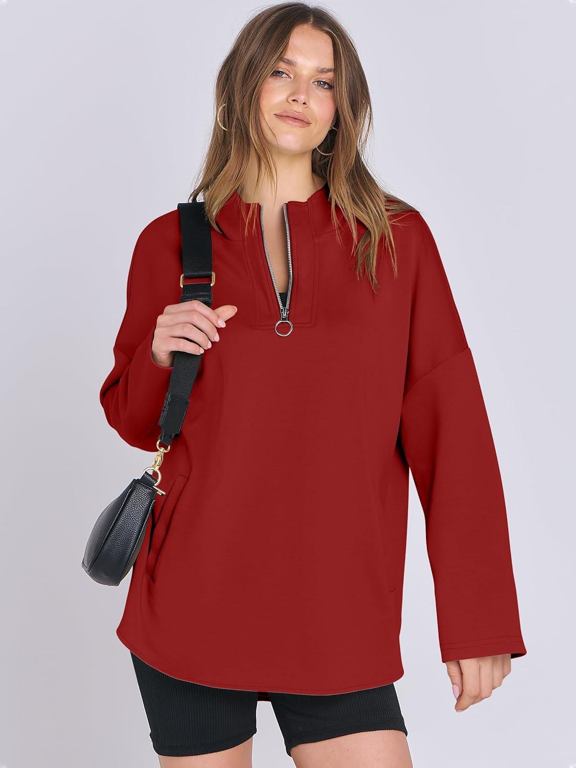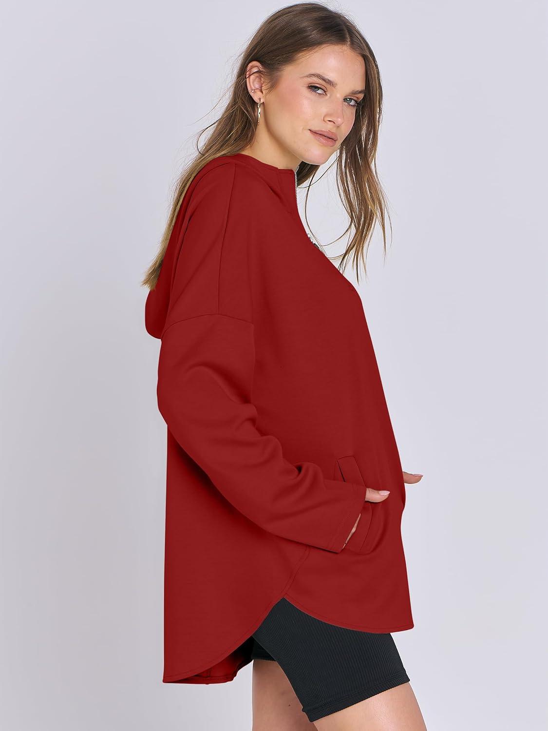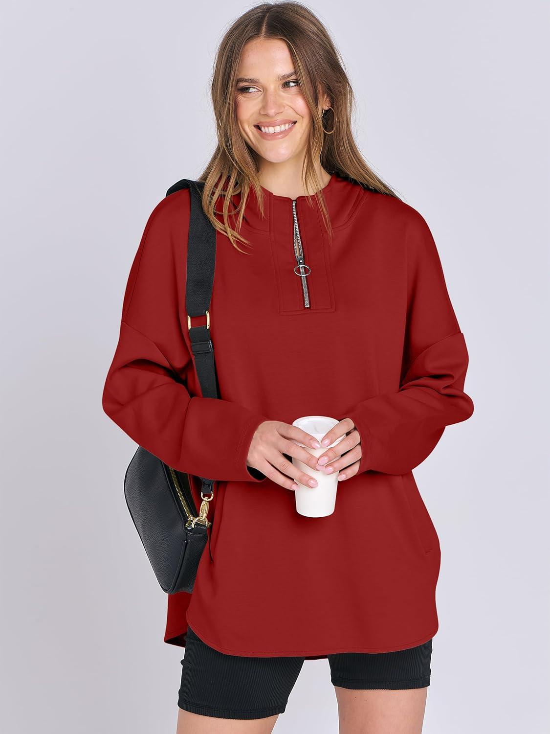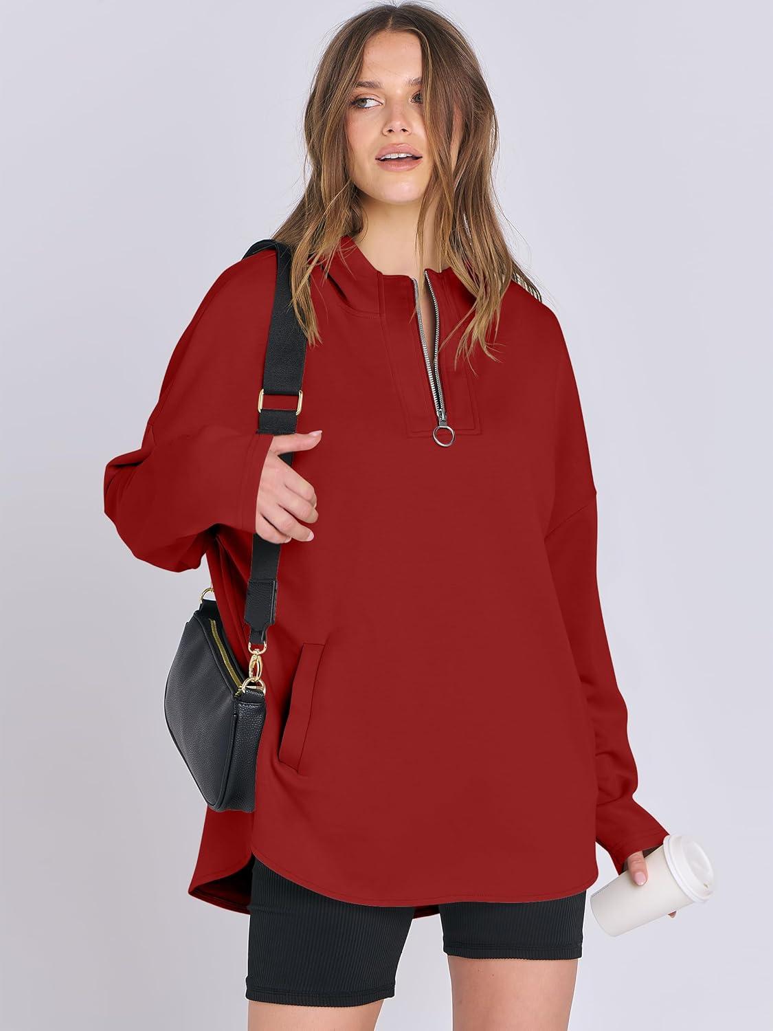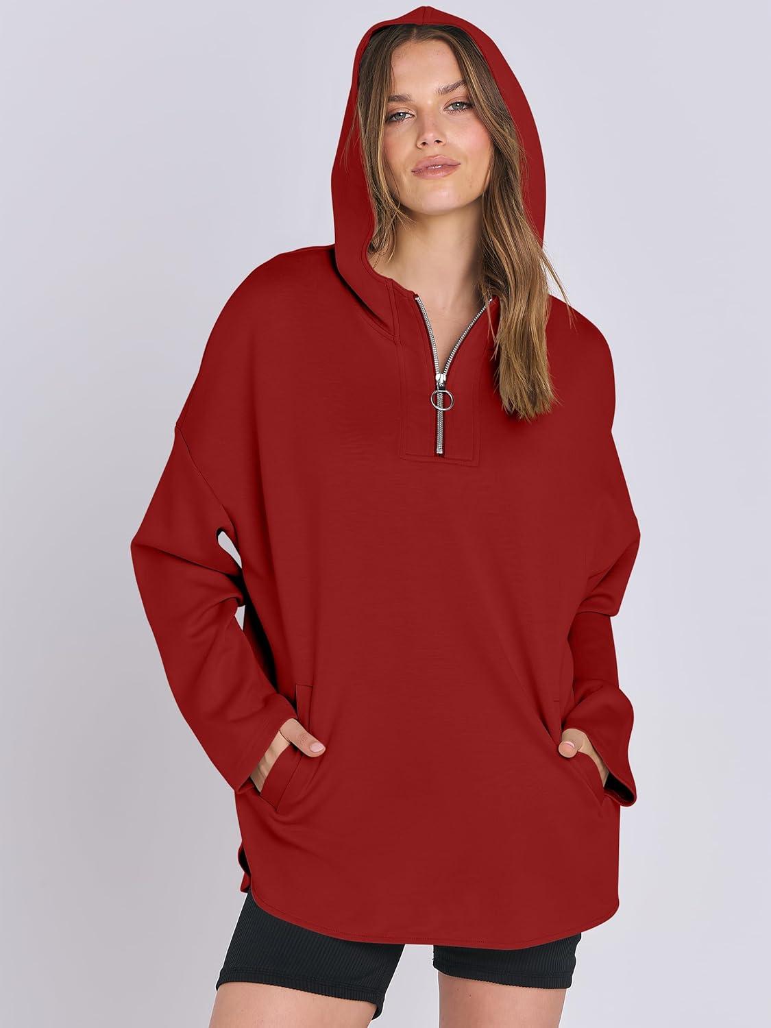 ANRABESS Womens Oversized Hoodie Quarter Zip Sweatshirts 2025 Fall Winter Tunic Pullover Top Trendy Teen Girls Preppy Clothes(Red)