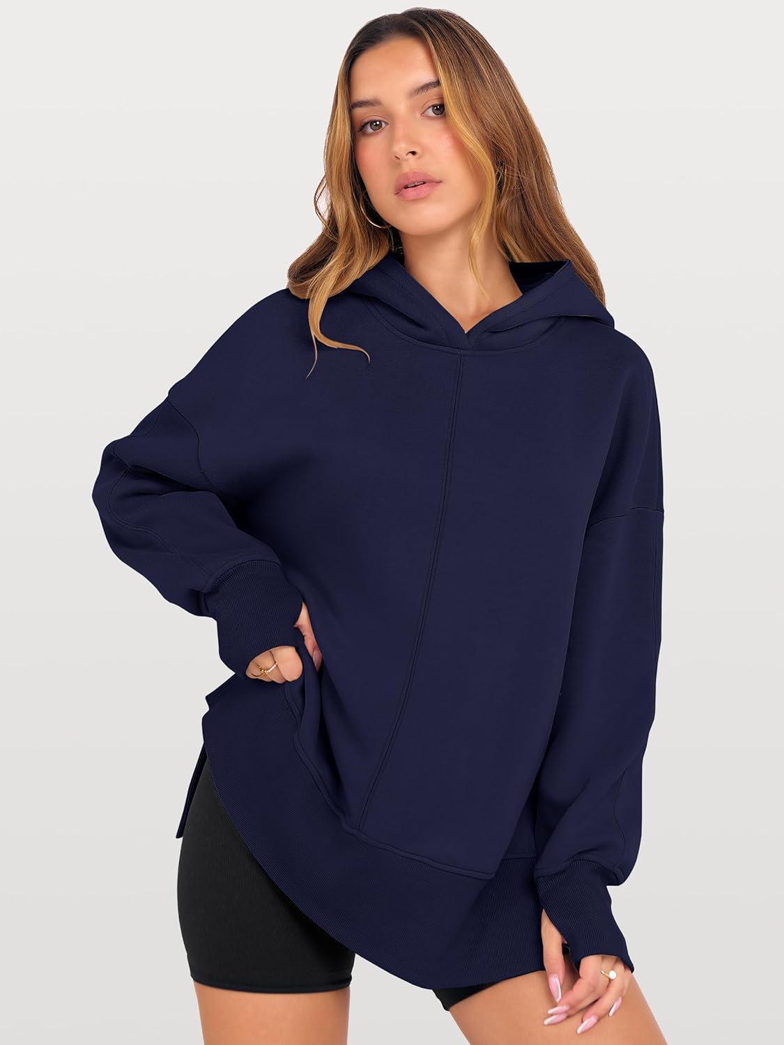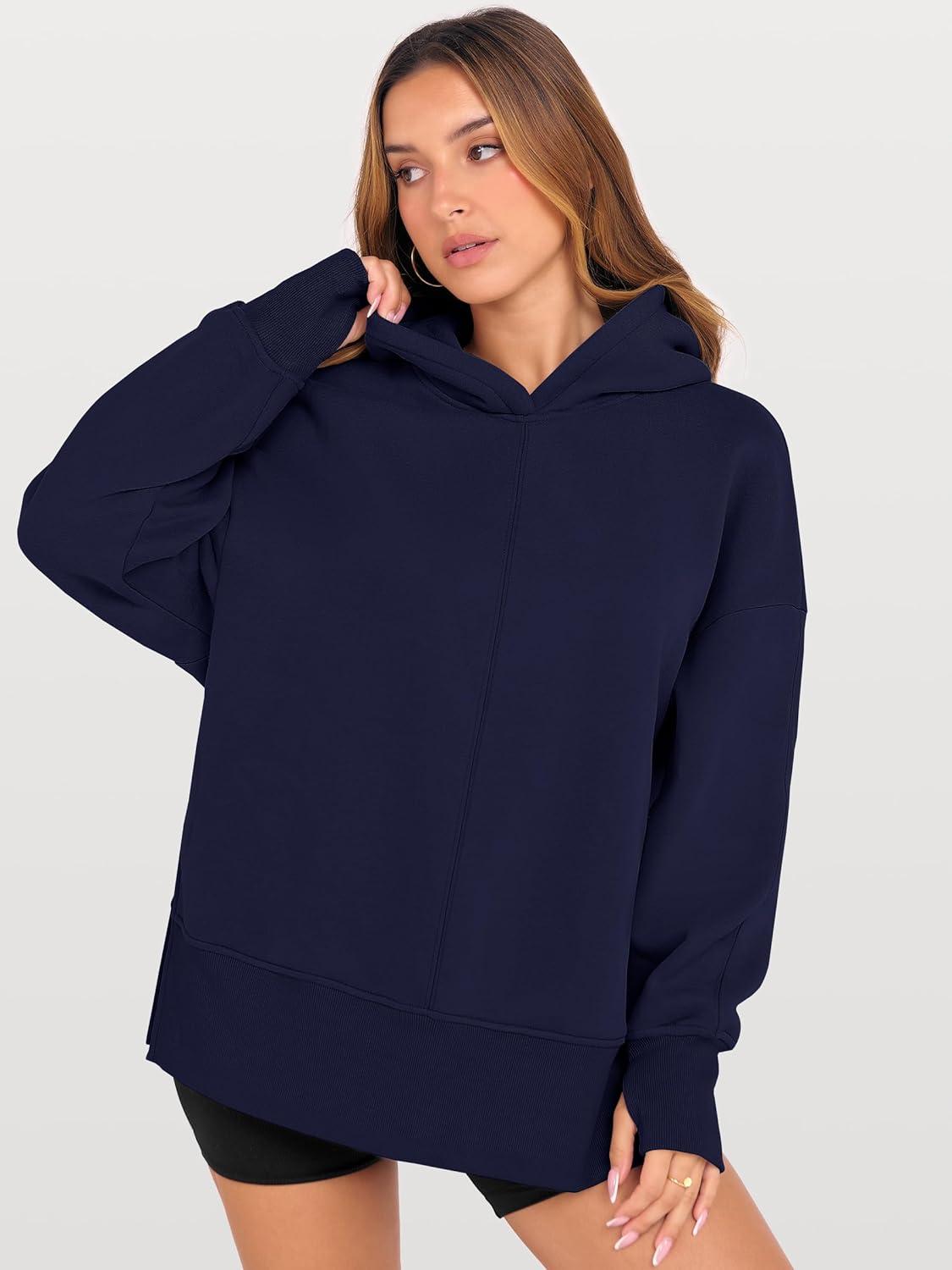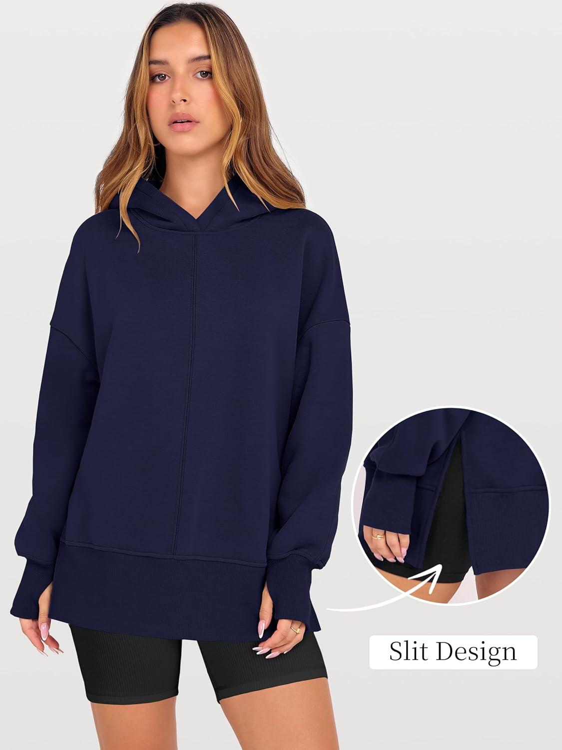 ANRABESS Womens Oversized Hoodies Long Sleeve Fleece Side Slit Hooded Sweatshirts Pullover 2026 Fall Outfits Y2K Clothes(Navy Blue)