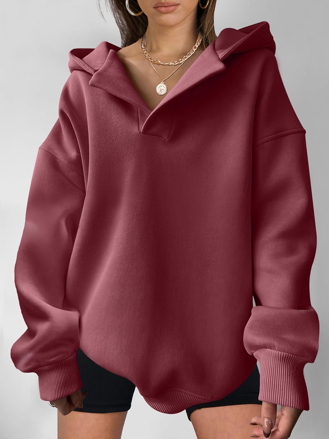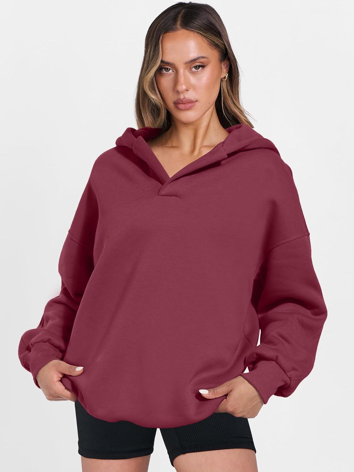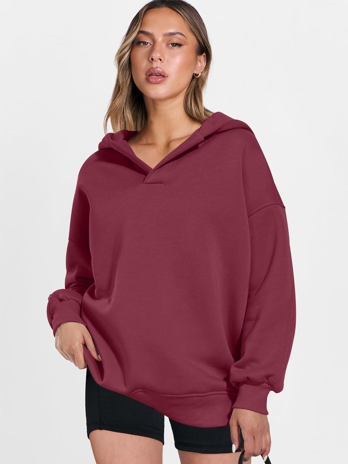 ANRABESS Womens Oversized Hoodies V Neck Sweatshirts Fleece Long Sleeve Pullover Y2K Clothes 2025 Fall Trendy Outfits(Dark Red)
